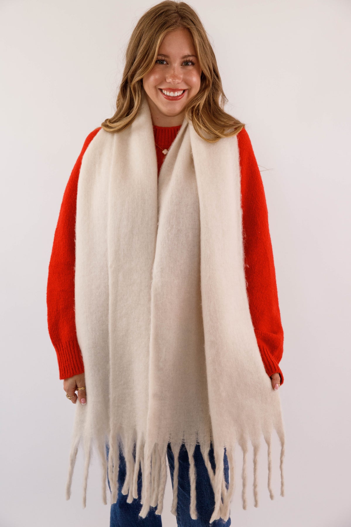 Elevate your everyday look with this luxuriously soft cream fringe scarf, a timeless accessory that brings warmth and sophistication to any outfit. Whether draped casually around your neck or styled as a wrap, this versatile piece transitions seamlessly from season to season. Crafted for comfort and designed to make a subtle statement, it's the perfect finishing touch that transforms your ensemble from ordinary to effortlessly chic.