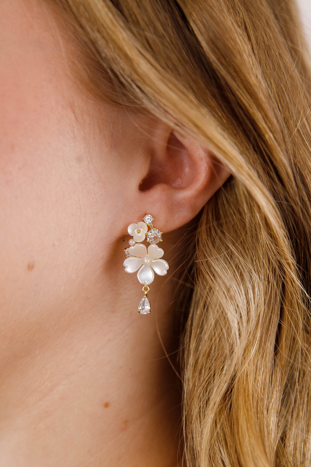 Elegant manmade pearl flower earrings that blend timeless sophistication with modern craftsmanship. Each pair features delicate pearl blooms that catch the light beautifully, making them perfect for both everyday elegance and special occasions. The lightweight design ensures all-day comfort, while the lustrous finish adds a touch of refined glamour to any outfit. A versatile accessory that celebrates the beauty of nature-inspired jewelry.