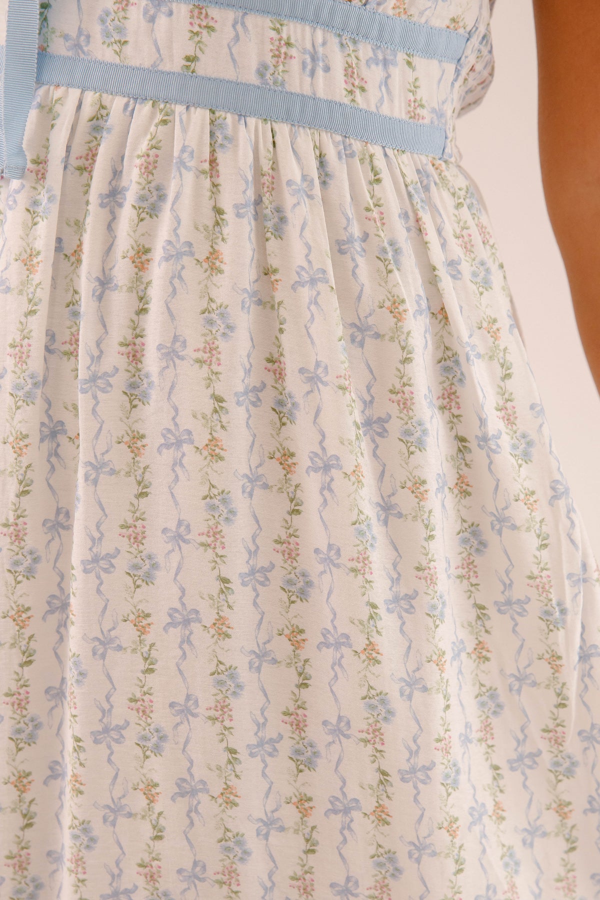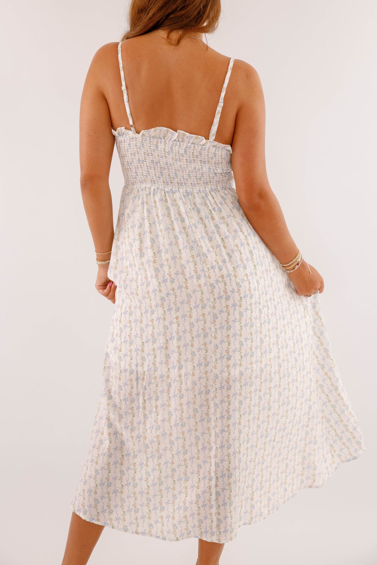 The Back To Reality Midi Dress in blue combines elegance with delicate details. It features a square neckline and subtle ruffle trim, complemented by adjustable spaghetti straps for a tailored fit. A contrast front tie detail enhances its refined silhouette, while the elastic back waist tunnel ensures comfort and shape. Finished with a charming blue floral bow pattern, this dress offers a sophisticated and feminine style perfect for any occasion!