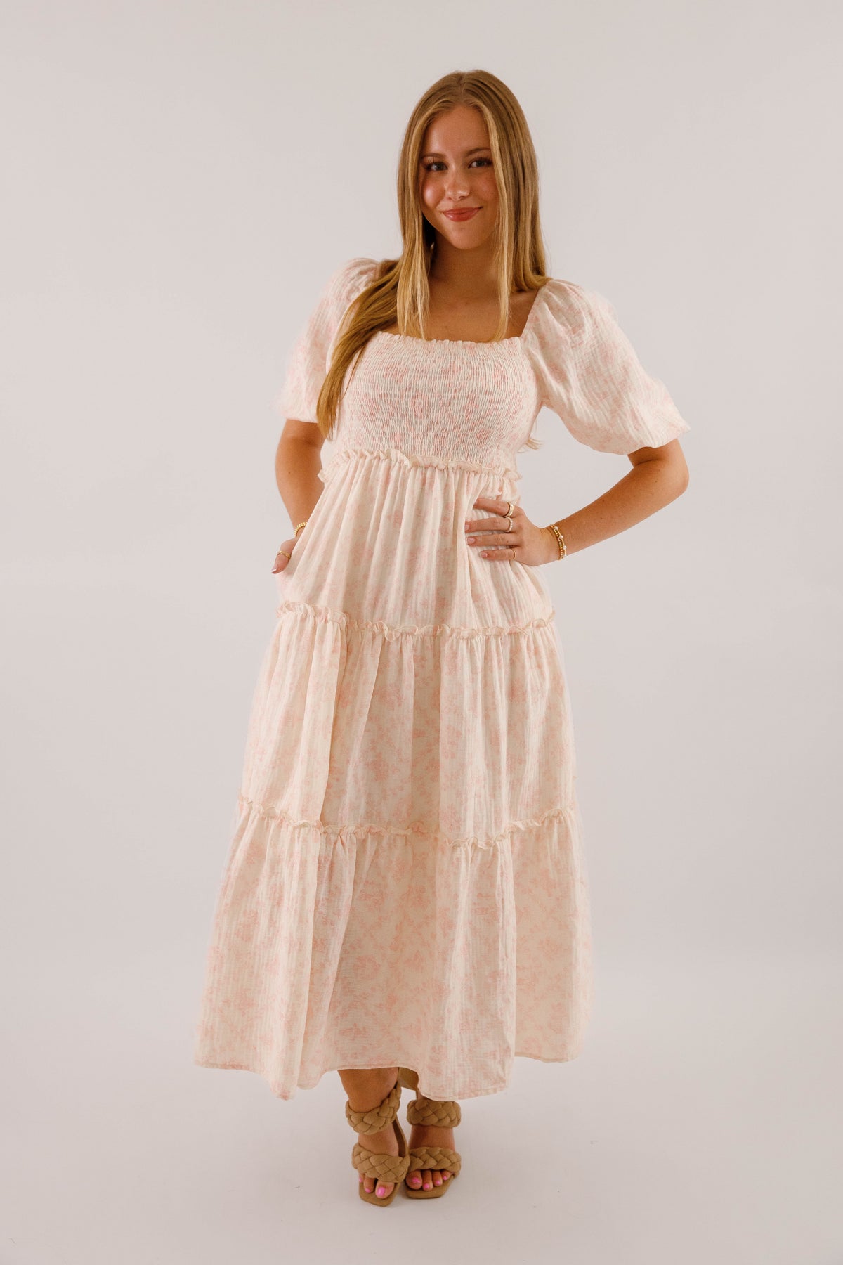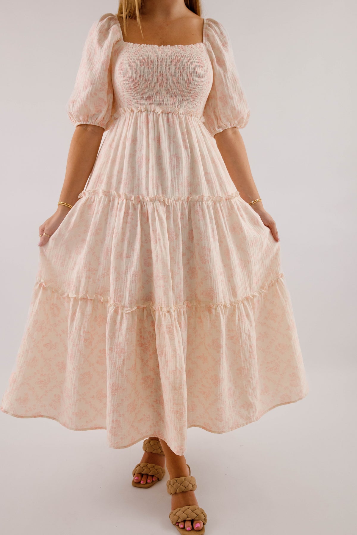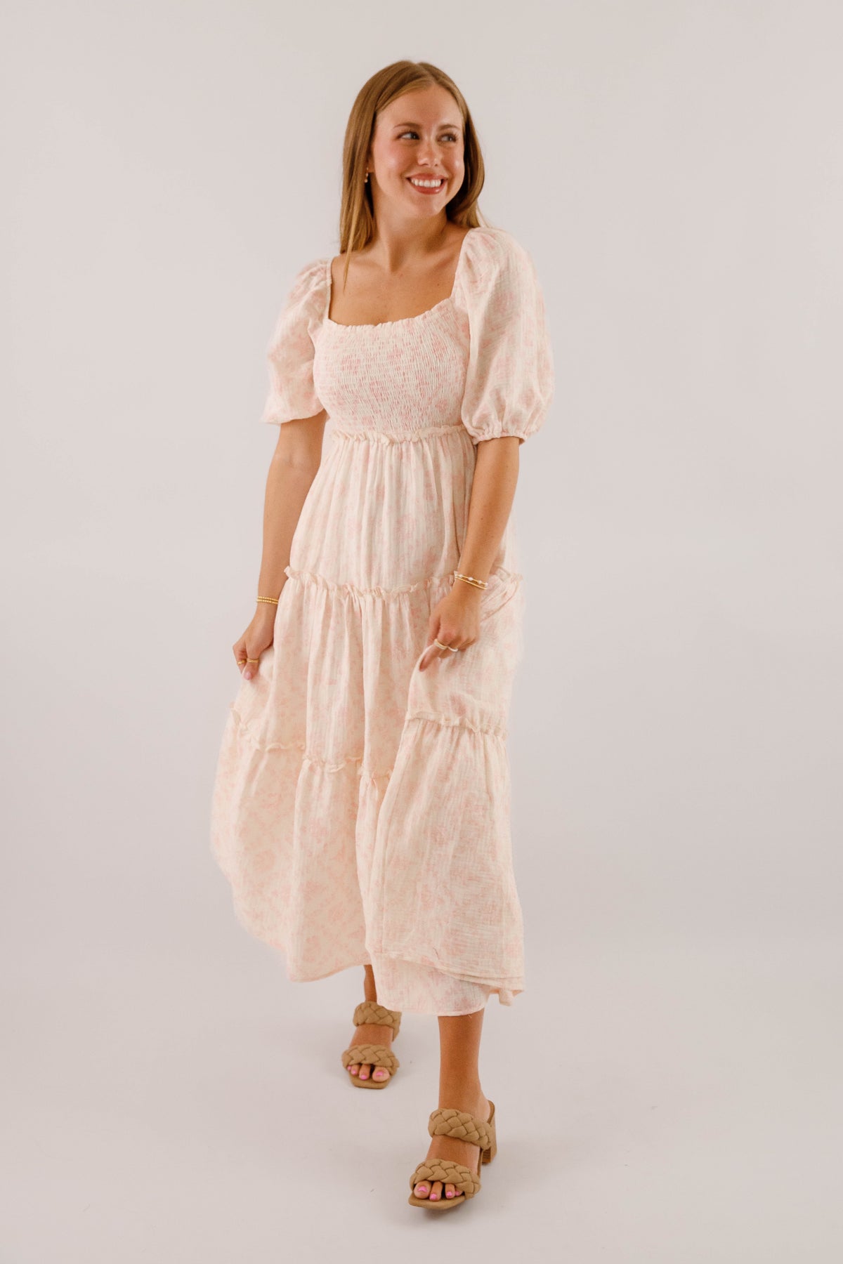 The In A Good Place Midi Dress brings a burst of playful charm with its soft pink floral print and lightweight cotton gauze fabric. Designed with a smocked chest and elastic-synched sleeves, it offers a snug yet breezy fit. Each tier features delicate ruffle detailing for a fun, flirty flair, and handy pockets add a touch of everyday practicality. Perfect for lively days and happy moments!