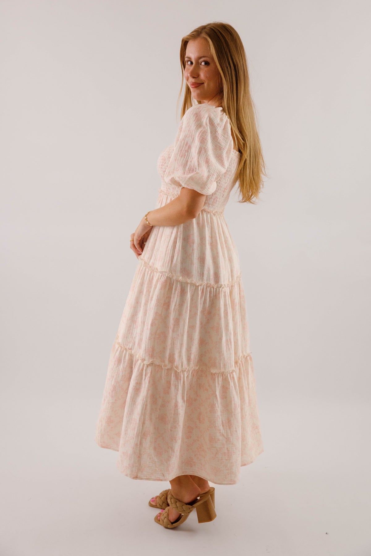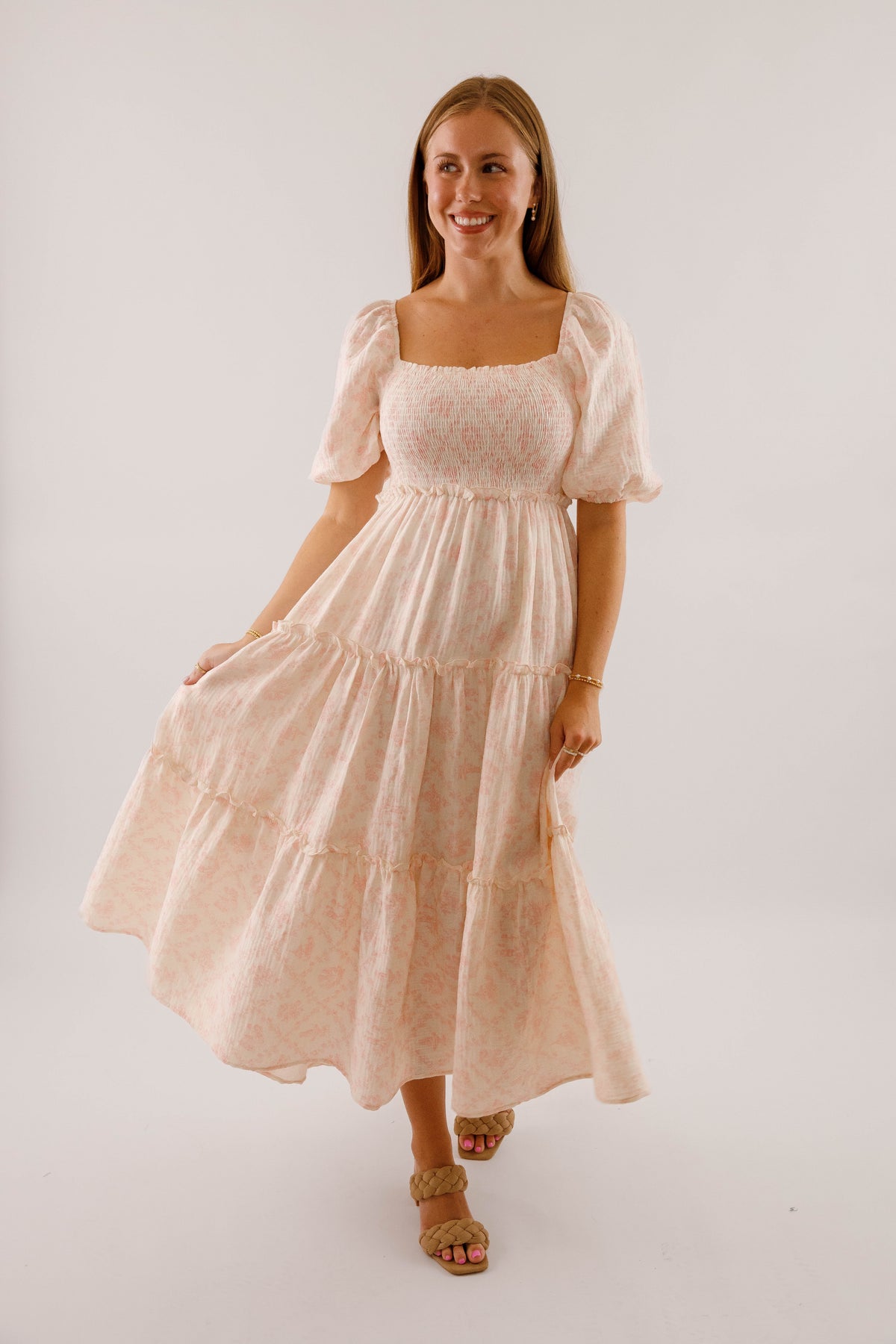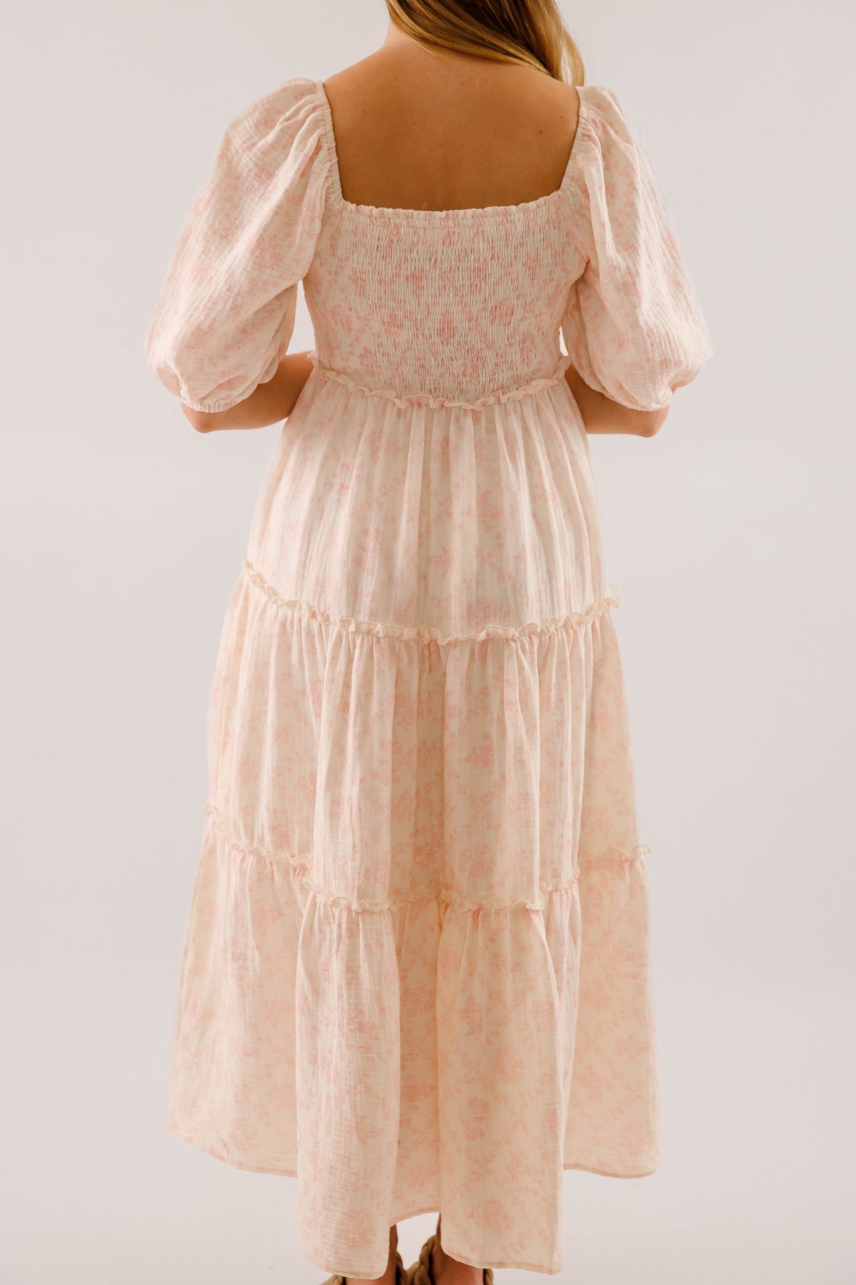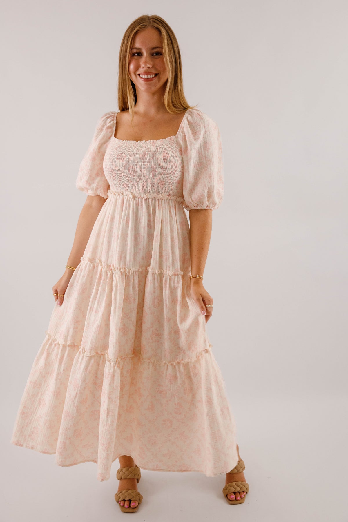 The In A Good Place Midi Dress brings a burst of playful charm with its soft pink floral print and lightweight cotton gauze fabric. Designed with a smocked chest and elastic-synched sleeves, it offers a snug yet breezy fit. Each tier features delicate ruffle detailing for a fun, flirty flair, and handy pockets add a touch of everyday practicality. Perfect for lively days and happy moments!