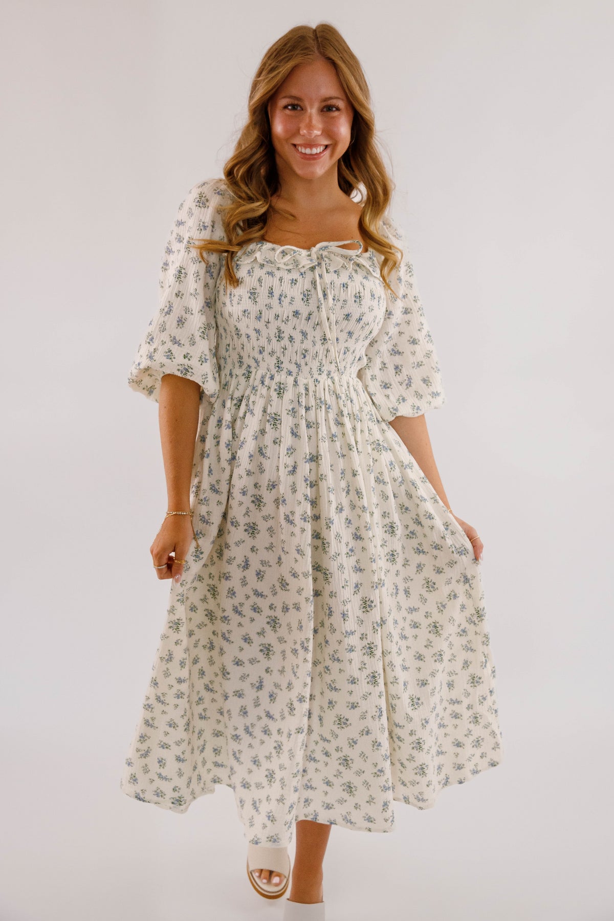 The Insist On Knowing Midi Dress offers a perfect blend of style and comfort. Its three-quarter sleeves cinch elegantly at the forearms, while delicate ruffles line the neckline for a soft, feminine touch. The smocked bodice provides a flattering, comfortable fit, and the A-line skirt enhances every silhouette with a modest, graceful length. A decorative ribbon completes the look, adding a whimsical charm that makes this dress a standout choice for any occasion!