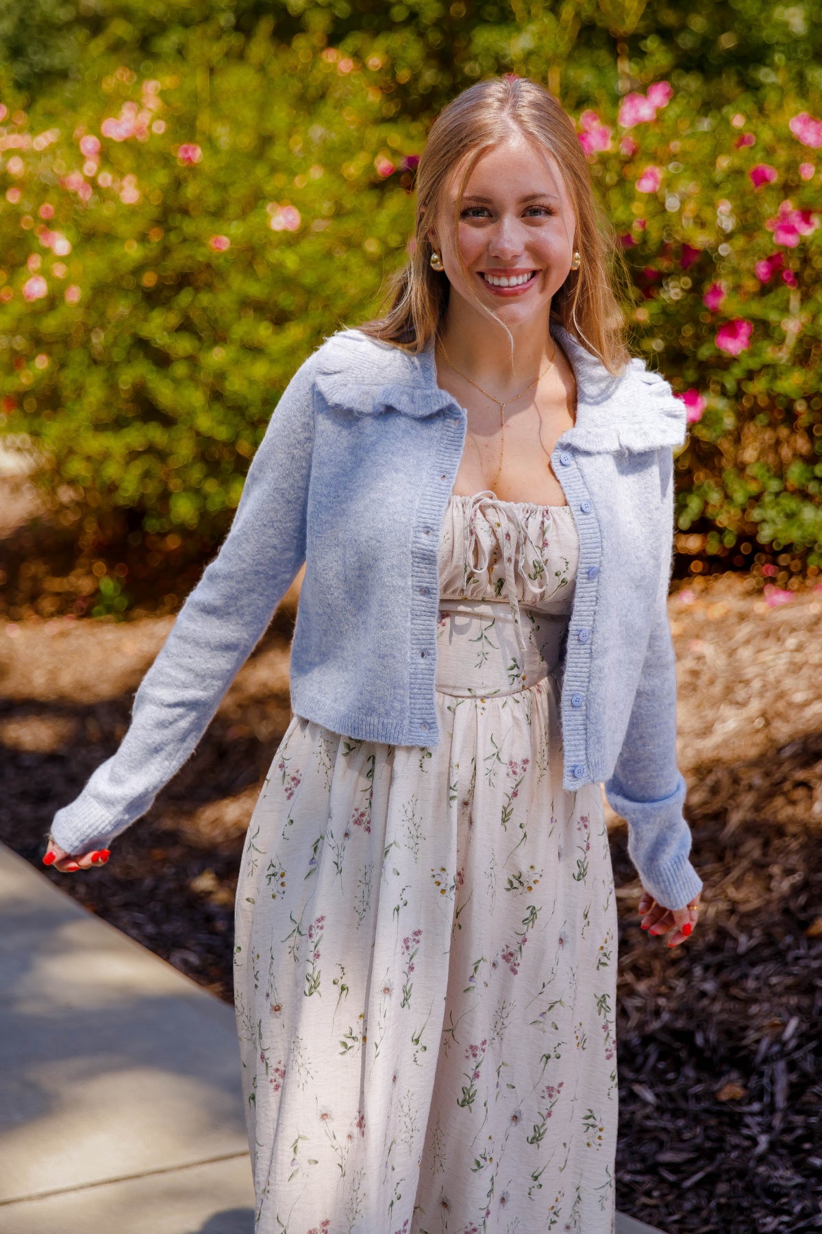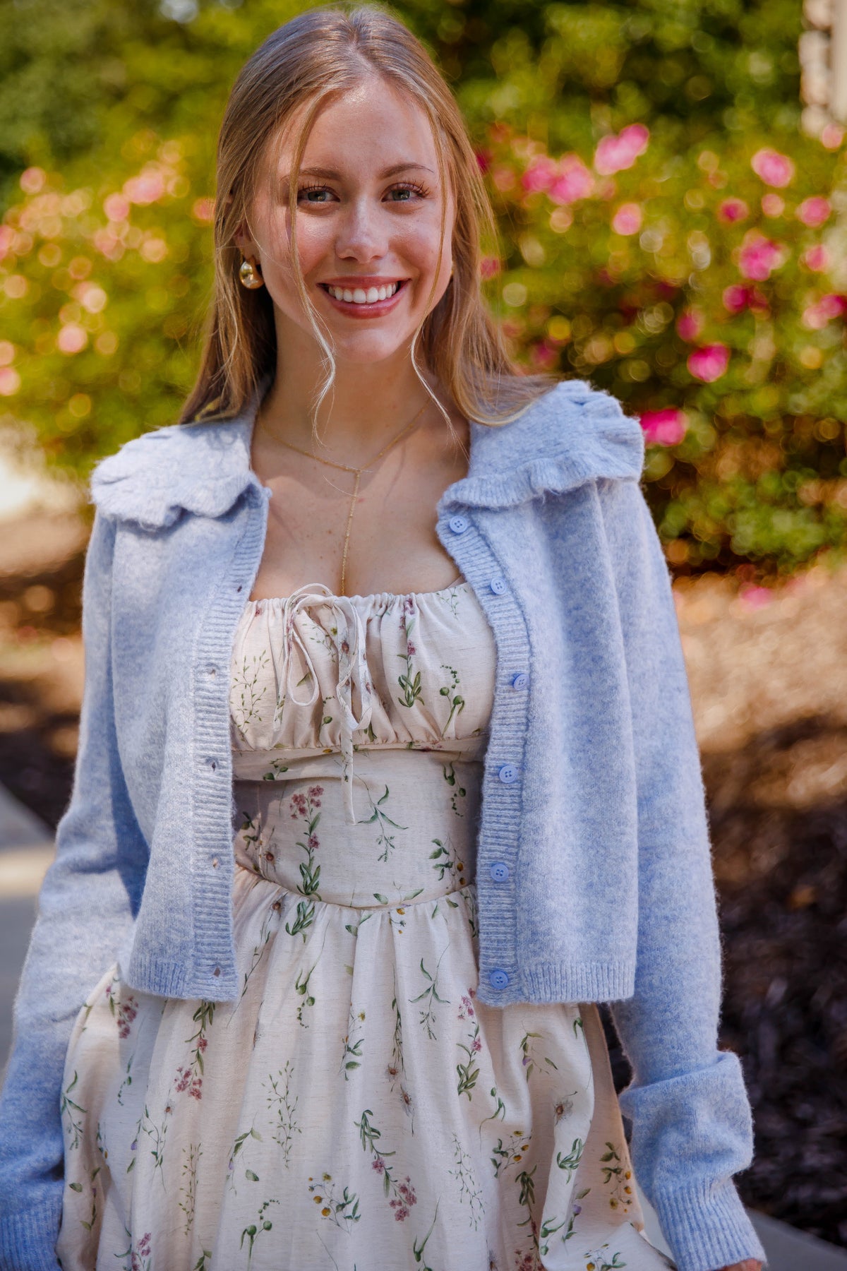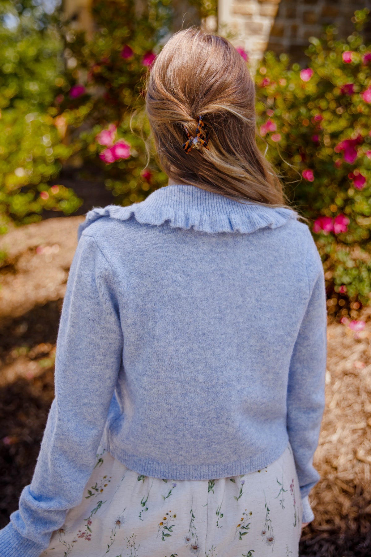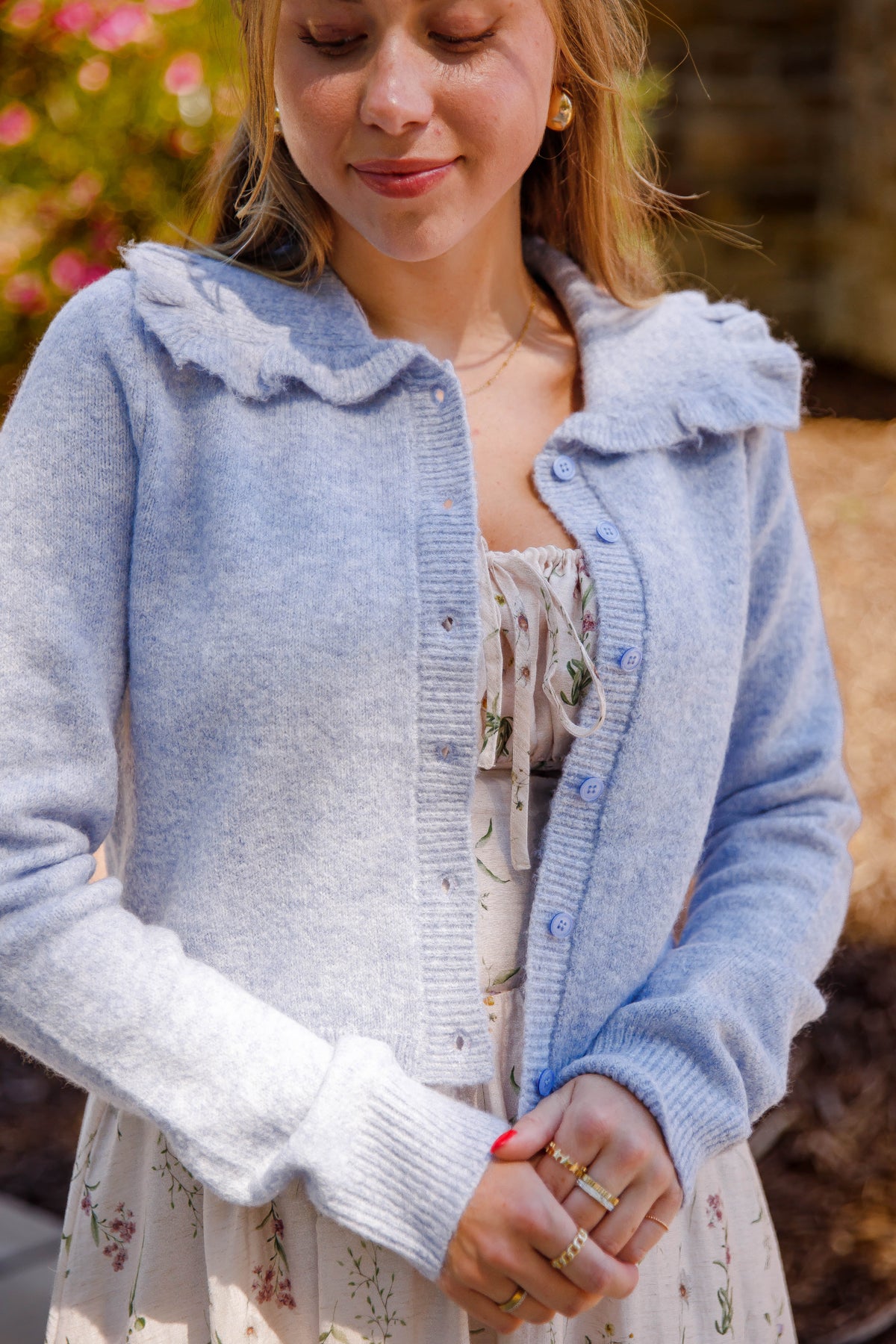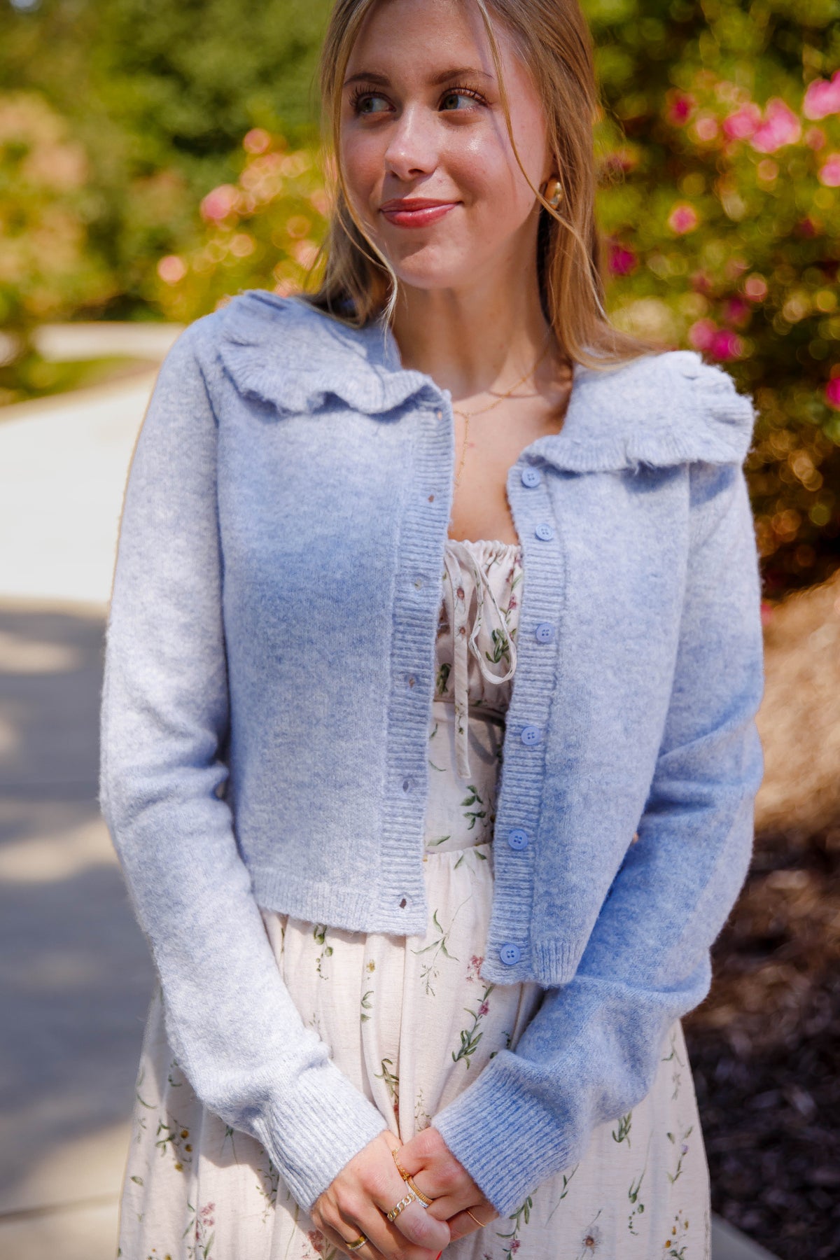 Elevate your everyday style with the Frills and Thrills Cardigan in Baby Blue. This cozy knit sweater features charming ruffled detail along the collar and a convenient button-down front, adding a delicate touch to your look. Its long sleeves provide warmth and comfort, making it perfect for layering on cooler days. Whether dressed up or down, this cardigan blends softness with subtle elegance to keep you both stylish and snug.