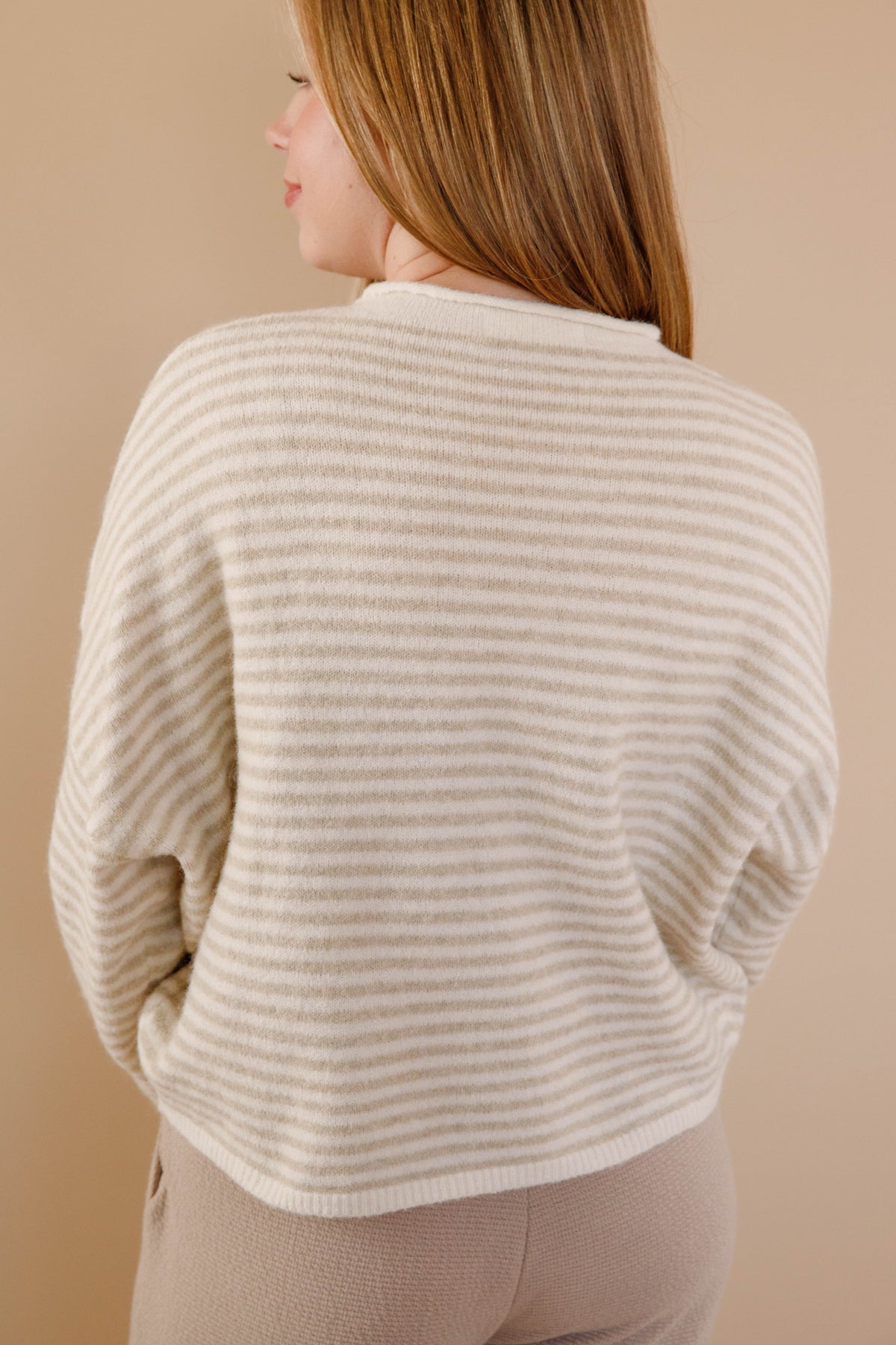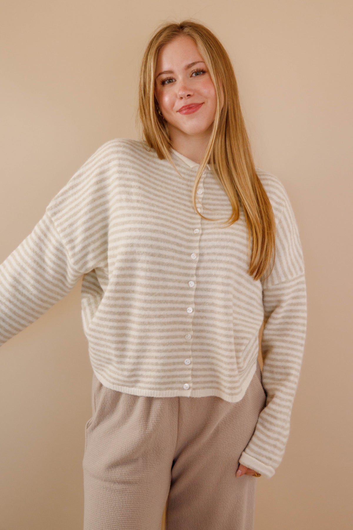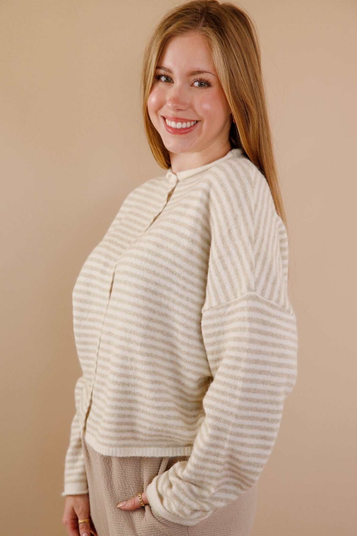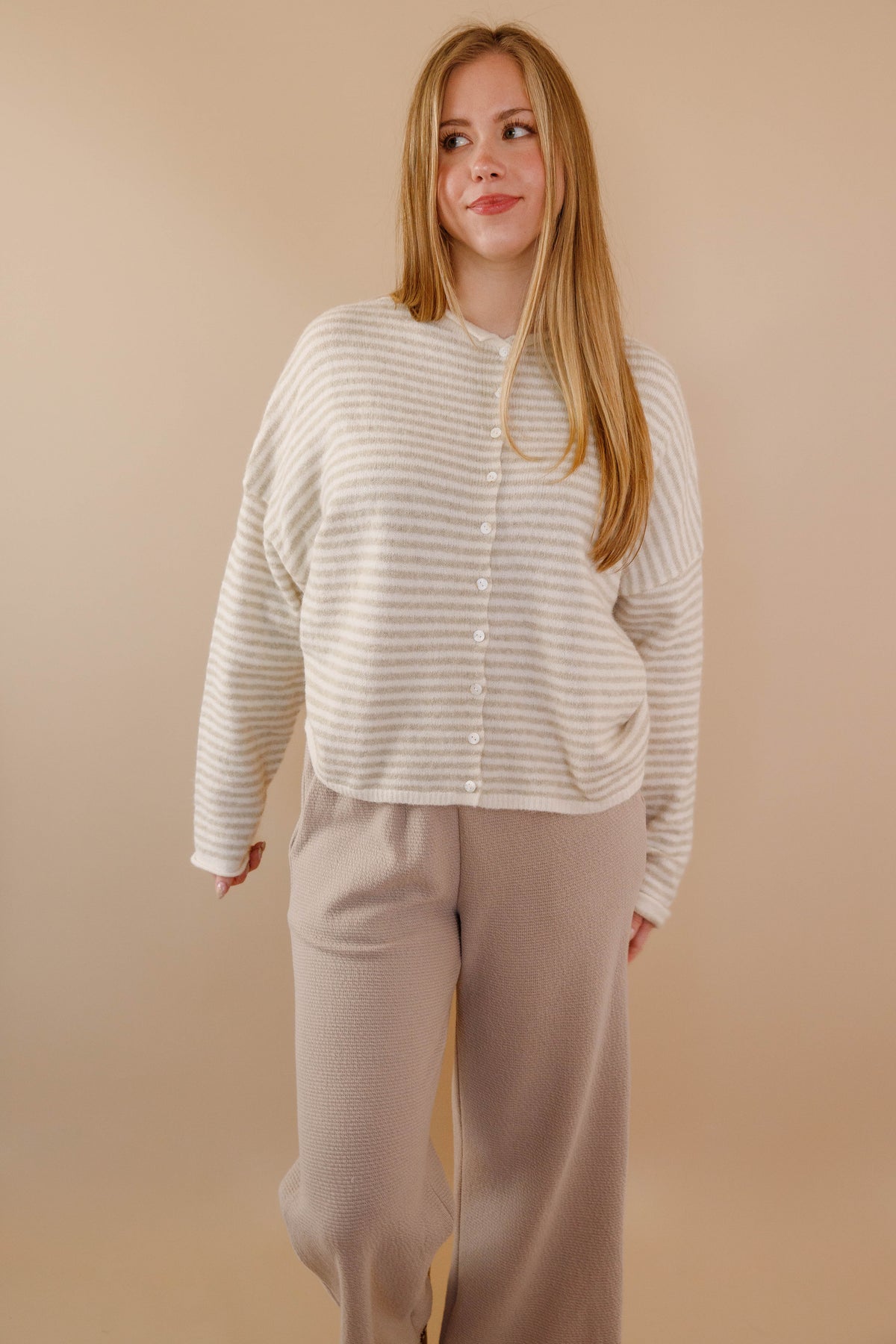 Throw this on with literally everything and watch it become your new closet obsession! Soft as a cloud in crisp white and taupe stripes, this cardigan delivers that effortless coastal cool-girl vibe we're all chasing. The gorgeous slouch fit pairs perfectly with rolled collar and cuffs, while pearly white buttons add just the right touch of polish. Whether you're dressing up your basics or elevating a casual look, this is the piece that makes every outfit feel intentional and undeniably chic!