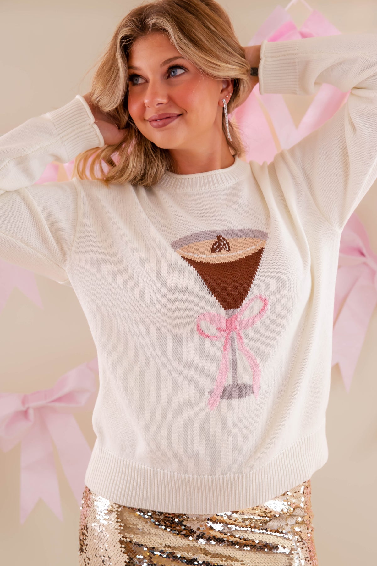 Cozy up in style with this cheeky knitted sweater that pairs the sophisticated allure of an espresso martini with an adorable pink bow accent. Perfect for coffee lovers and fashion enthusiasts alike, this piece brings a touch of cocktail-hour charm to your everyday wardrobe. The soft knit fabric keeps you warm while the playful design sparks conversation. Whether you're heading to brunch or a casual night out, this sweater proves that five o'clock is always somewhere—and it looks fabulous on you.