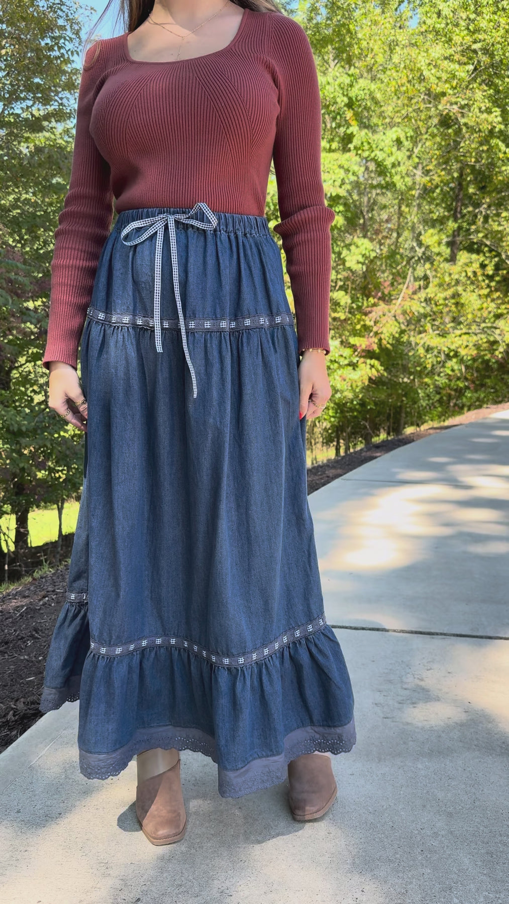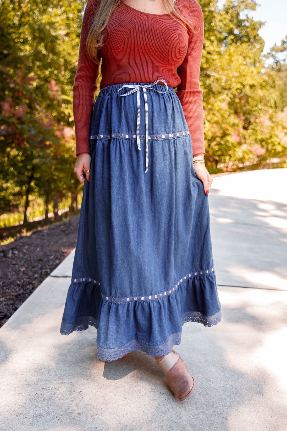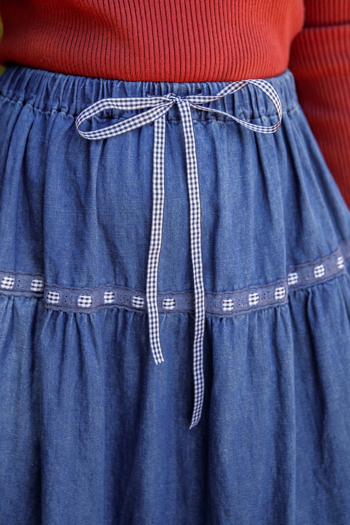 Elevate your style with the Just A Dream Denim Maxi Skirt, featuring delicate ribbon details and an elastic waist accented by a chic black and white gingham ribbon tie for a perfect fit. The scalloped lace hemline adds a touch of femininity, making this skirt a versatile piece for effortless, standout looks.