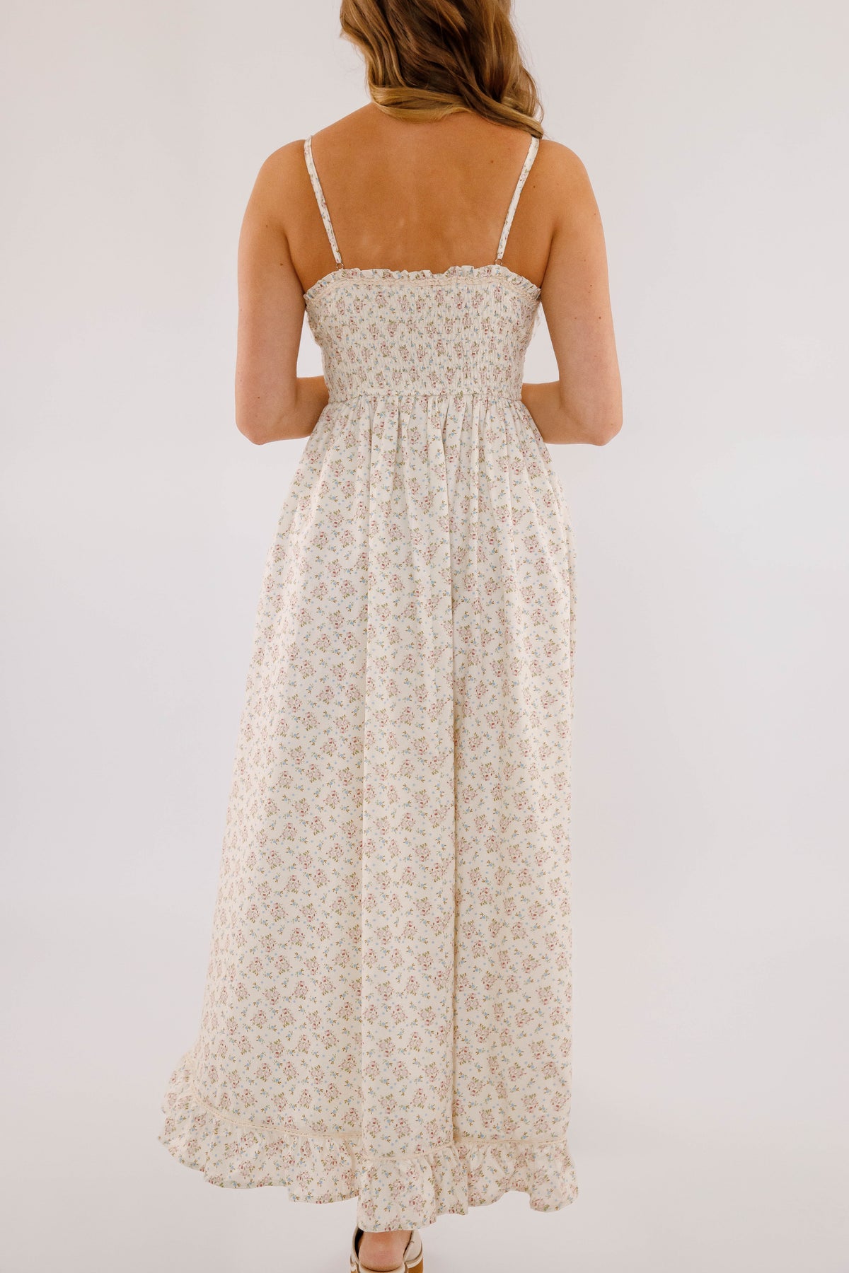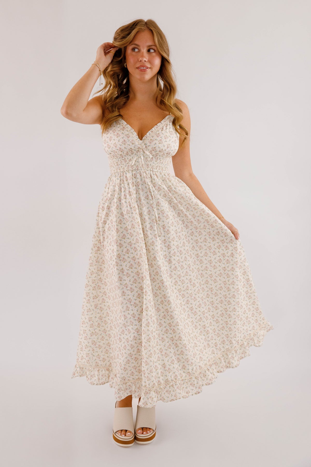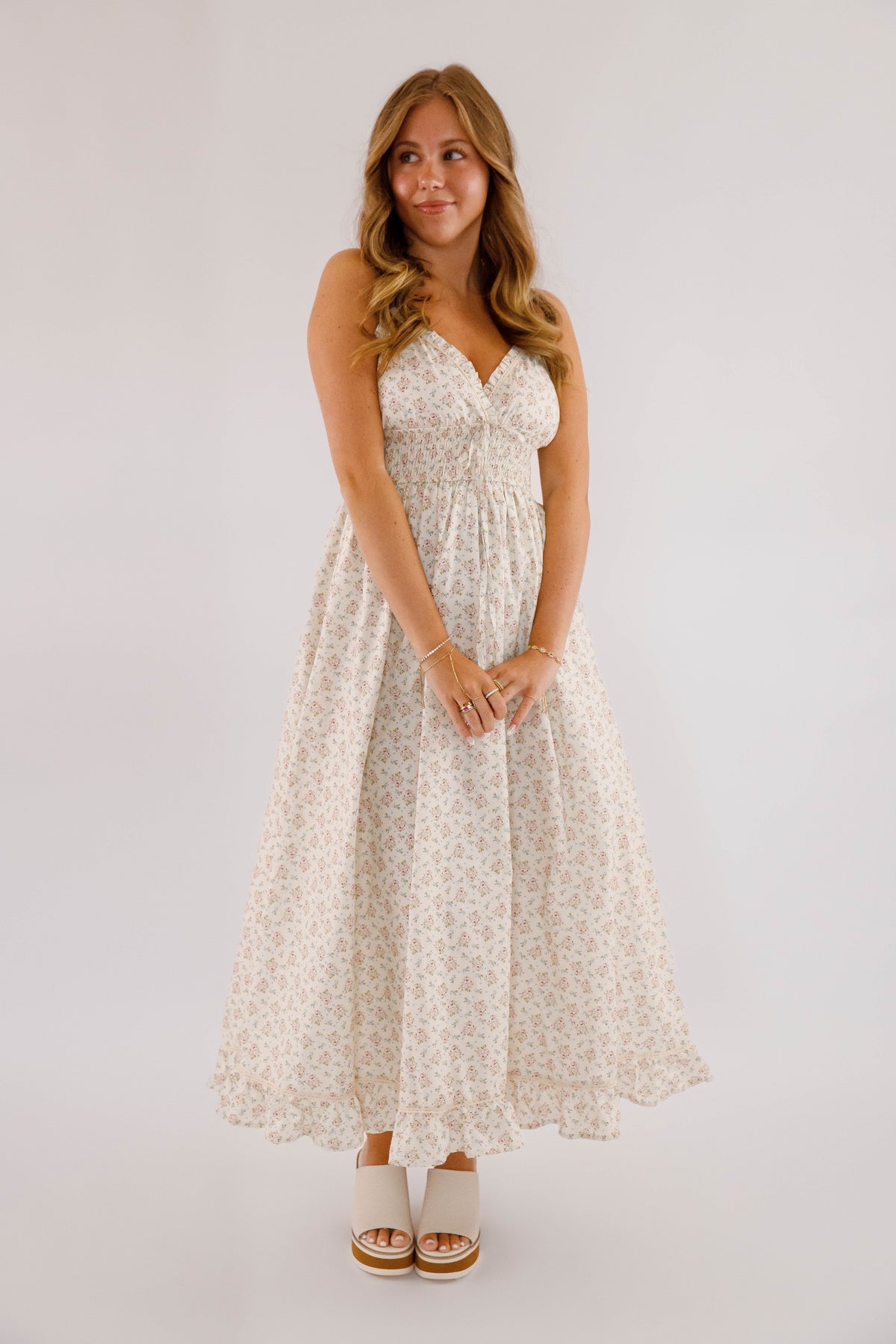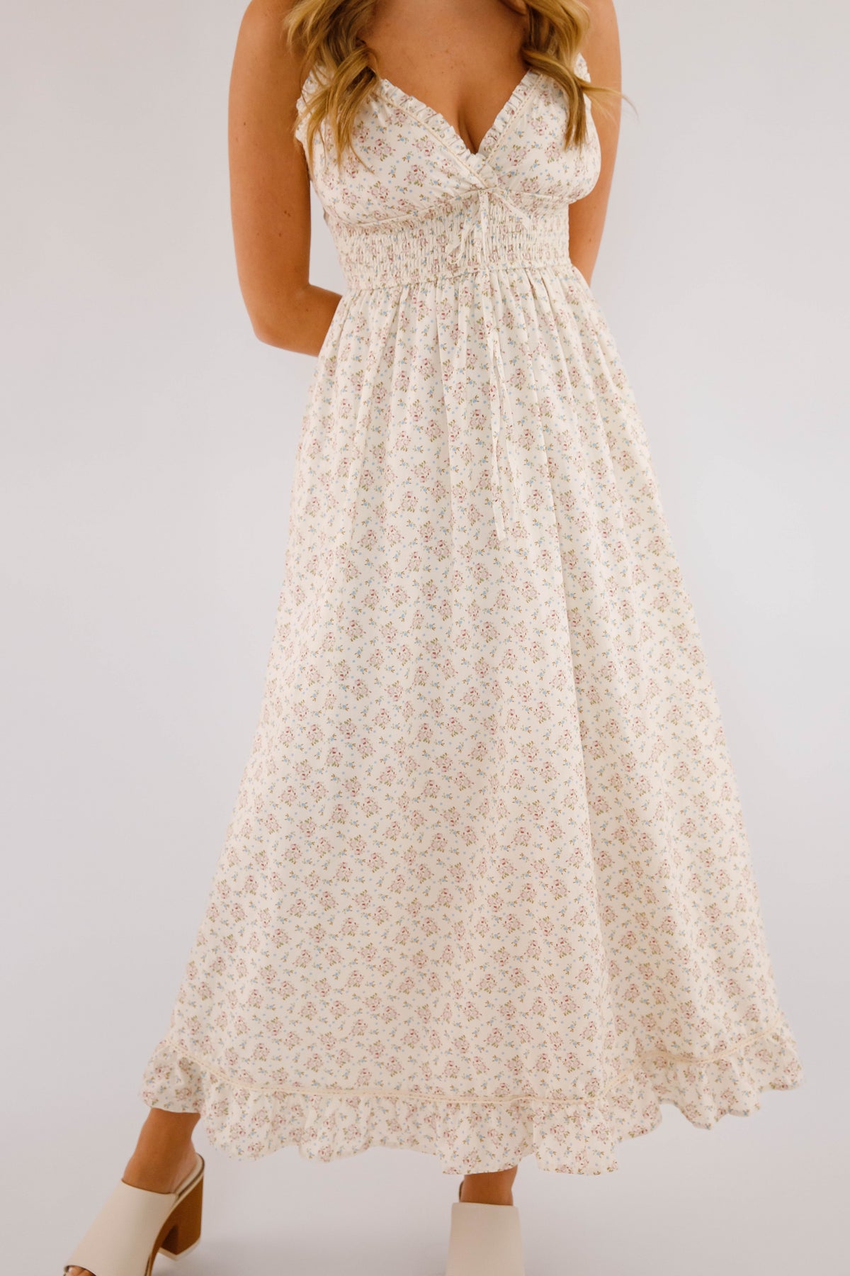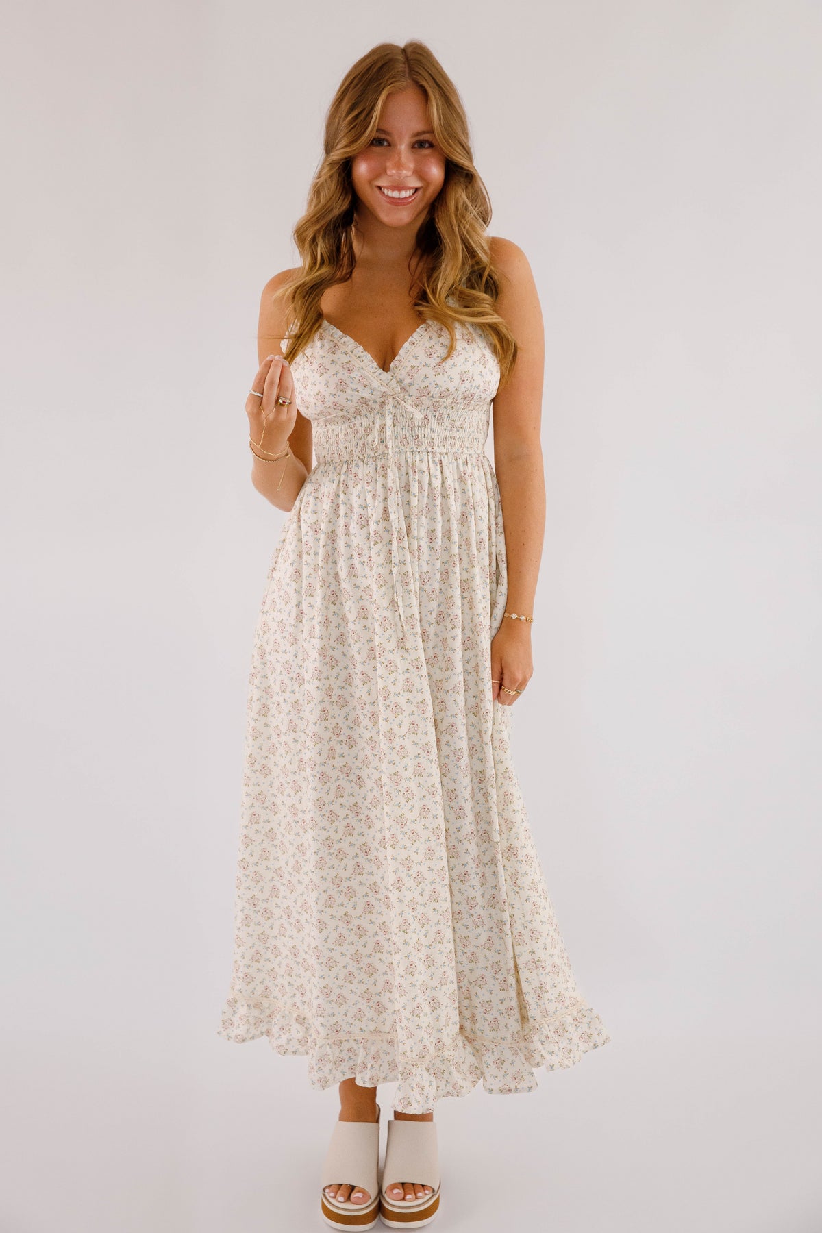 Embrace effortless elegance with the Along The Way Maxi Dress! Featuring a playful ditsy floral print, adjustable spaghetti straps, and a smocked bust for a comfortable, flattering fit. The ruffle bustline and hem add a feminine touch, while the front bow trim detail enhances its charming appeal. Perfect for any occasion, this midi dress combines style and comfort seamlessly!