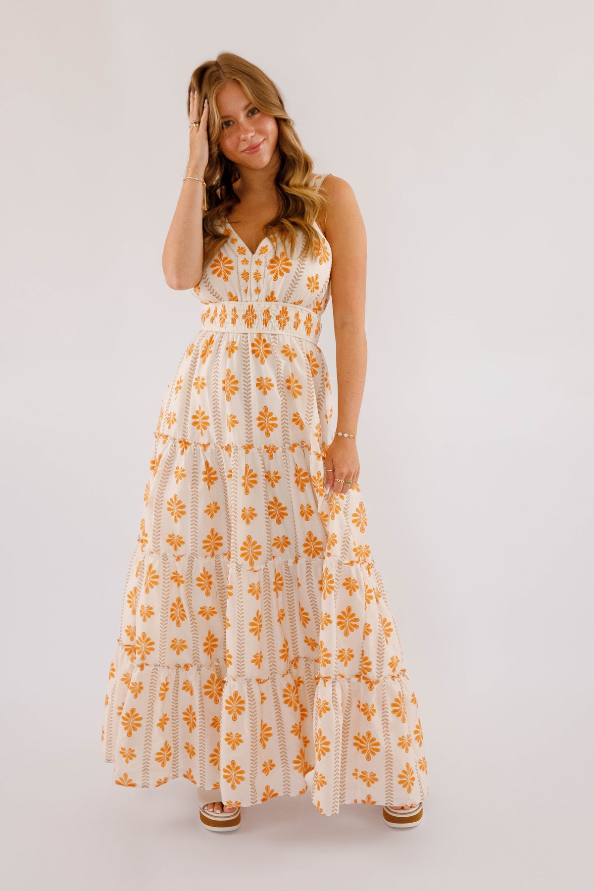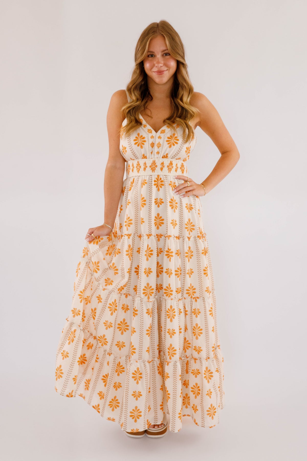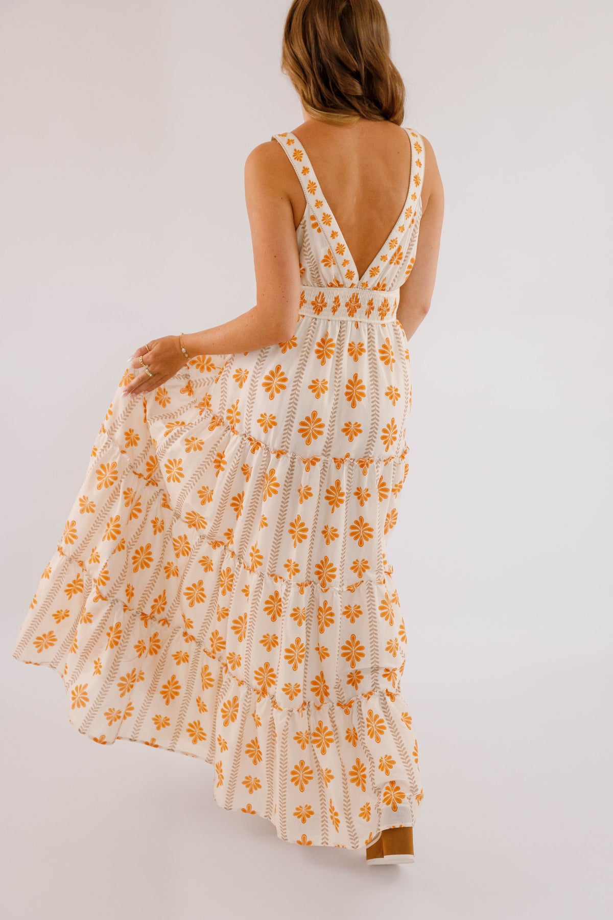 The Easy To Spot Maxi Dress is designed to highlight your natural elegance with a V-neckline and a smocked waistband that flatters your figure. Its tiered skirt, accented with ruffled edges, offers a graceful flow perfect for any occasion. Whether you're enjoying a resort dinner or a sunlit celebration, this floral printed woven maxi dress effortlessly radiates romance and style!