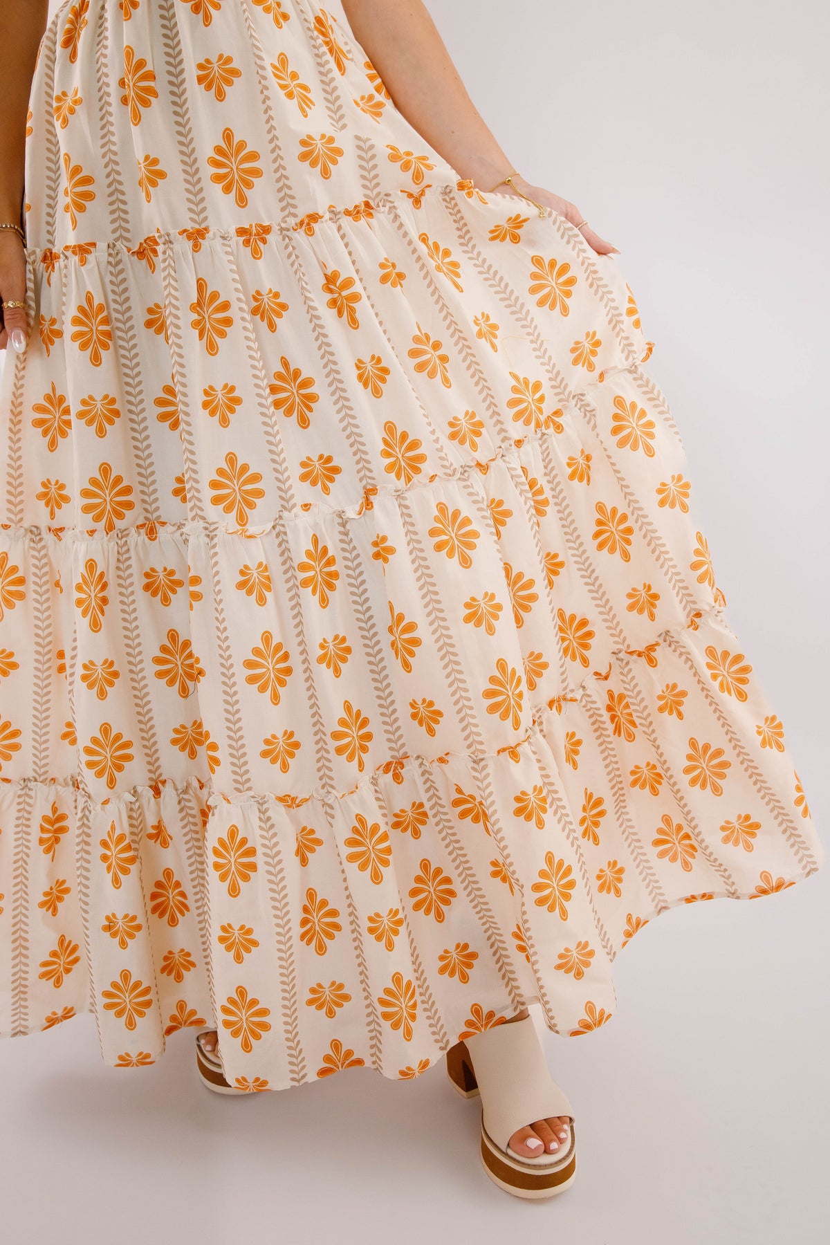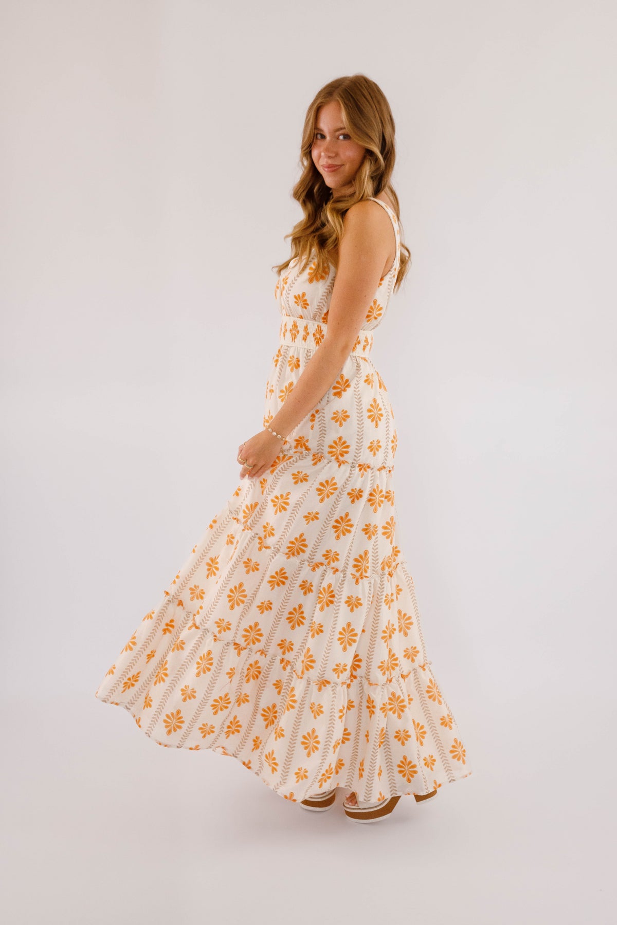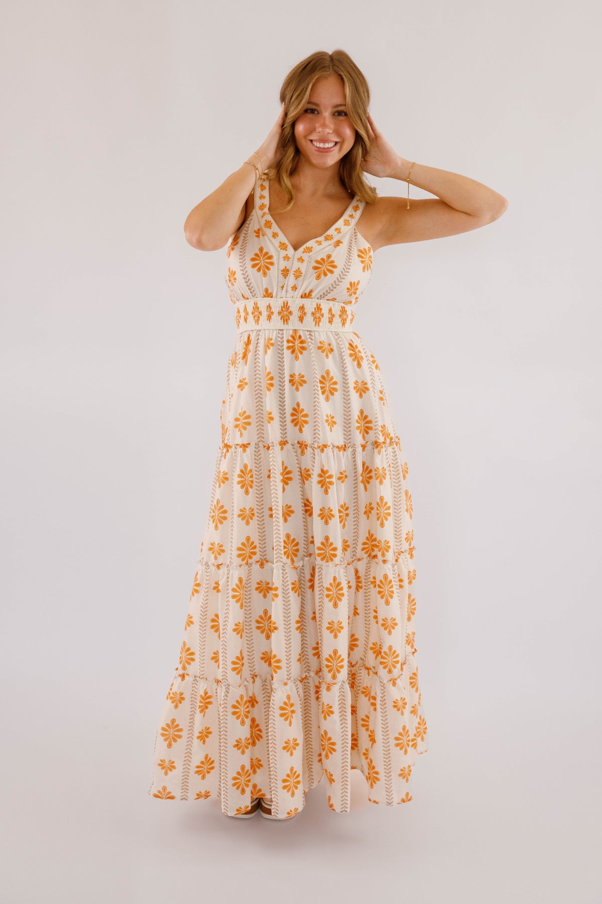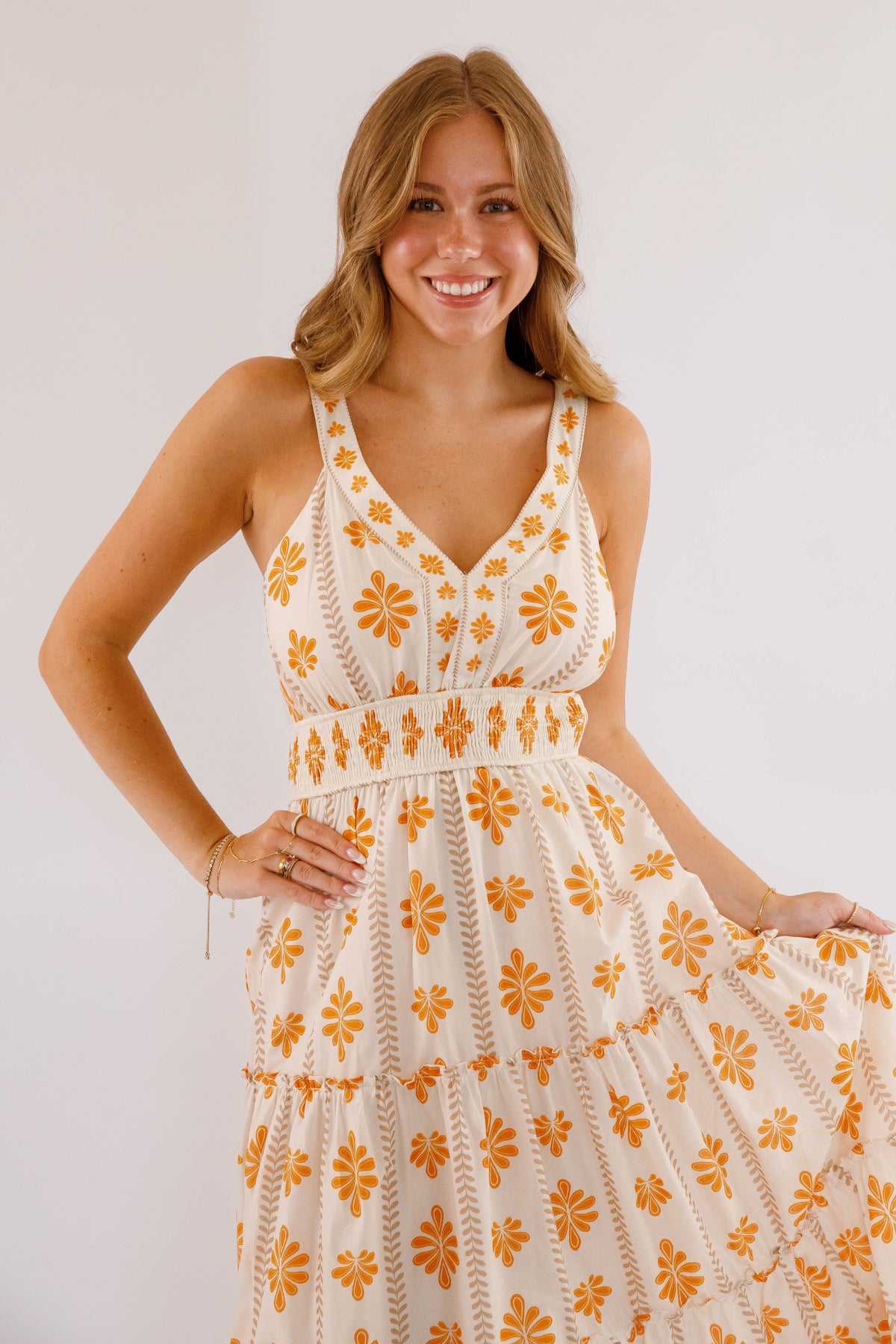 The Easy To Spot Maxi Dress is designed to highlight your natural elegance with a V-neckline and a smocked waistband that flatters your figure. Its tiered skirt, accented with ruffled edges, offers a graceful flow perfect for any occasion. Whether you're enjoying a resort dinner or a sunlit celebration, this floral printed woven maxi dress effortlessly radiates romance and style!