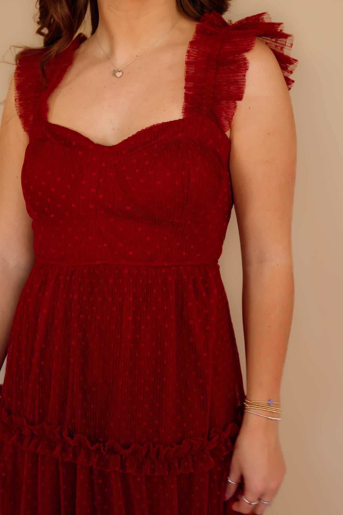 Discover the dress that transforms any occasion into something memorable! This wine swiss dot midi dress combines timeless elegance with modern details that truly stand out. The sweetheart neckline creates an instantly flattering frame, while elastic ruffle straps add playful sophistication. Tiered ruffles cascade down the skirt for graceful movement and visual interest, and the back smocking ensures a personalized, comfortable fit that adapts to your body. From casual gatherings to special celebrations, this versatile piece is the answer to looking polished and put-together effortlessly!
