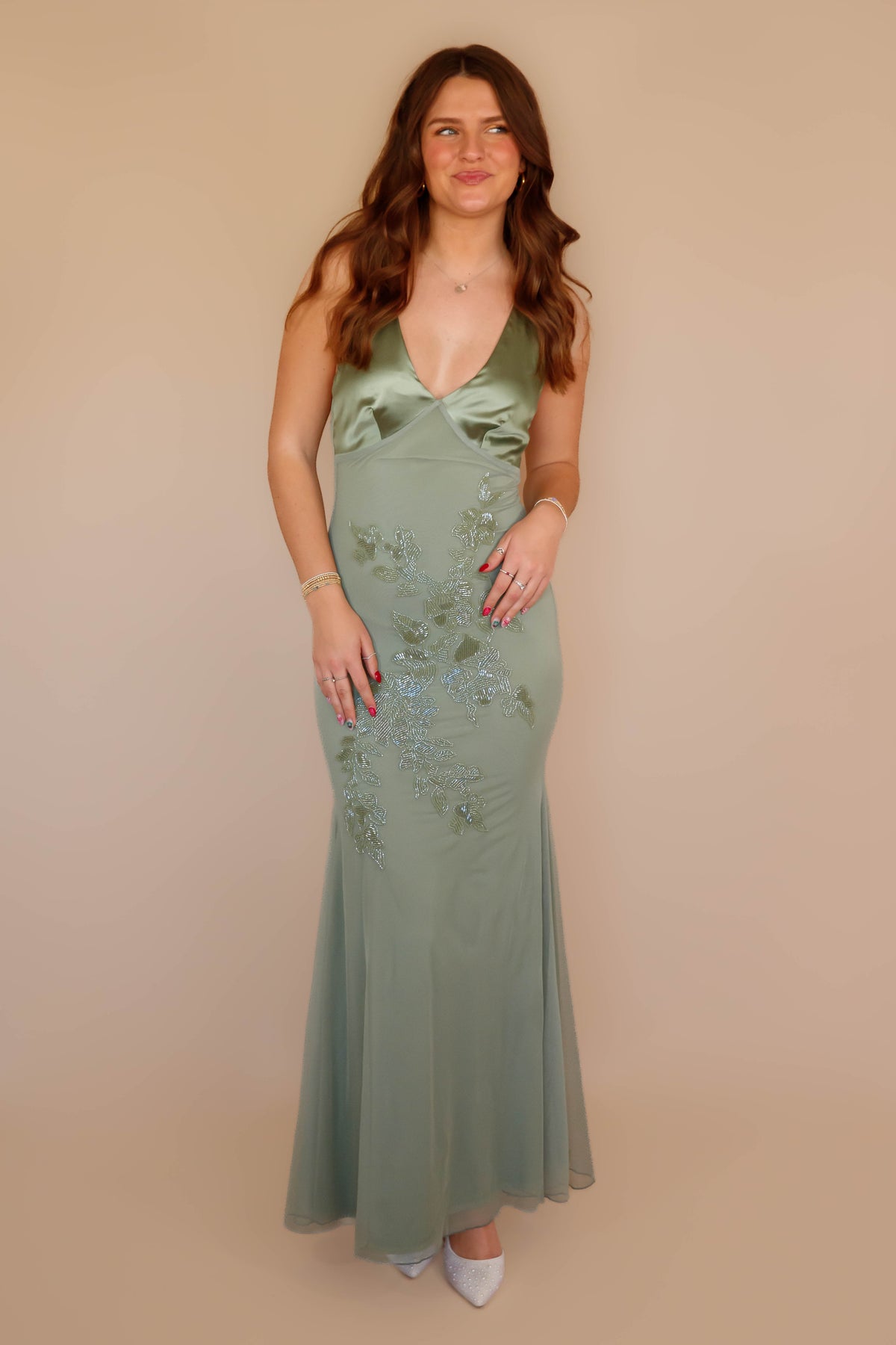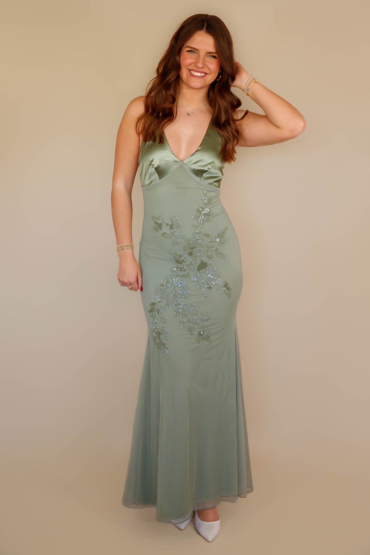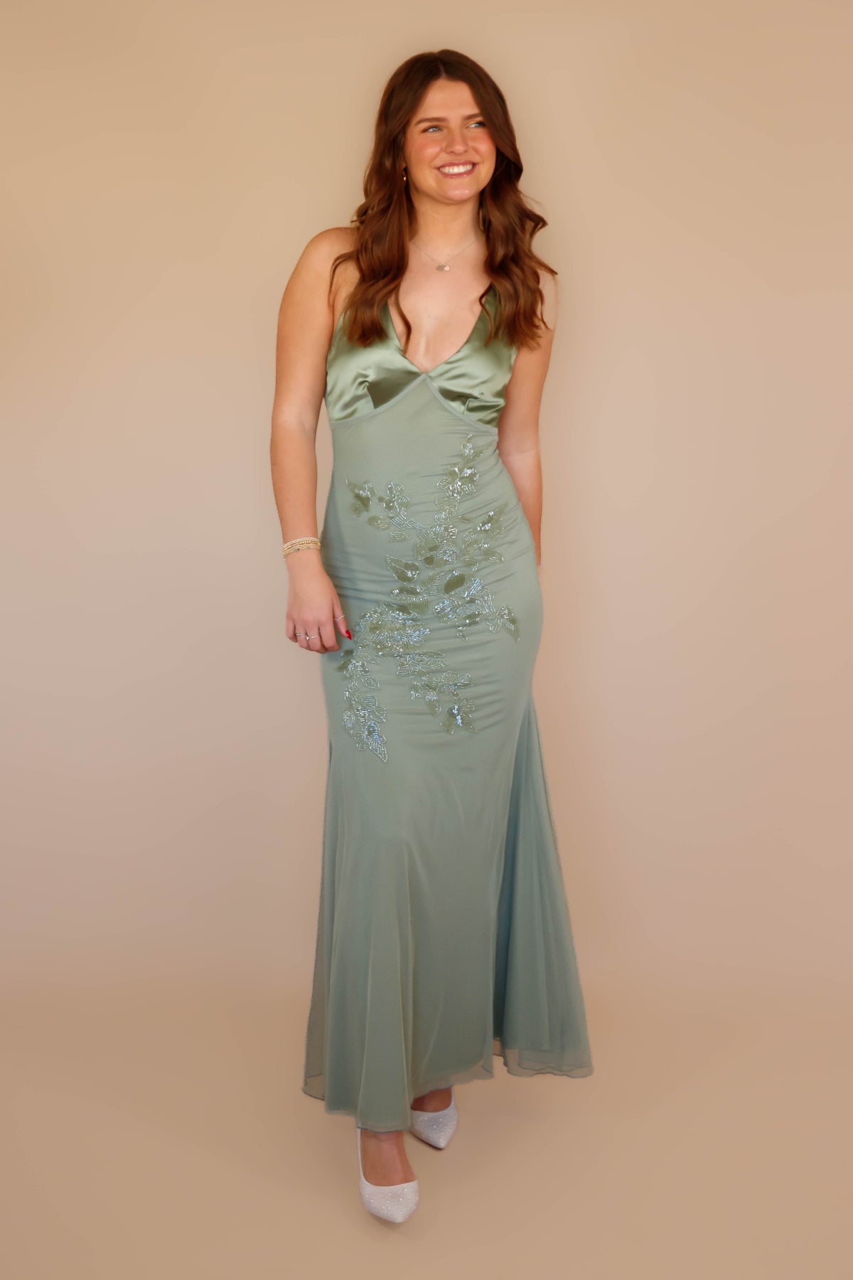 Experience pure elegance in this breathtaking maxi dress, crafted for those who dare to shine! The dramatic plunging neckline and open back create an unforgettable impression, while supportive spaghetti straps ensure comfort throughout the night. A precisely fitted waist accentuates your silhouette beautifully, and an exquisite diagonal arrangement of white floral appliques cascades gracefully across the lower skirt, adding romantic allure. Whether you're attending a wedding, gala, or formal celebration, this dress delivers the sophisticated glamour and feminine charm that makes you feel absolutely radiant!