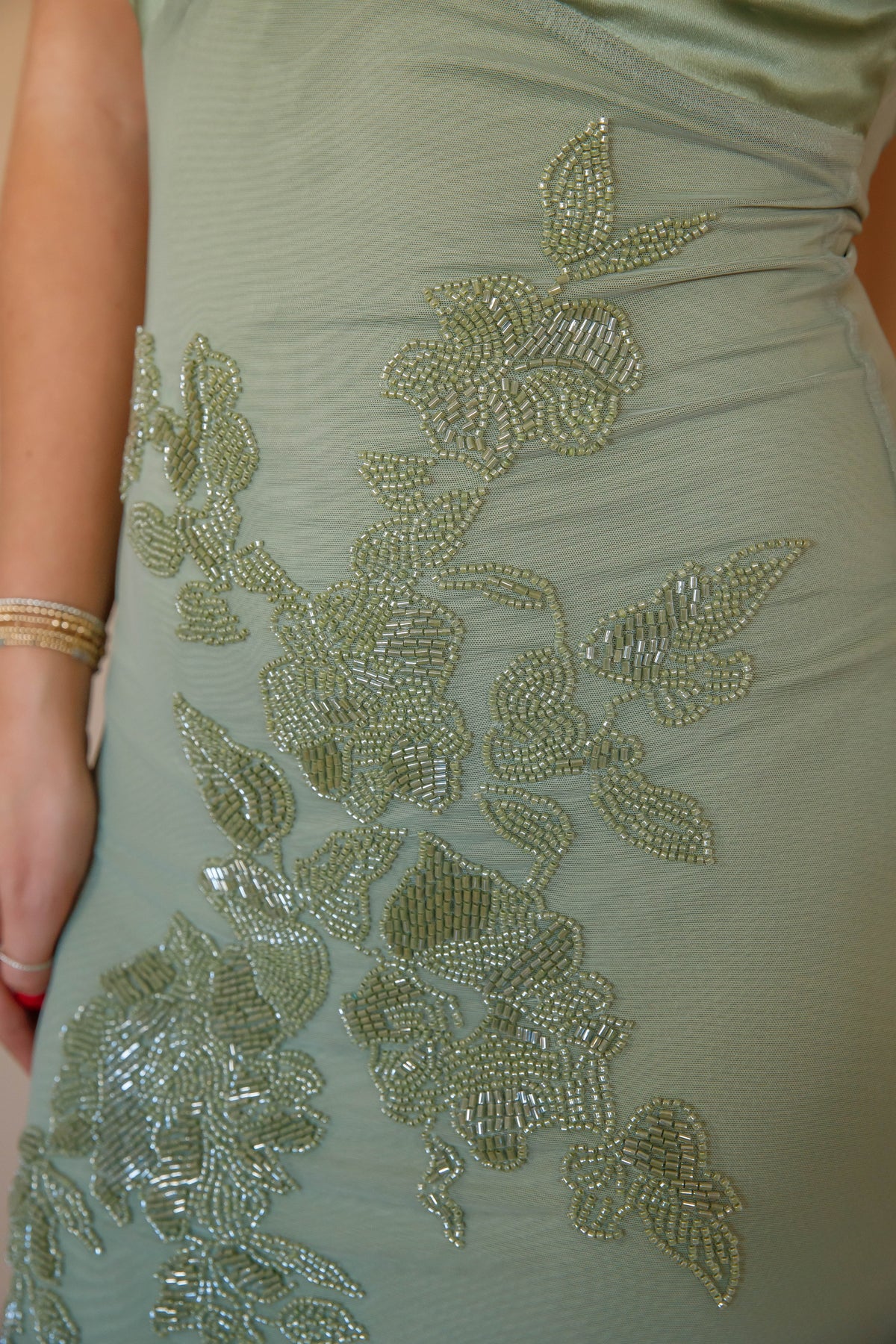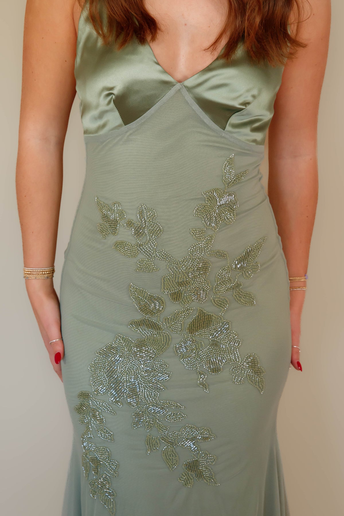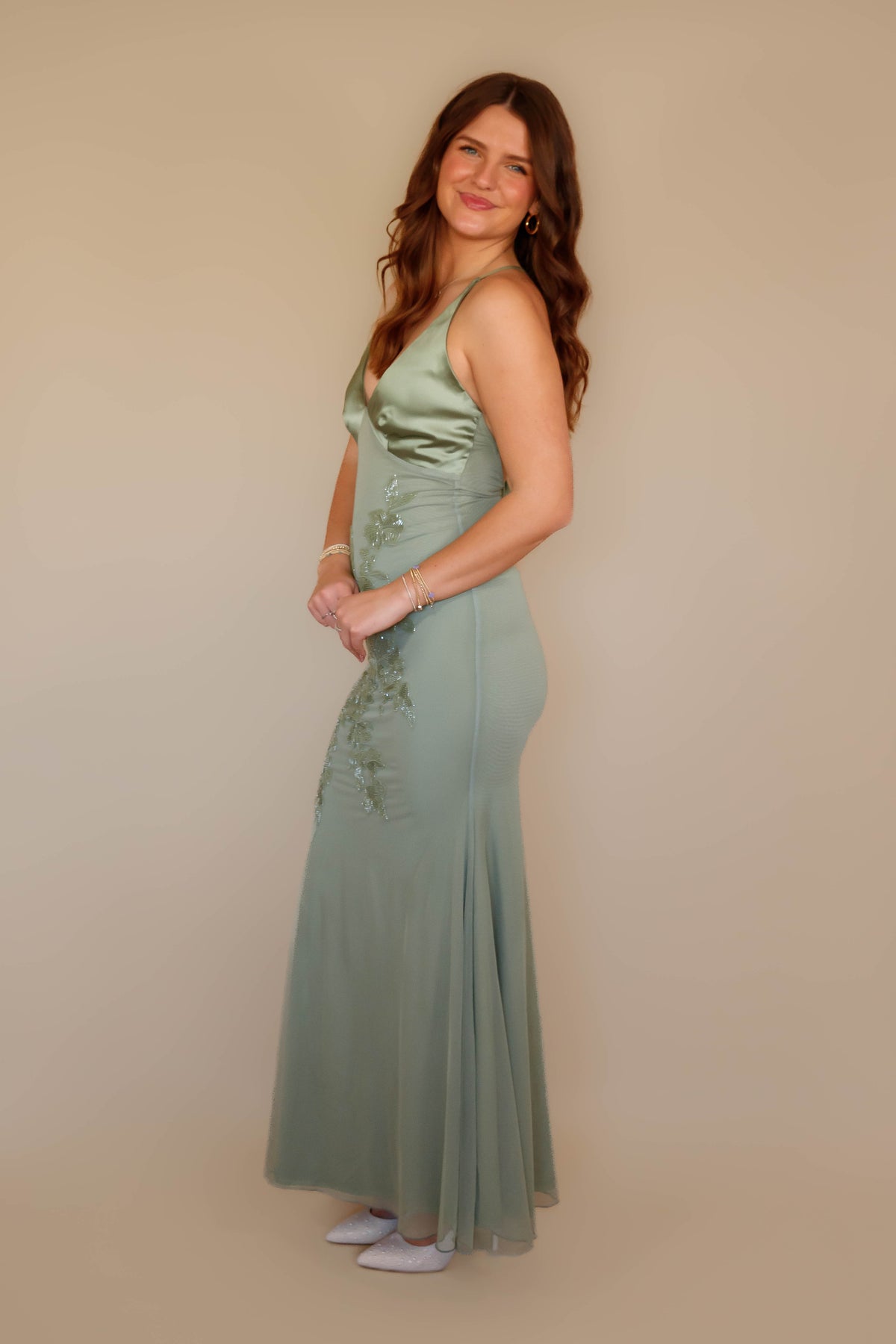 Experience pure elegance in this breathtaking maxi dress, crafted for those who dare to shine! The dramatic plunging neckline and open back create an unforgettable impression, while supportive spaghetti straps ensure comfort throughout the night. A precisely fitted waist accentuates your silhouette beautifully, and an exquisite diagonal arrangement of white floral appliques cascades gracefully across the lower skirt, adding romantic allure. Whether you're attending a wedding, gala, or formal celebration, this dress delivers the sophisticated glamour and feminine charm that makes you feel absolutely radiant!