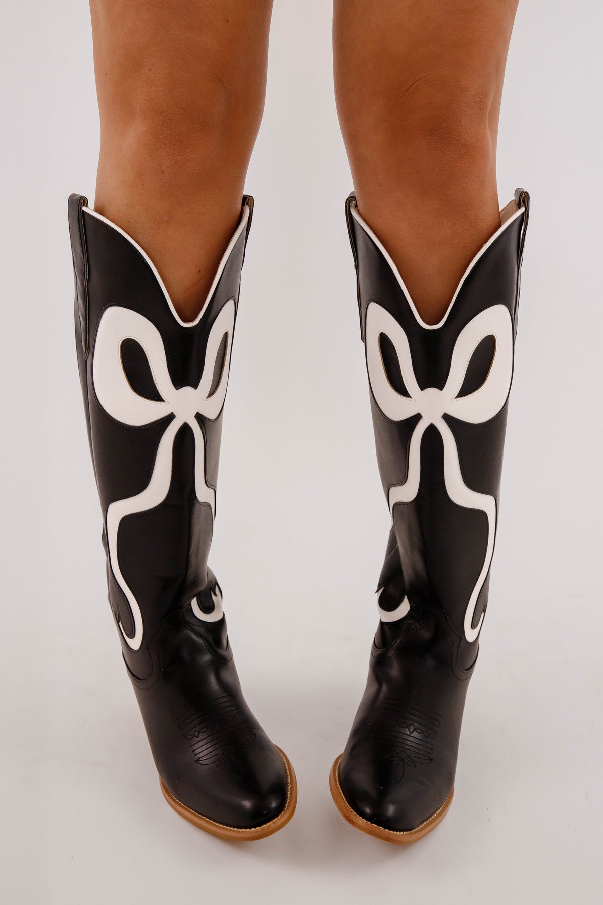 Elevate your style with the Ruby Boots in black! These black and white western boots effortlessly combine elegance and whimsy with a charming white bowknot inlay. Made from vegan leather, they provide comfort and a flattering fit with wide calf and knee-high length. Perfect for any occasion, these boots are a must-have for your wardrobe.