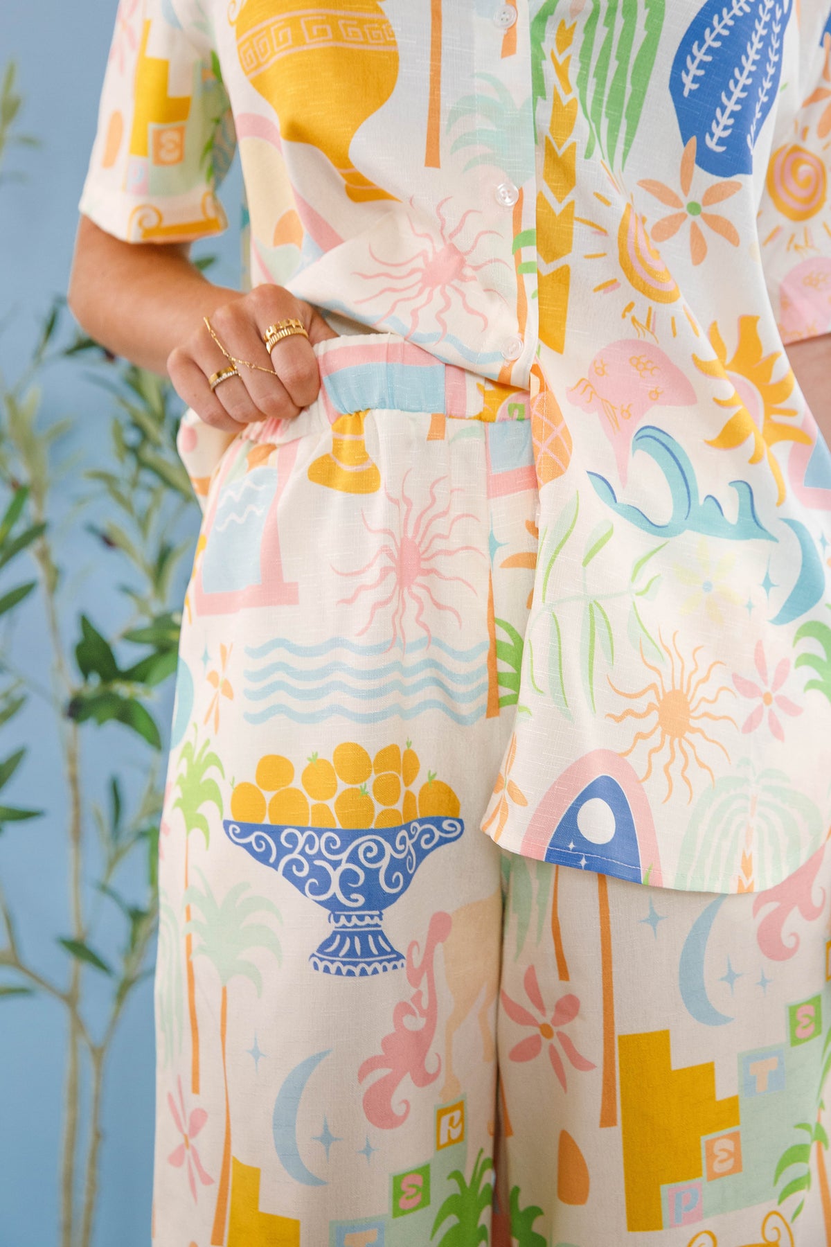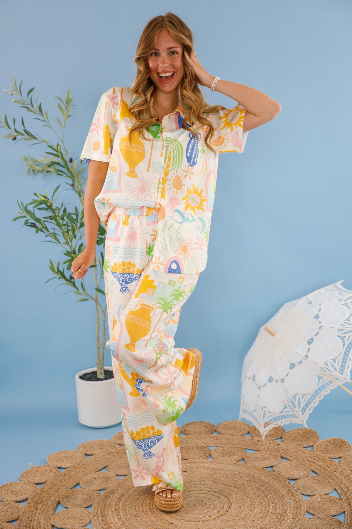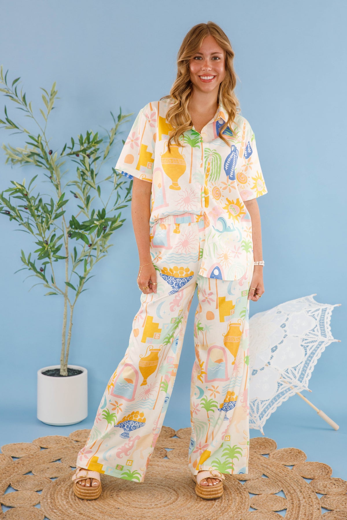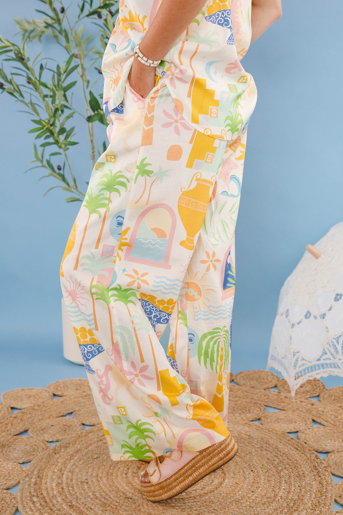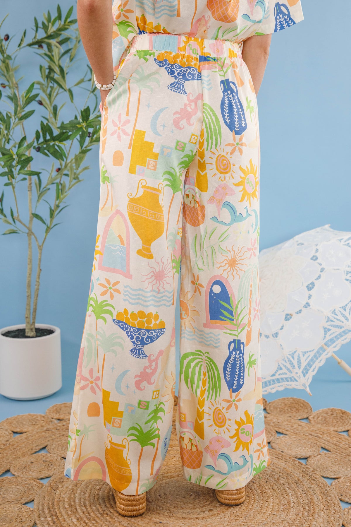 Experience effortless resort style with the On My Radar Pants! Designed for comfort and vibrant fun, these pants feature a colorful tropical print with playful fruit and palm tree accents. The elastic waistband ensures a perfect fit, while the wide-leg cut offers breezy ease. Ideal as a chic bathing suit coverup or for a lively evening out with margaritas, these pants bring vacation vibes wherever you go!