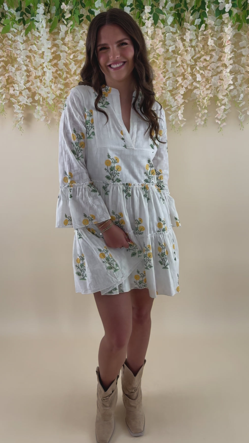 Feel effortlessly stylish in our Speaking My Language Dress! Featuring yellow and green flower print, a flattering V-neckline, and a relaxed fit, this tiered mini dress is perfect for any warm weather occasion. The 3/4 sleeves add a touch of elegance, while the comfortable cotton fabric makes it ideal for vacation or a breezy afternoon. Embrace the summery vibes and add this dress to your wardrobe now!