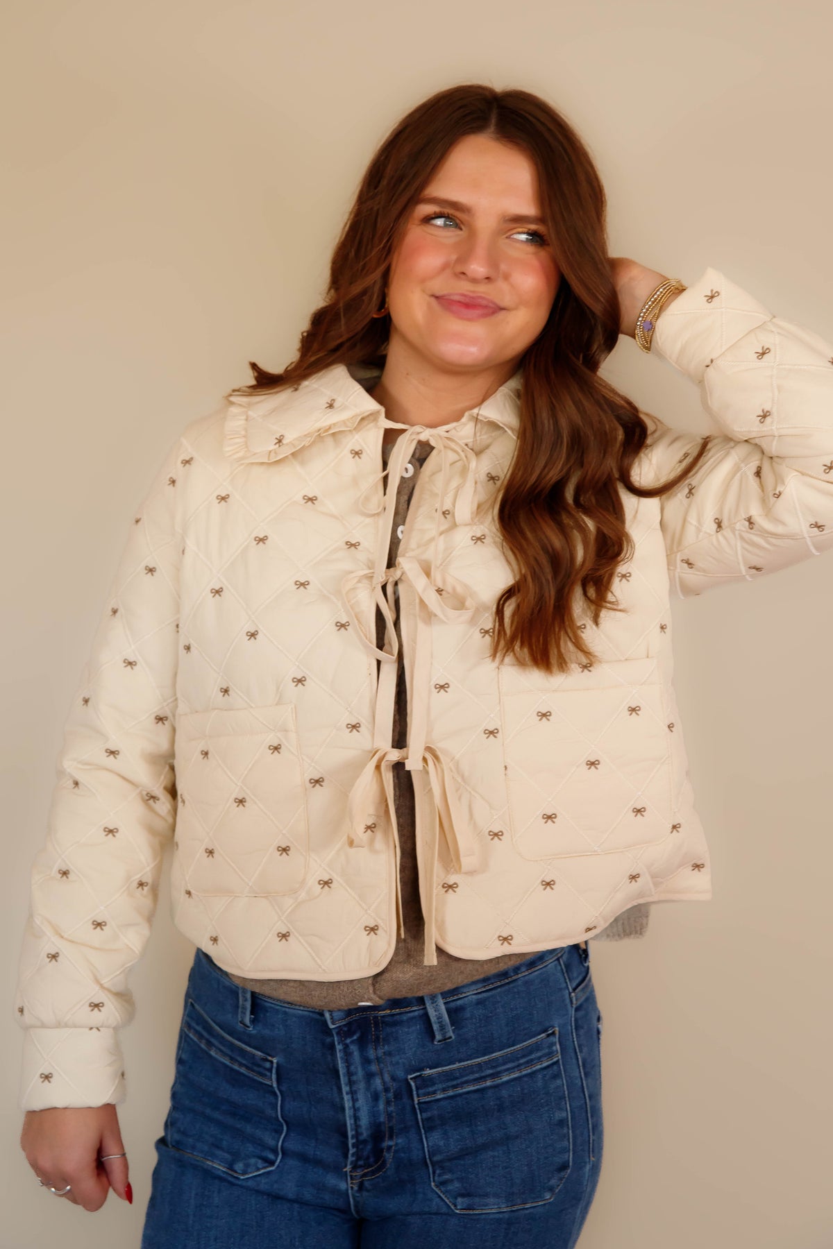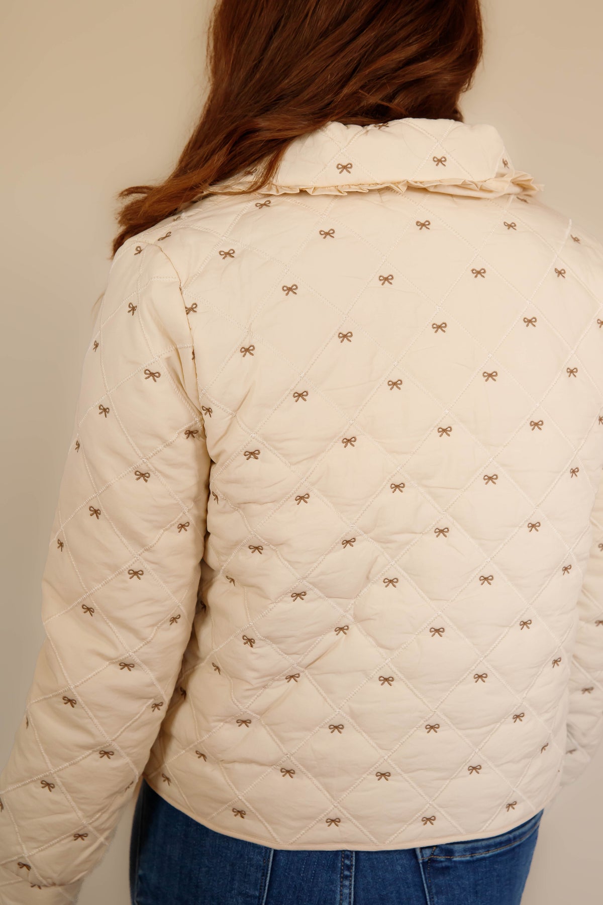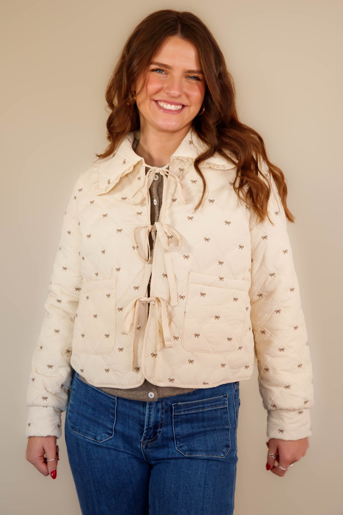 Step into understated luxury with this exquisite quilted jacket that captures the essence of refined femininity! Every detail—from the intricate bow embroidery to the delicate ruffle-trim collar—has been thoughtfully designed to elevate your everyday style. The tie-front closure provides a customizable fit that flatters every figure, while the sumptuous camel and cream color-way pairs beautifully with virtually any ensemble. Whether you're layering for warmth or adding dimension to your look, this jacket delivers the perfect blend of coziness and sophistication!