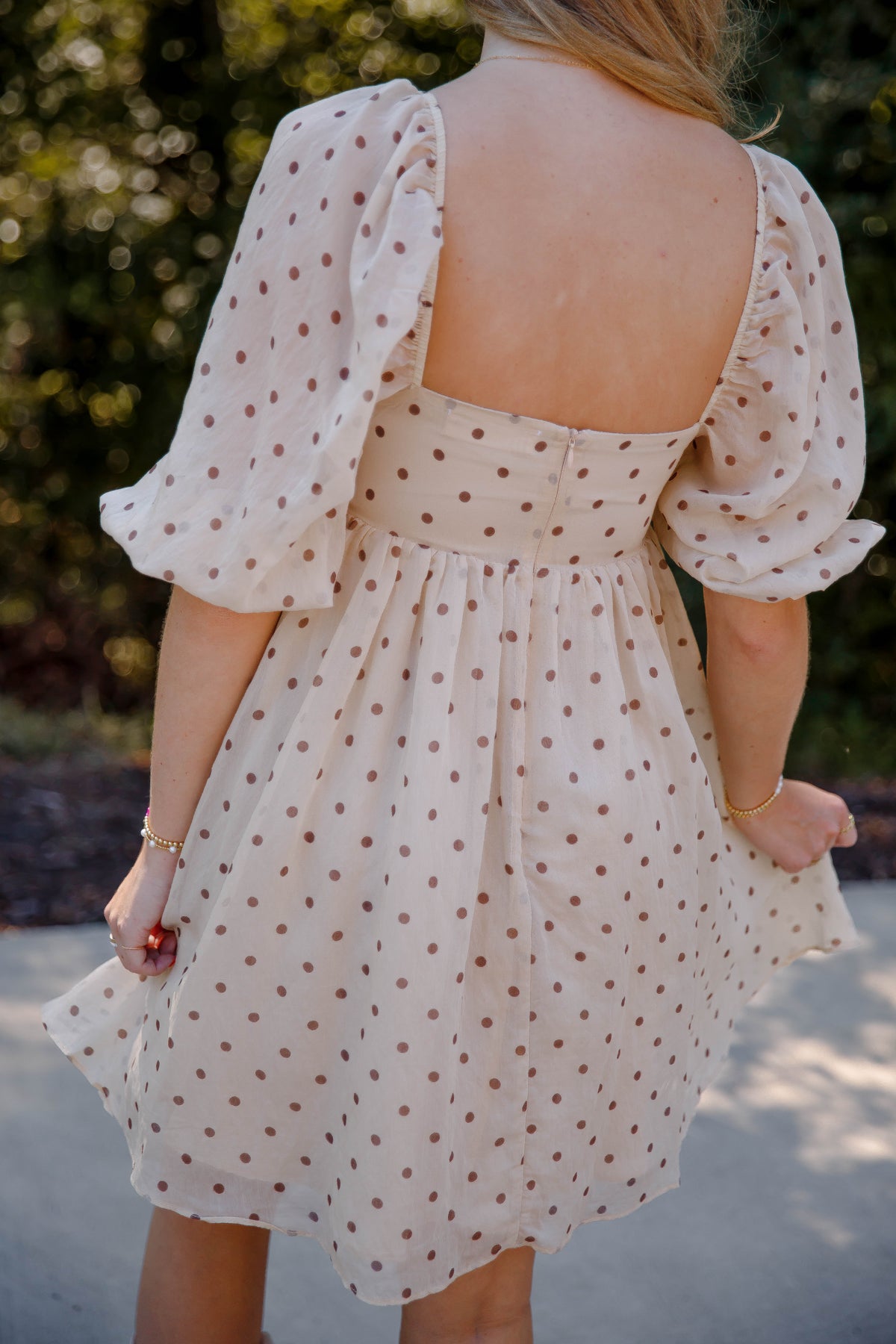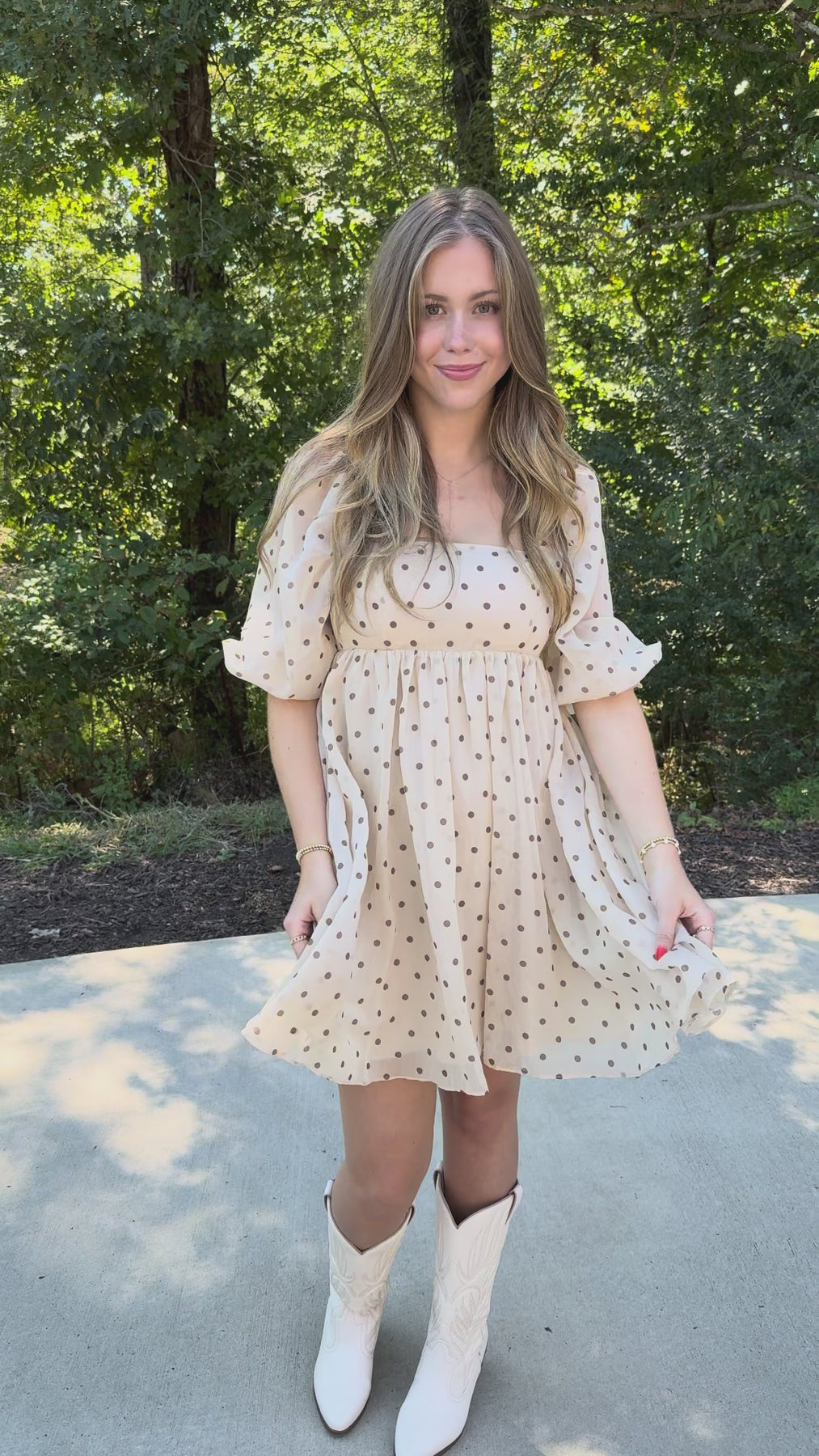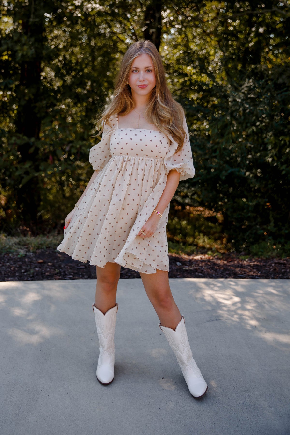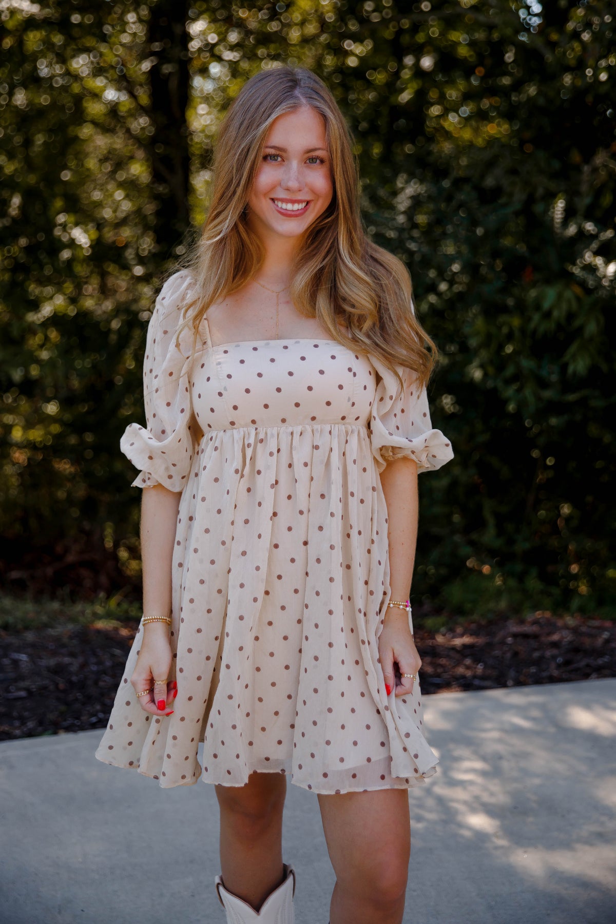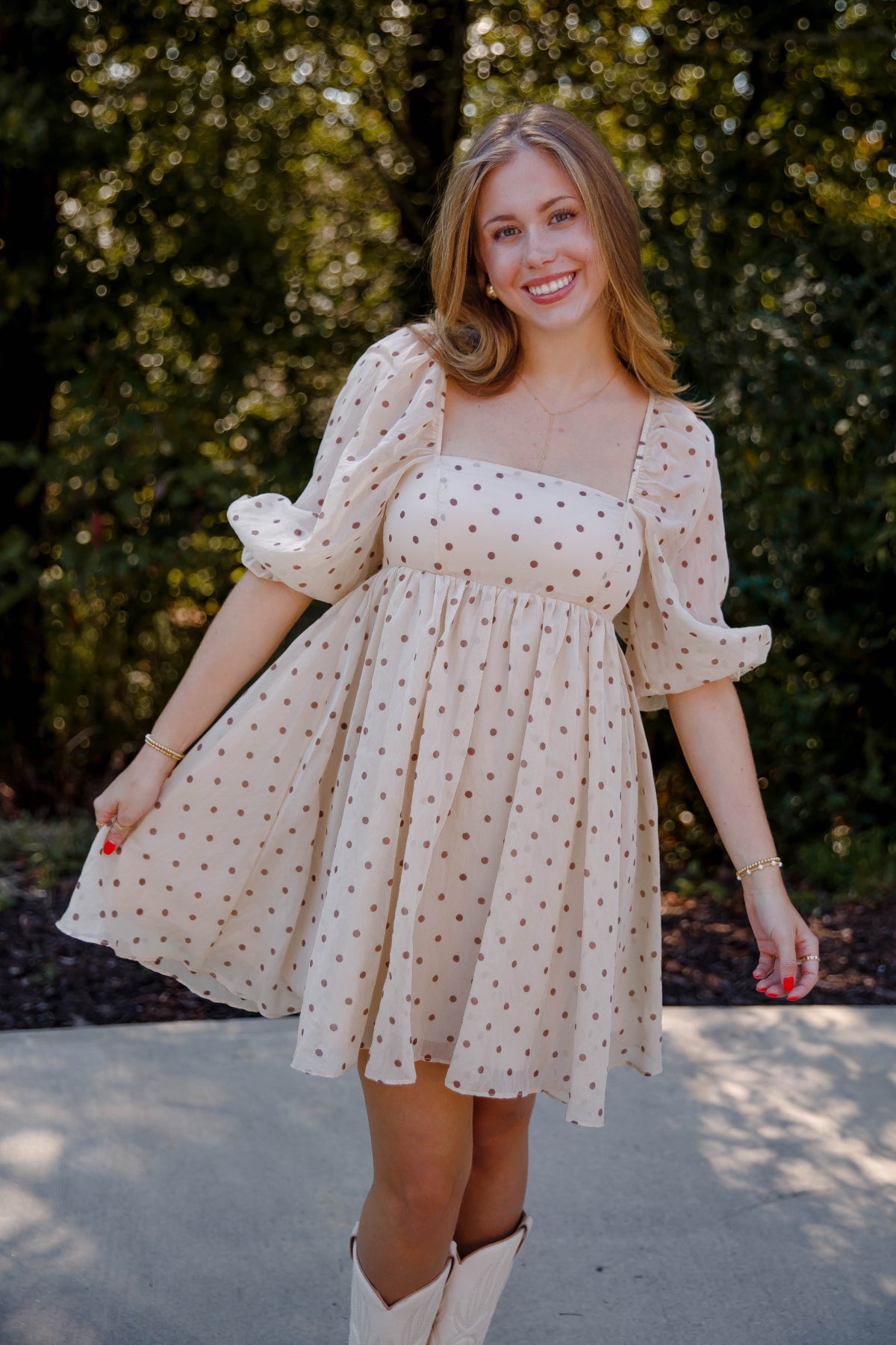 The Subtle Reminder Dress is a charming polkadot baby doll dress designed to flatter every figure. Its square neckline and 3/4-length puffy sleeves add a touch of vintage elegance, while the gathered waist and A-line silhouette create a graceful, comfortable fit. An invisible back zipper ensures a seamless look, making this dress perfect for effortless style from day to night. Embrace classic femininity with a modern twist in this must-have piece.
