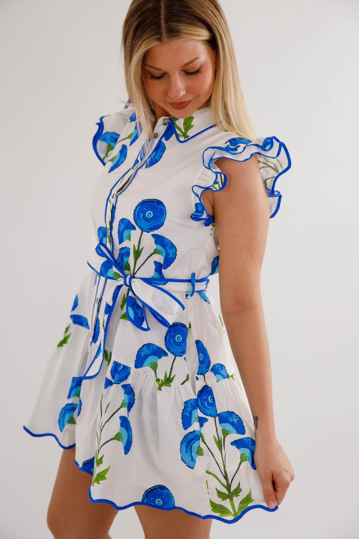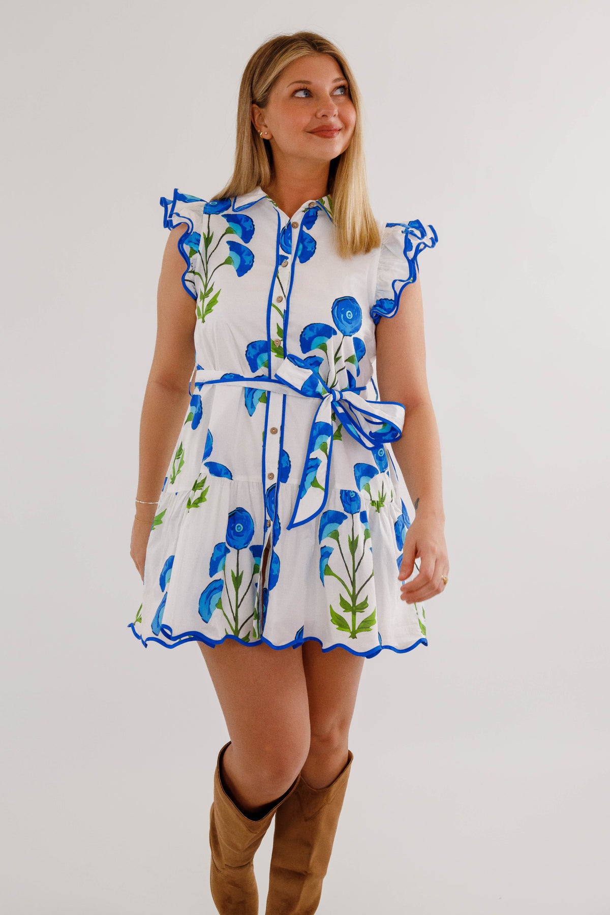 Make a lasting impression in this charming floral button-down dress designed for the modern woman who refuses to compromise on style or function! The crisp white canvas showcases vibrant blue and green florals, while layered ruffled sleeves add romantic dimension to your look. A fitted waist tie sculpts your silhouette beautifully, and practical side pockets keep essentials within reach. The signature scallop hem and contrasting edge details elevate this piece beyond ordinary, creating a dress that works as hard as you do—from office meetings to weekend getaways!