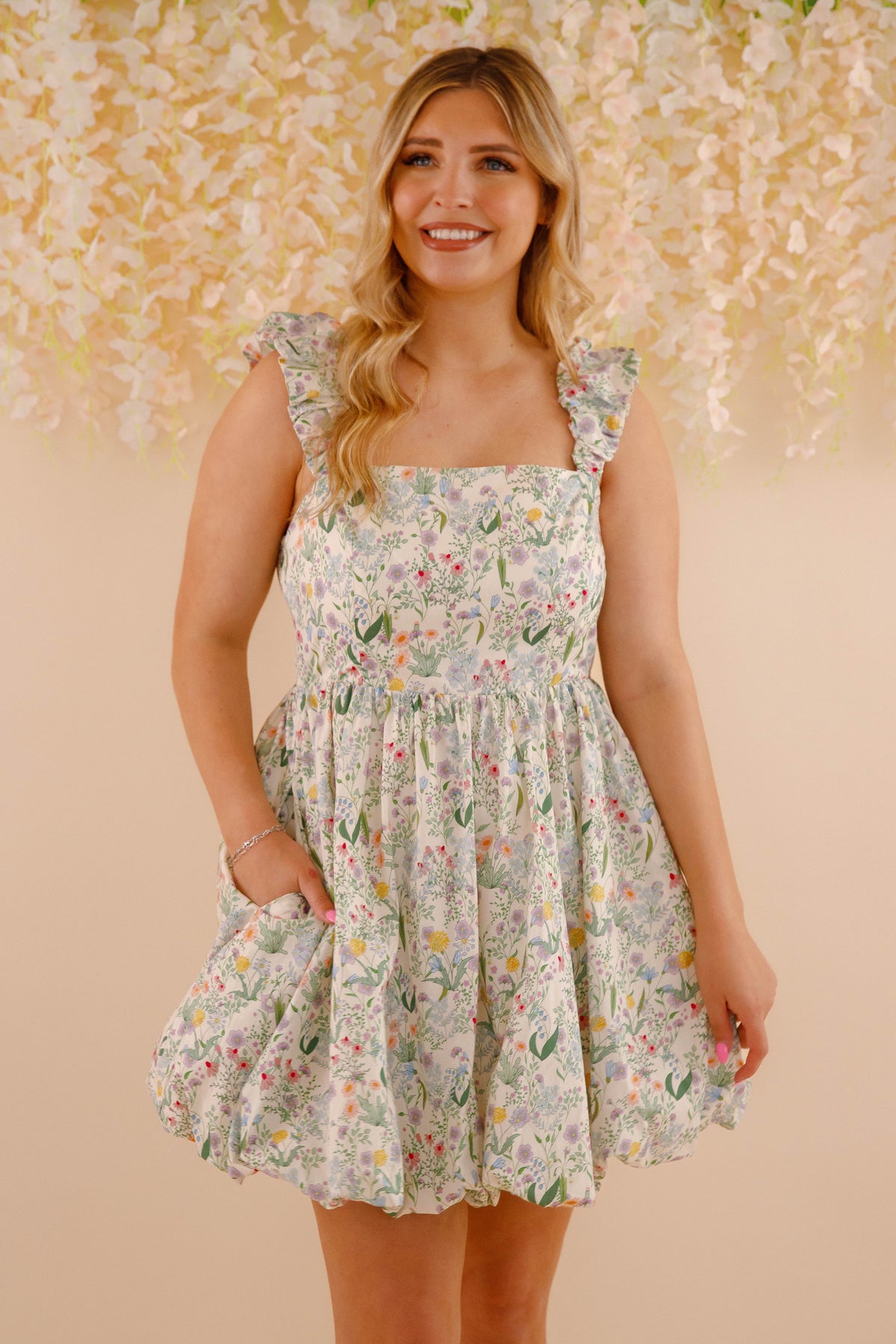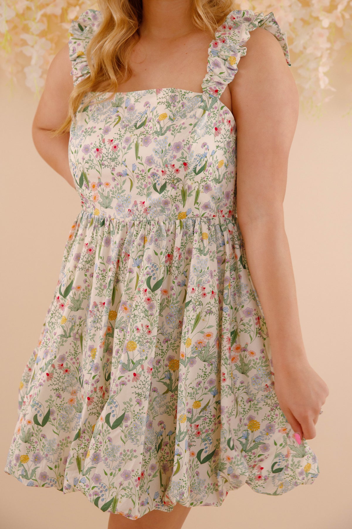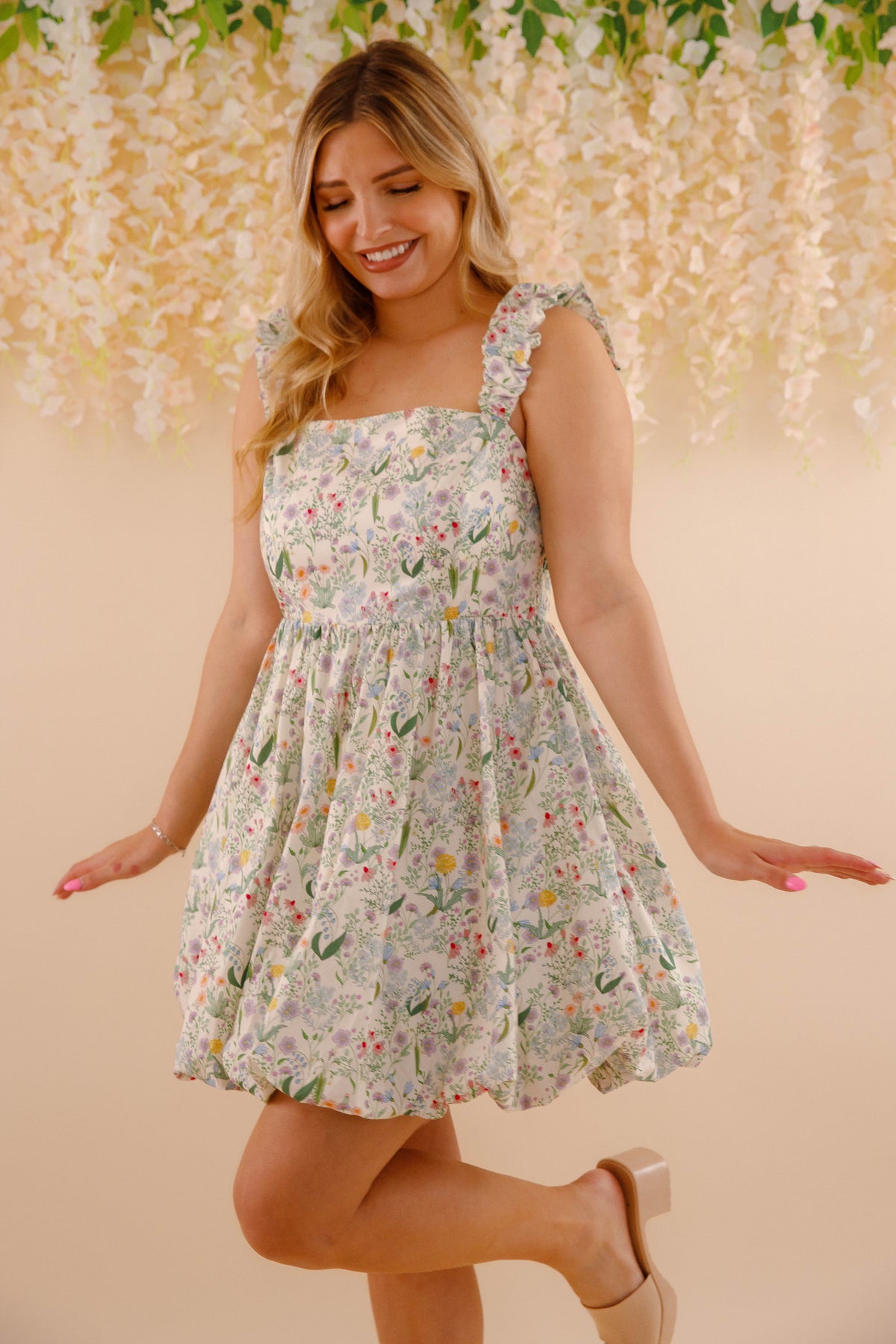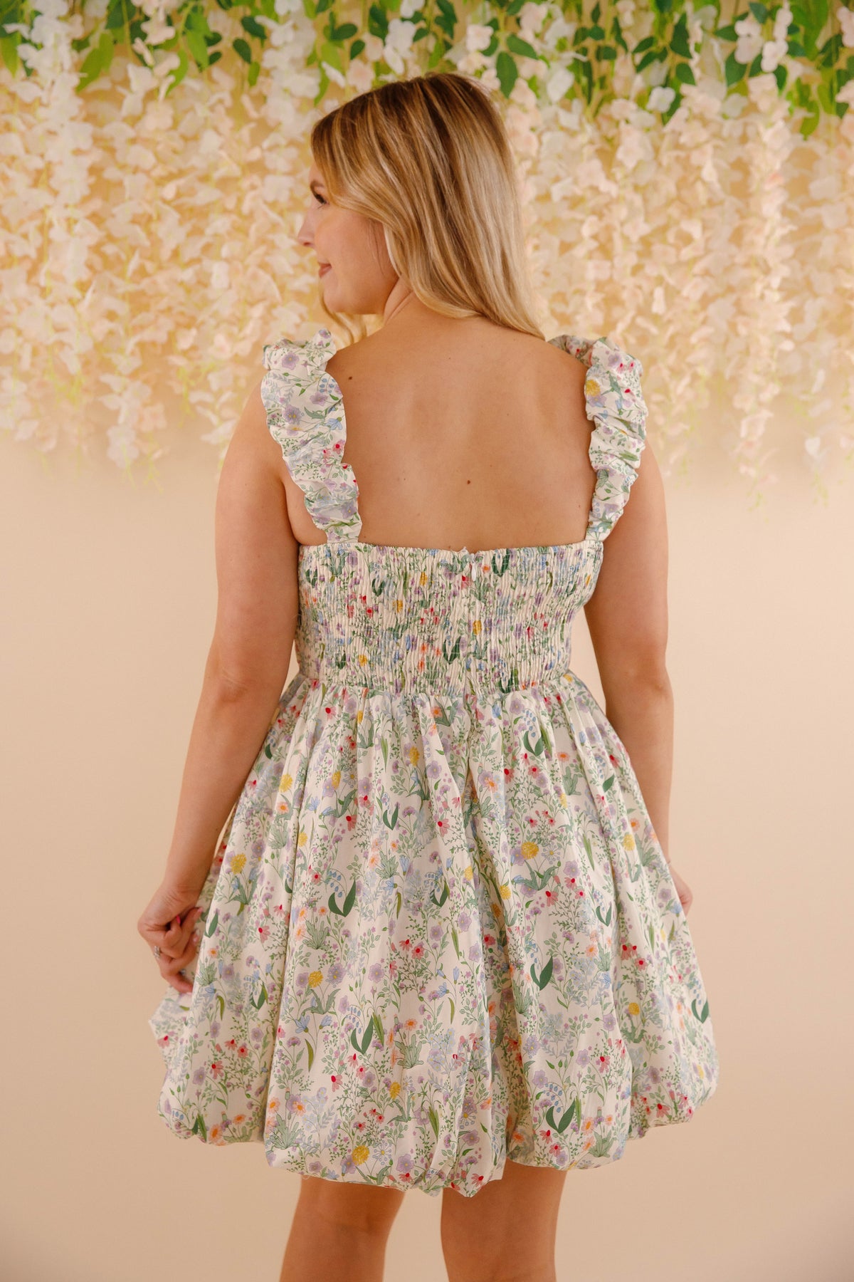 Get ready for some cottagecore vibes with our No Where Like It Mini Dress! Featuring ruched straps, a bubbly mini dress design, and a delicate floral pattern, this dress is perfect for sweet and flirty looks. The elastic waistband and smocked backing bring the ultimate comfort. No where else will you find a dress like this!
