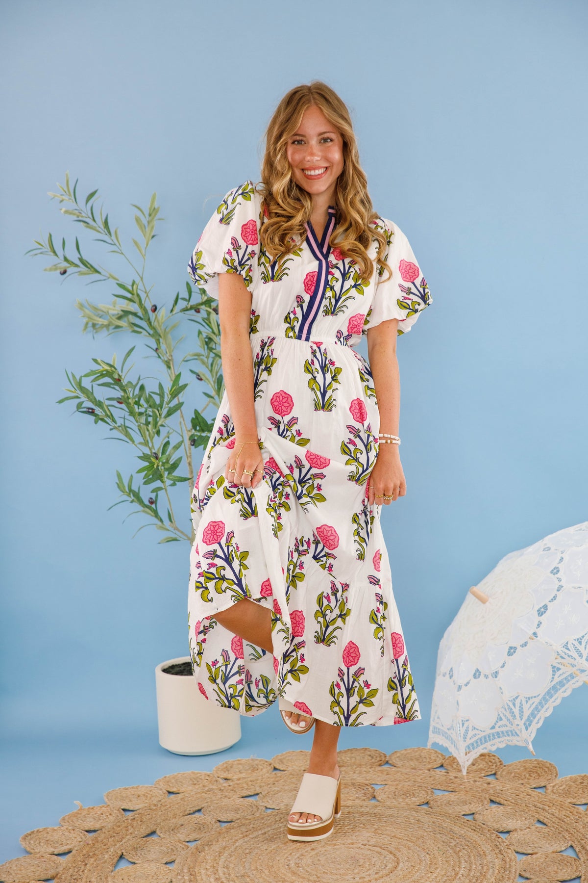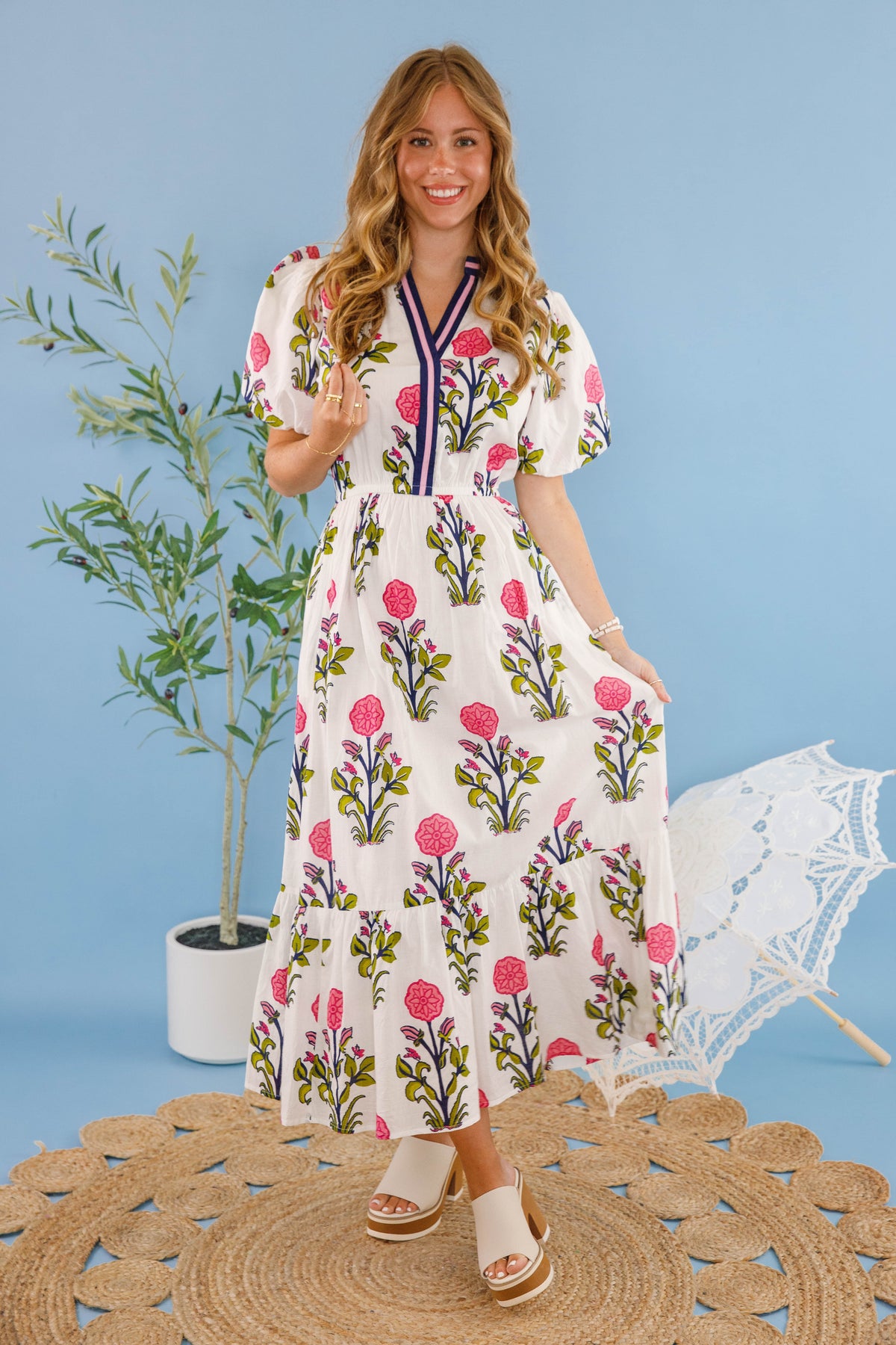 Experience effortless elegance and comfort with our Bring Me Back To Life Midi Dress! Its vibrant floral print, puffed sleeves, and contrast trim are perfect for bringing a playful yet sophisticated vibe to any occasion. Made with lightweight cotton, an elastic waistband, and short puff sleeves, this dress is a statement of style and comfort!