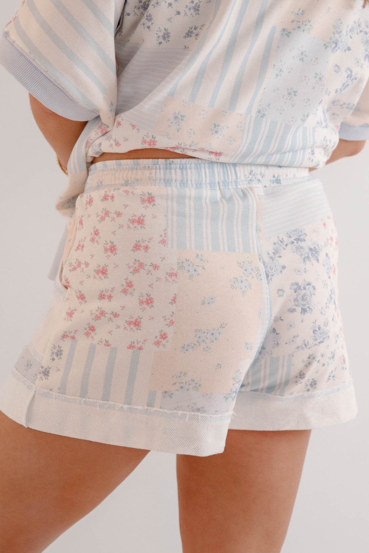 Embrace effortless style with these French terry shorts, featuring a striking stripe and floral patchwork design. The elastic waist offers comfortable everyday wear, while the mixed print pattern adds visual interest to your casual wardrobe.