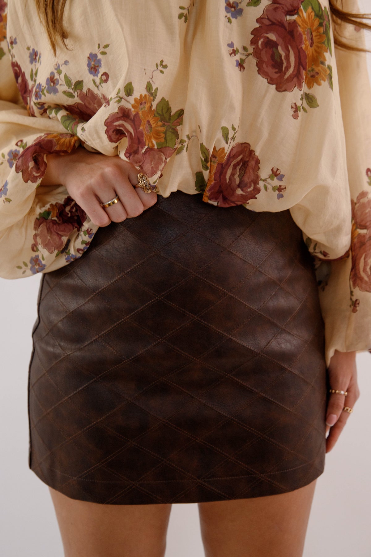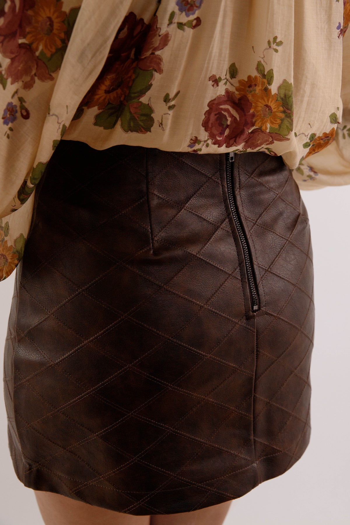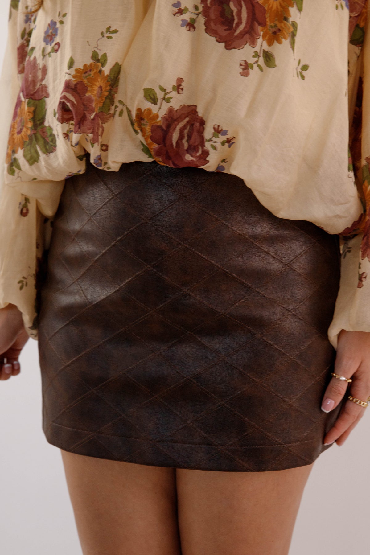 Make a bold impression with this vegan leather mini skirt—the ultimate wardrobe staple for those who refuse to blend in. Crafted with precision-stitched paneling that sculpts and defines your silhouette, this piece combines edgy sophistication with everyday wearability. The fitted, non-stretch construction ensures a sleek, intentional fit that commands attention whether you're heading to brunch or a night out. Pair it with anything from sneakers to heels and watch this modern essential become your most-reached-for piece!