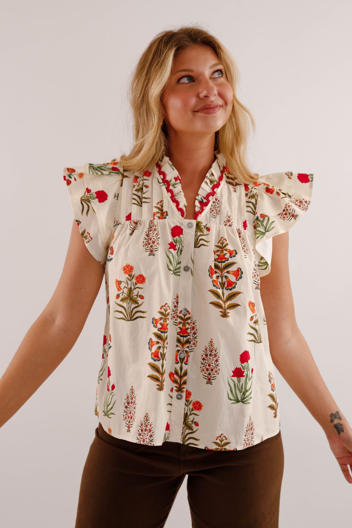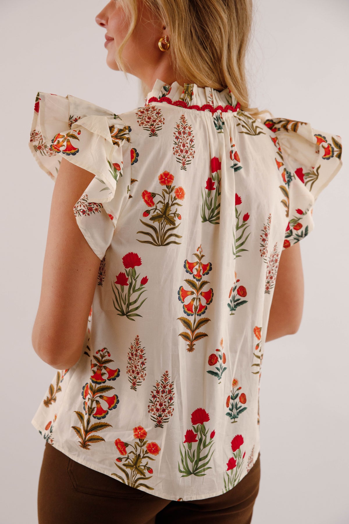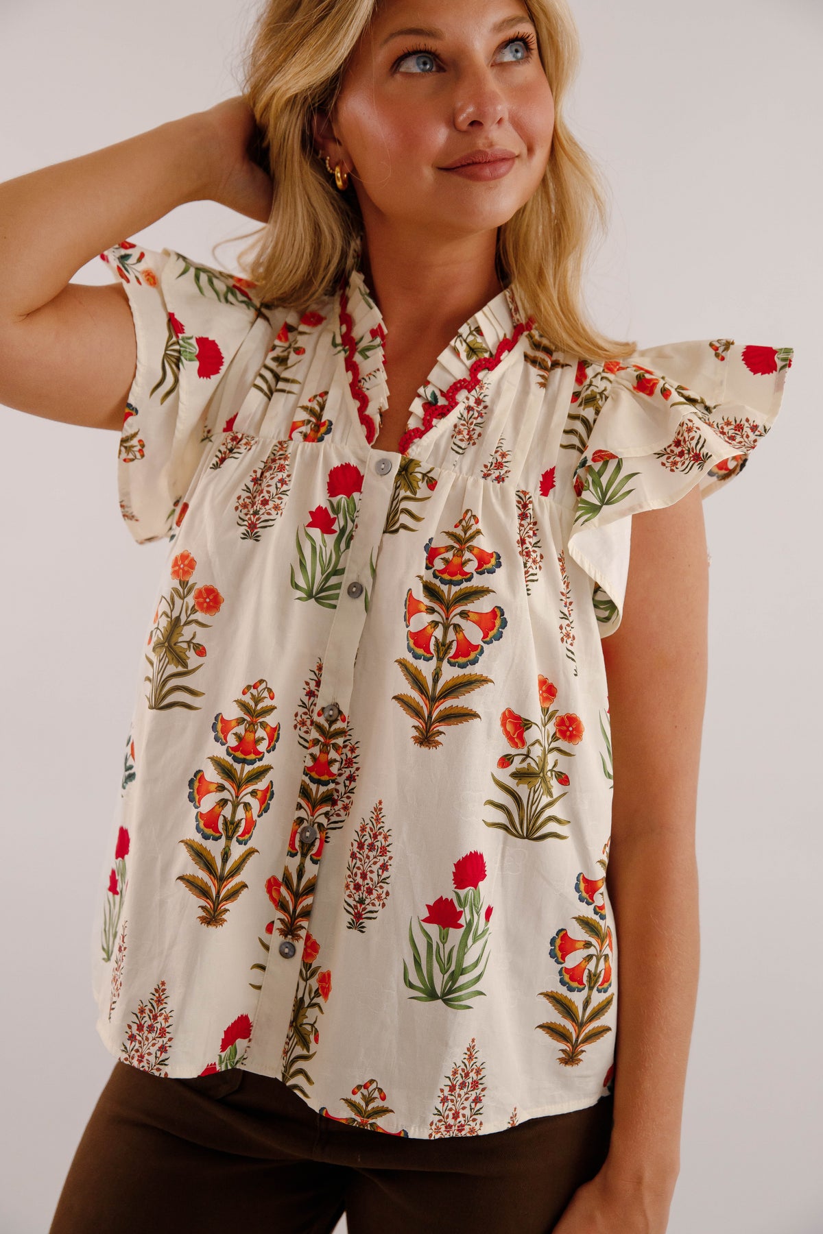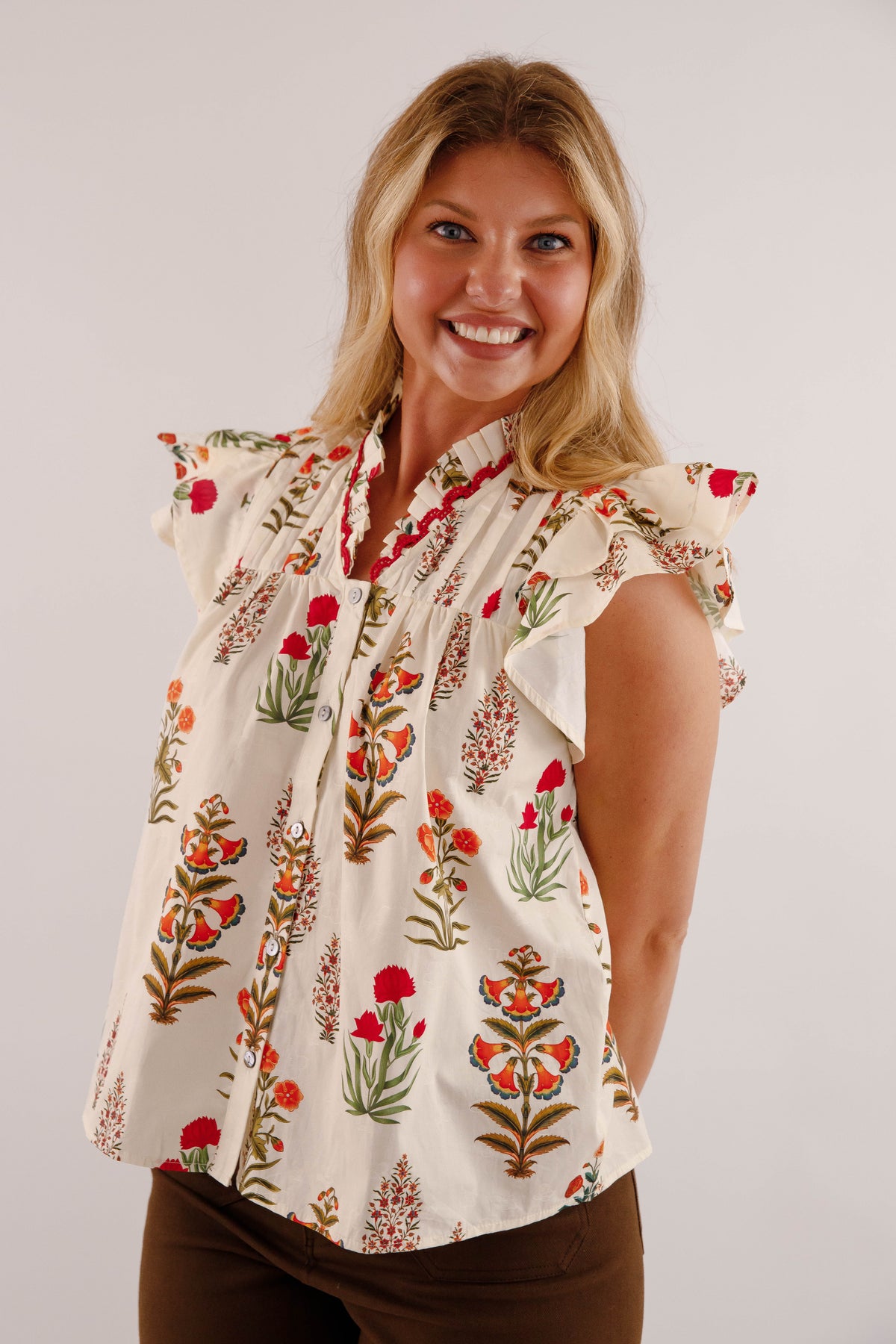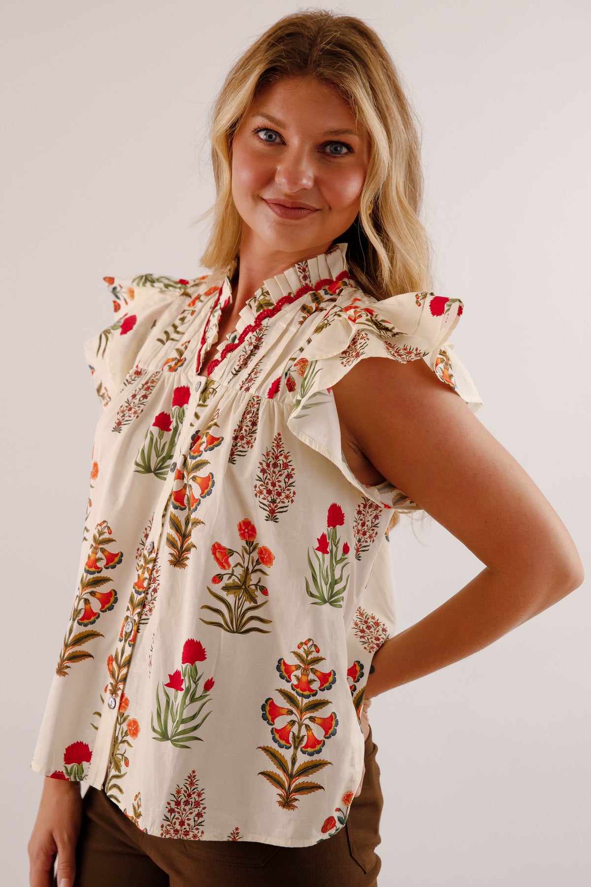 The Moral Of The Story Blouse features an ivory base adorned with vibrant florals in orange, red, and green, creating a sophisticated boho look. Its ruffled sleeves bring a touch of drama, while the pleated neckline with embroidered trim adds refined detail. Made from a lightweight cotton blend, this blouse ensures comfort all day and transitions effortlessly from warm afternoons to layered styling. Its flowy silhouette flatters various body types, making it an easy and stylish choice for any occasion!