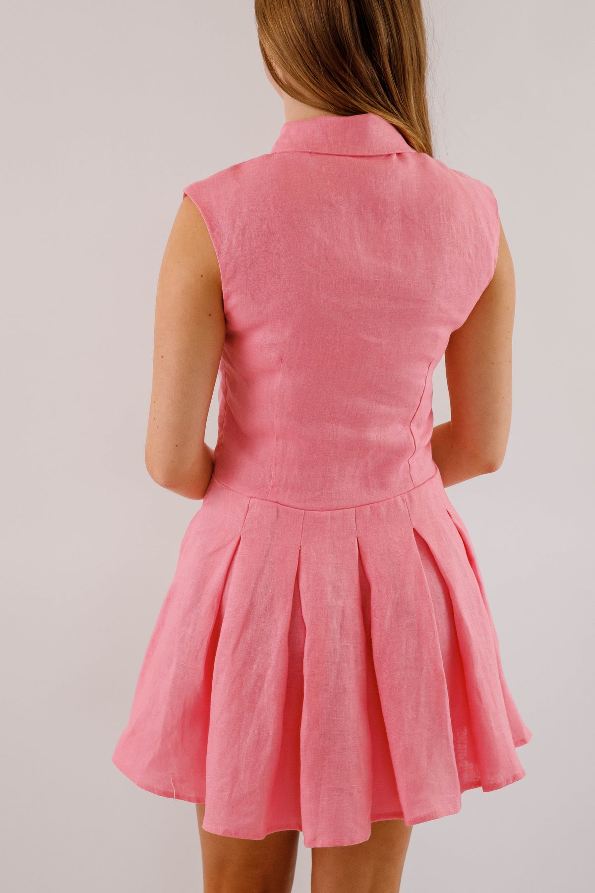 Step into effortless style with the Doing My Research Dress, crafted in vibrant bubblegum pink linen. Featuring a crisp collar and button-down detail on the chest, this dress balances preppy sophistication with a flirty, modern flair. The pleated skater skirt creates a playful silhouette that's perfect for showcasing your girly side while staying chic and contemporary. A standout choice for any occasion where you want to make a confident, stylish impression!