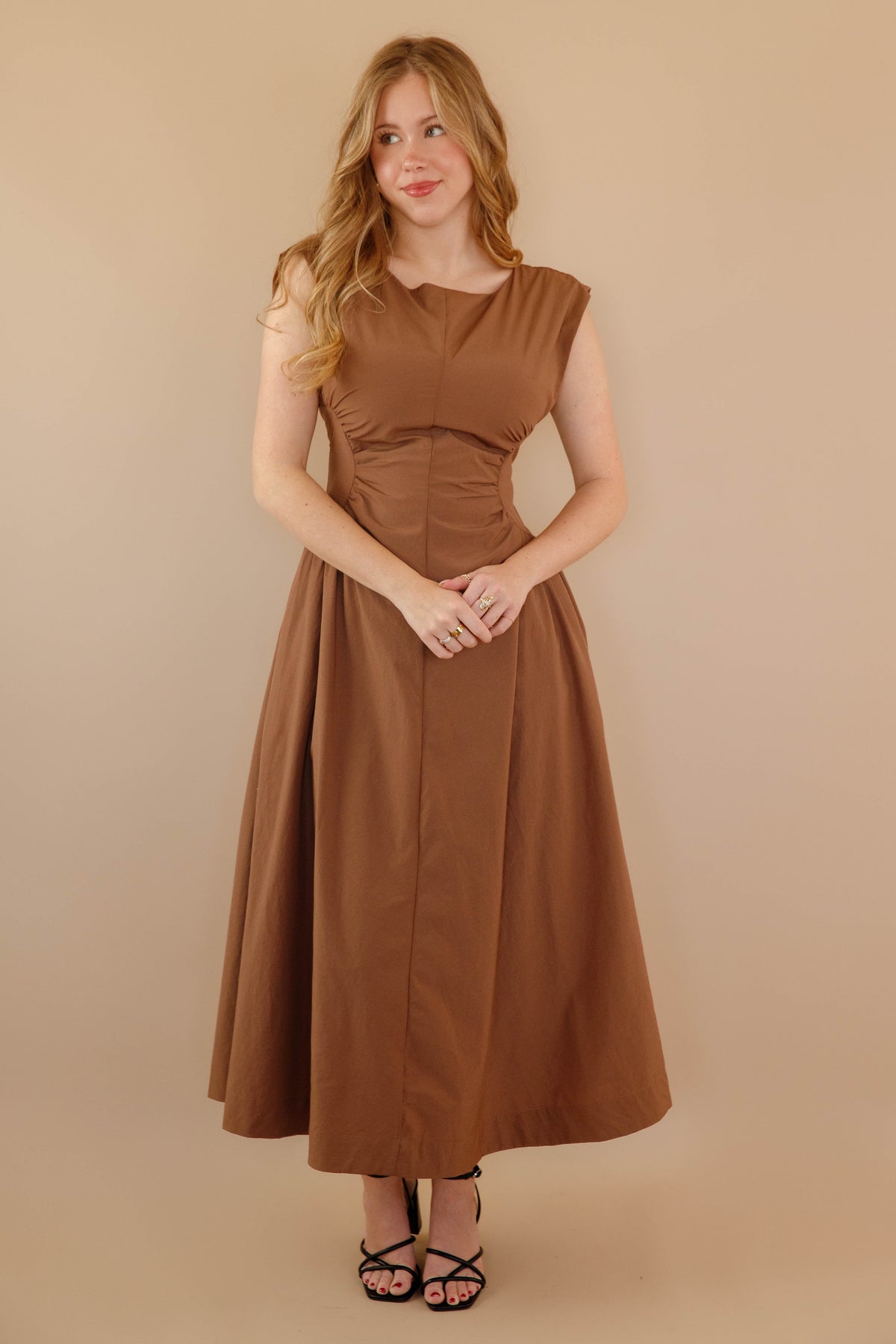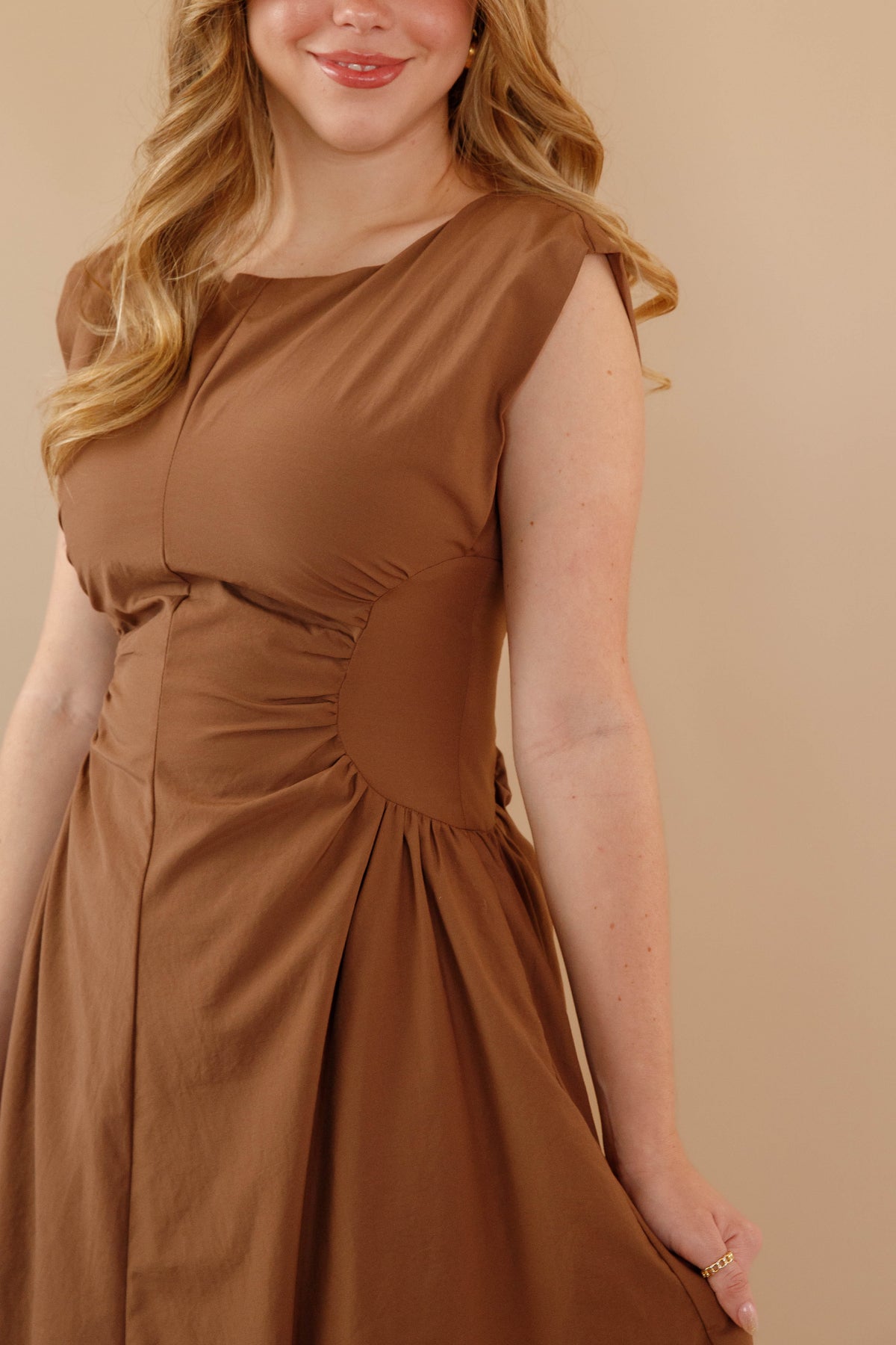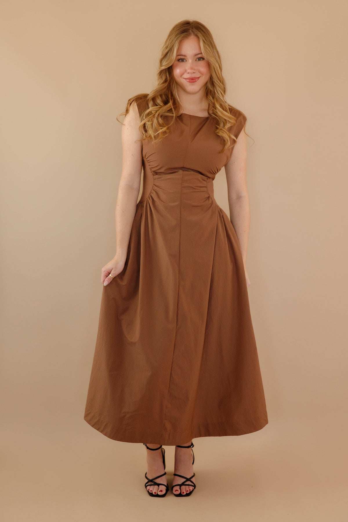 Solid Brown Midi Dress- Cinched Waist Midi Dress- Women&