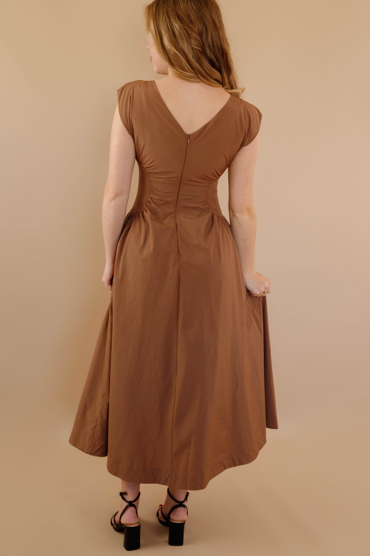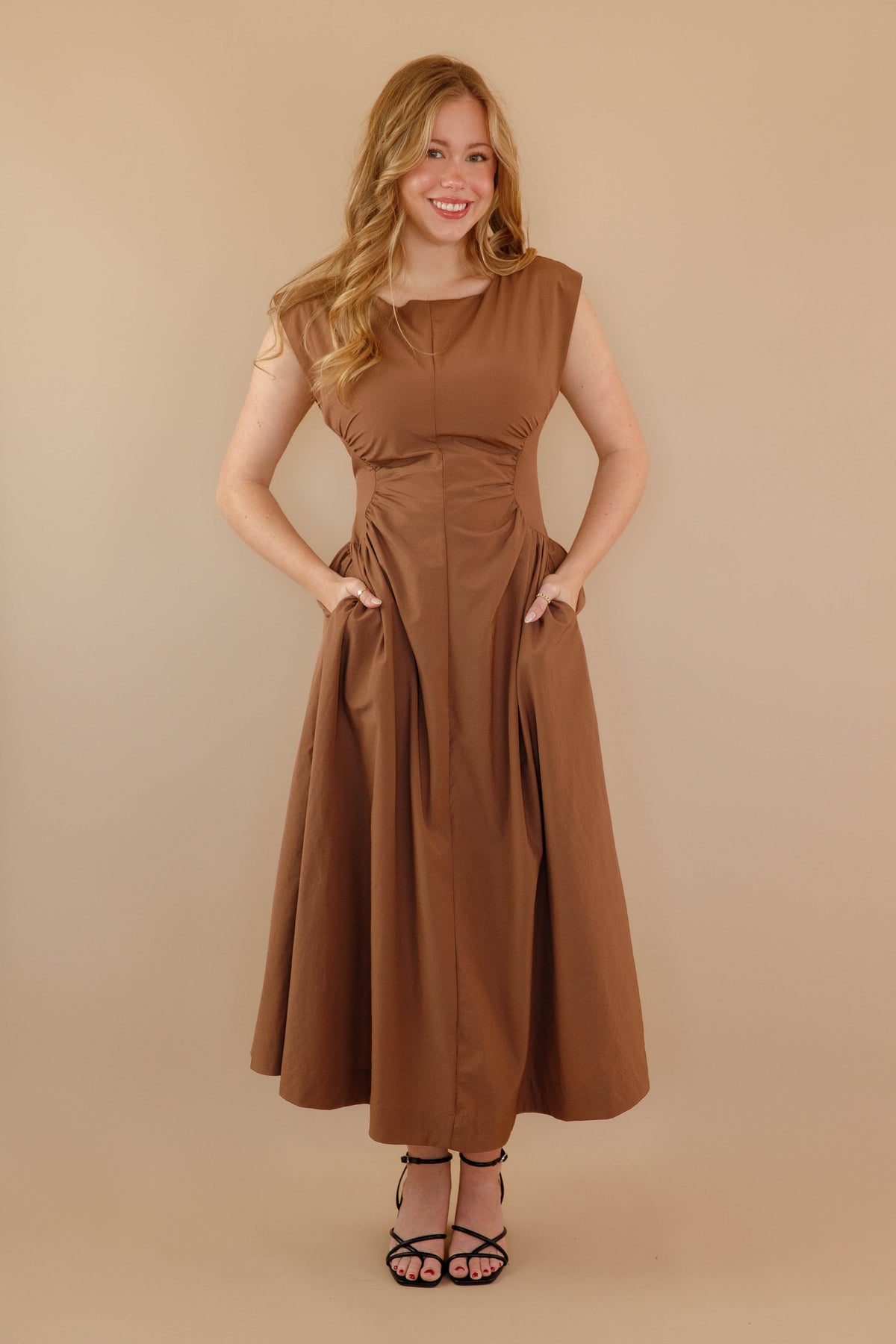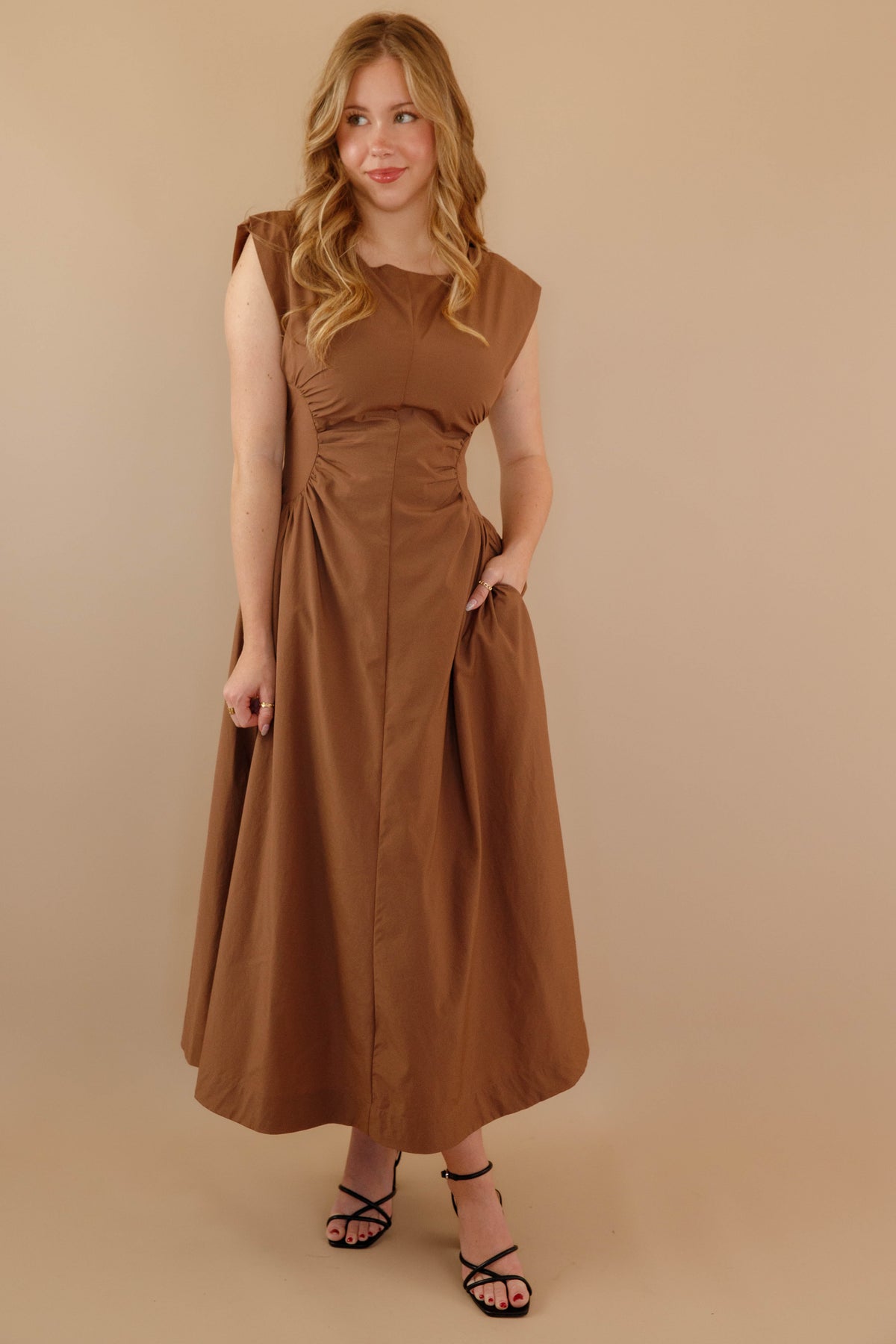 Solid Brown Midi Dress- Cinched Waist Midi Dress- Women&