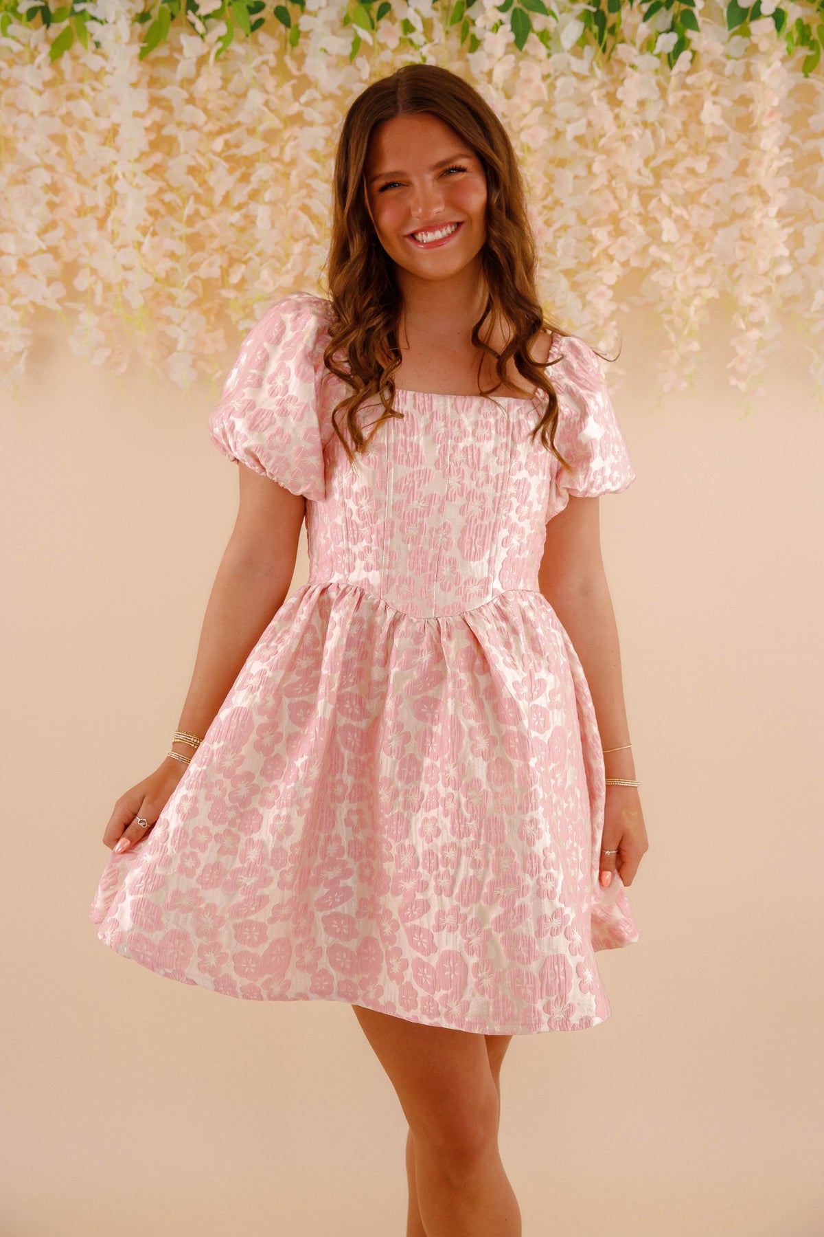 This Must Be Love Dress is perfect for any occasion with its fit and flare cut that flatters any figure. The floral pattern and jacquard fabric add a touch of elegance, while the square neck and puff sleeves bring a playful and romantic touch. The smocking in the back and zipper closure make for a comfortable and effortless fit.