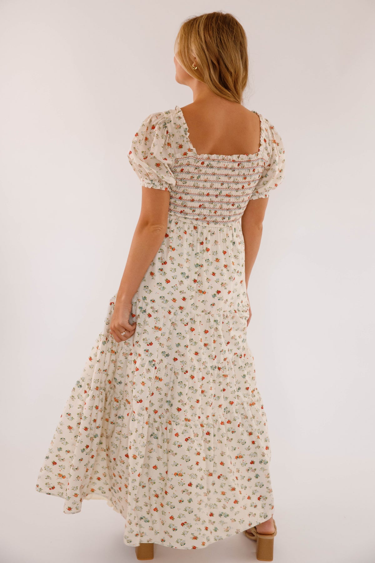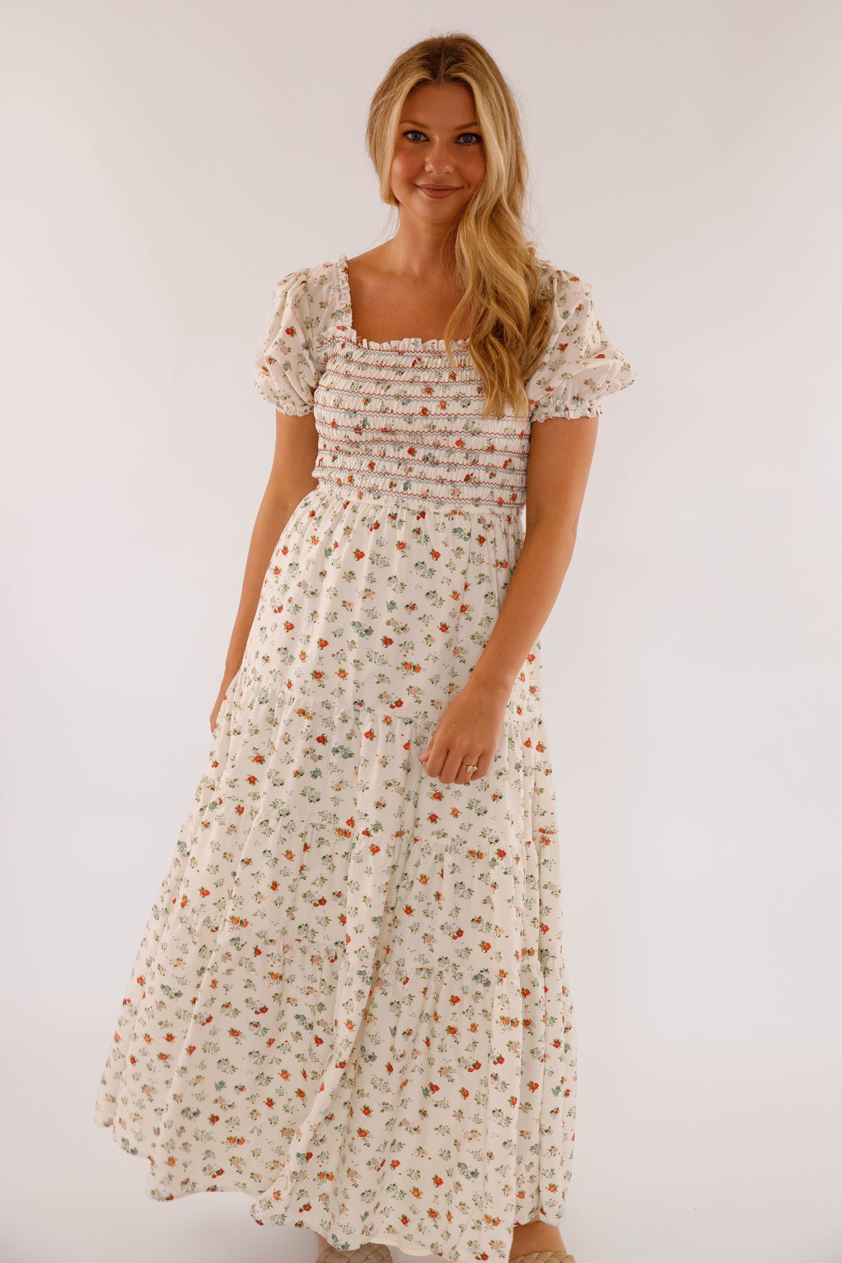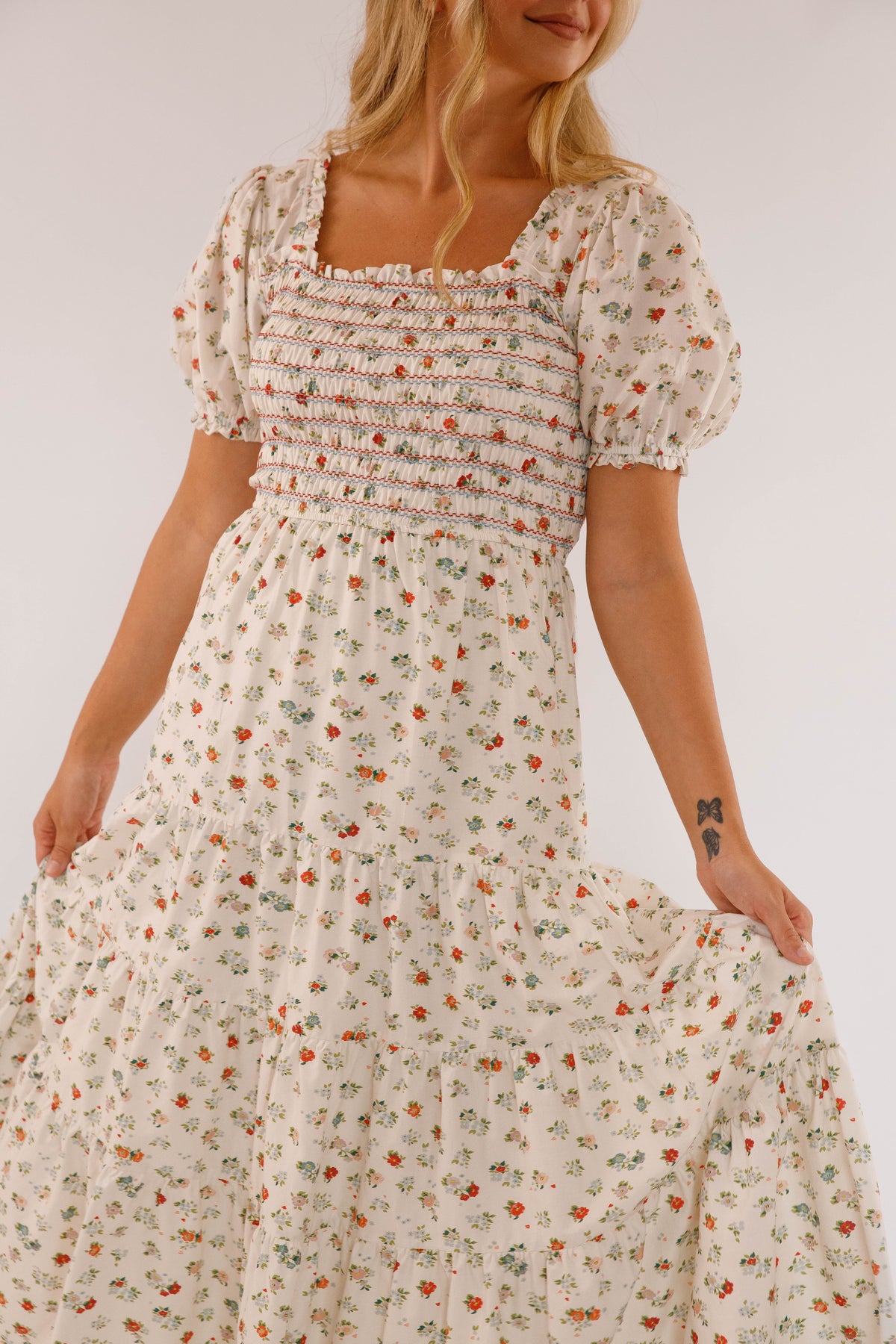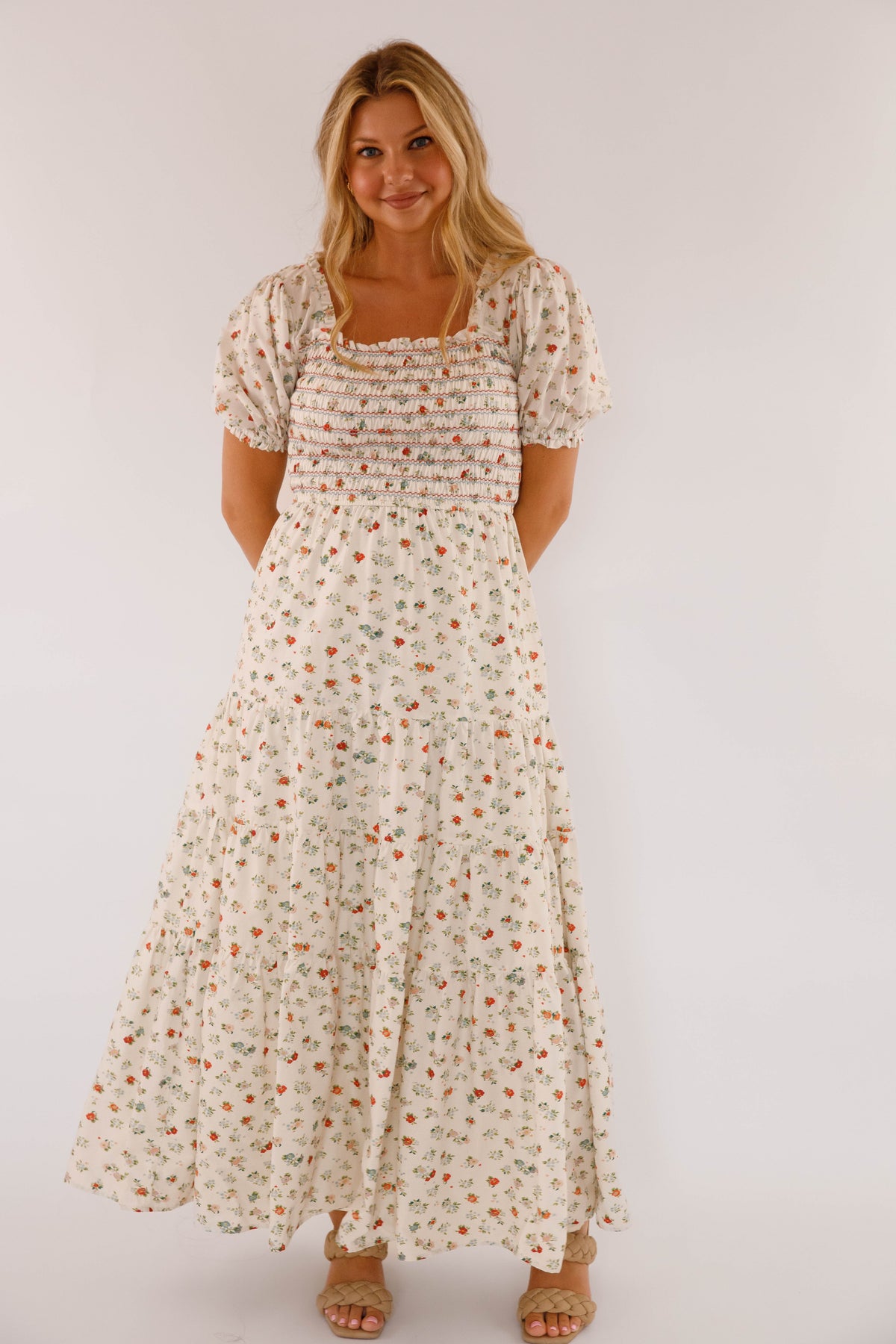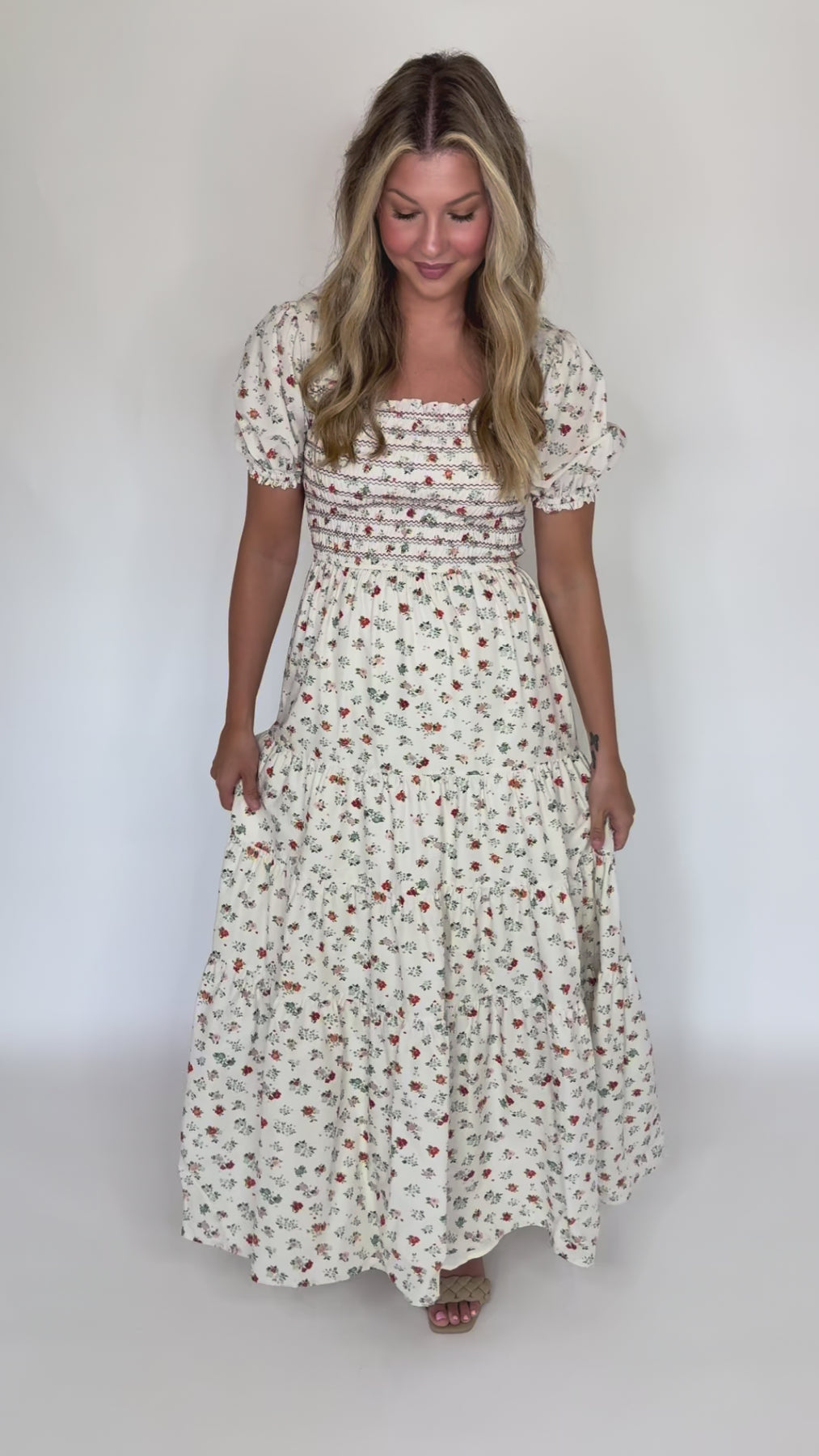 Embrace effortless charm with the Wildflower Field Maxi Dress! Its ivory fabric showcases a delicate floral print, complemented by a ruffle straight neckline and a smocked bodice that flatters every figure. The puff sleeves add a touch of romance, while the flowing maxi length ensures graceful movement. Perfect for sunny days or elegant evenings, this dress invites endless compliments wherever you go!