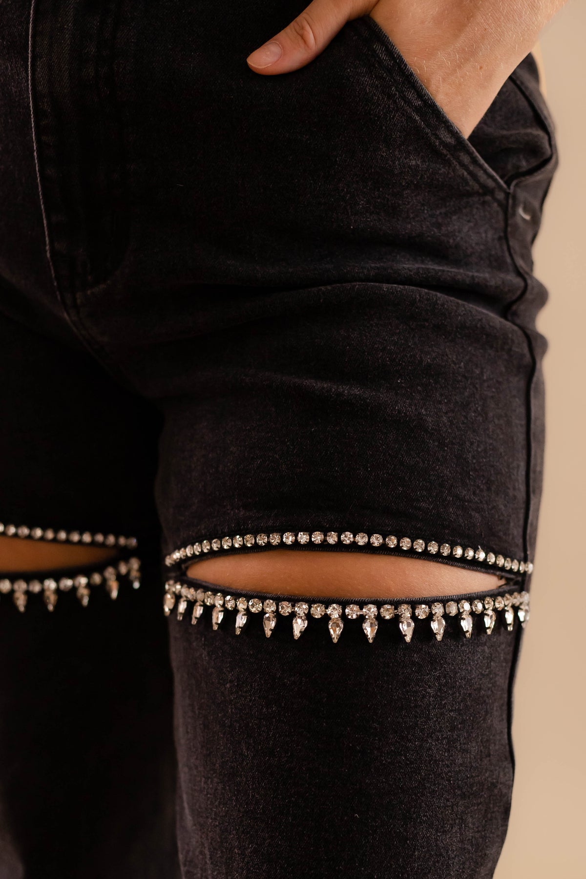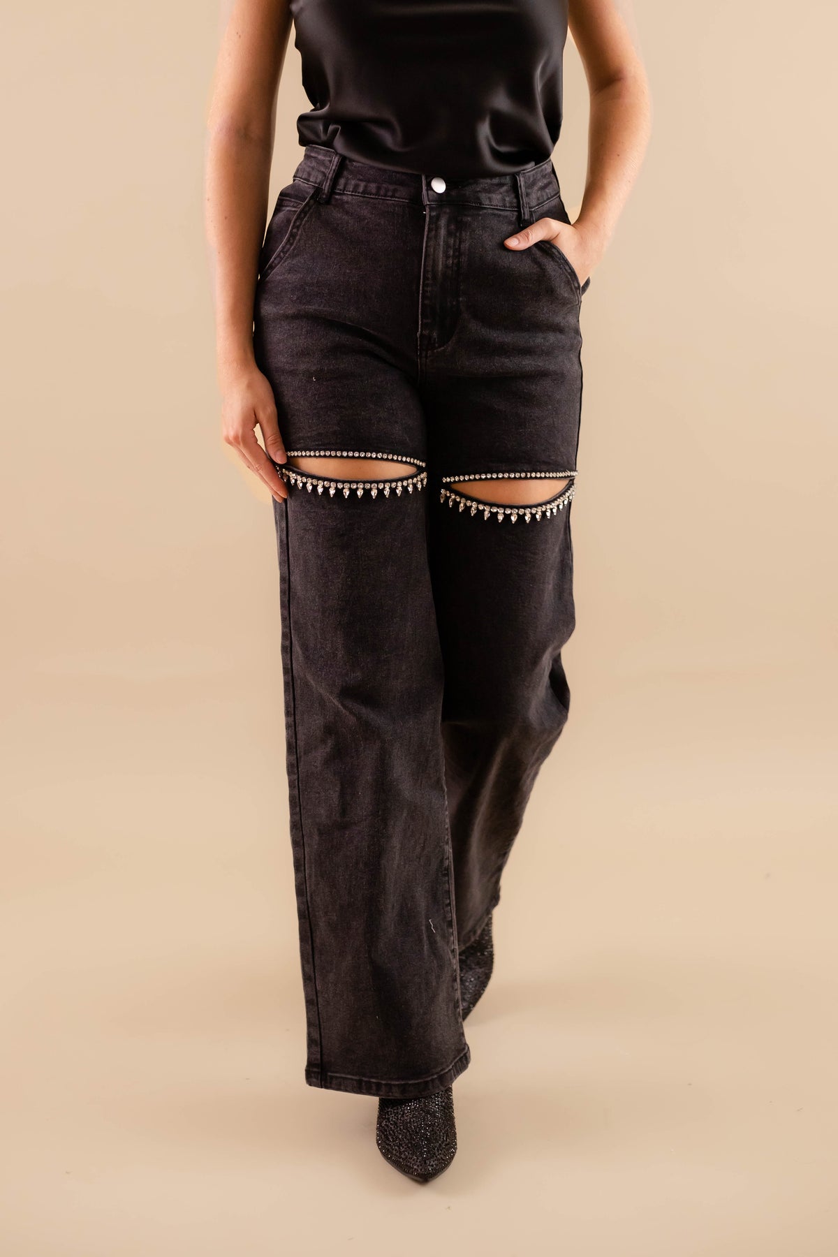 Elevate your style with our Big Personality Rhinestone Denim jeans! High waisted and featuring a button & zipper-fly, these jeans will flatter your figure while the front thigh slits with rhinestone trim add a touch of glam. The heart shaped rear seam and single back pocket add unique details, while the fabric has stretch for a comfortable fit. Perfect for game days, concerts, and nights out, these slit-front wide leg jeans will make you stand out in the crowd!