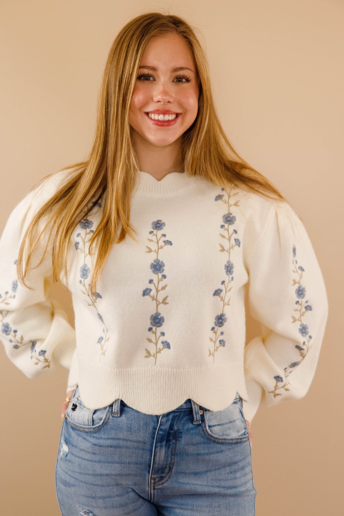Add a touch of charm to your wardrobe with the Another Day Sweater! This playful ivory sweater features a charming embroidered flower design on the front and down the sleeves. The scalloped neckline and hemline add an extra touch of whimsy. Soft and comfortable, this sweater is perfect for any day!