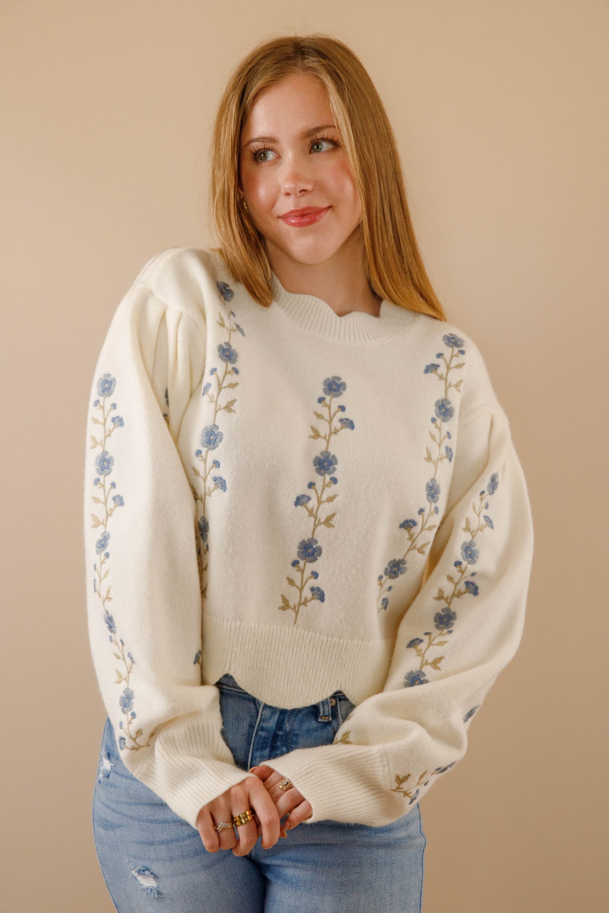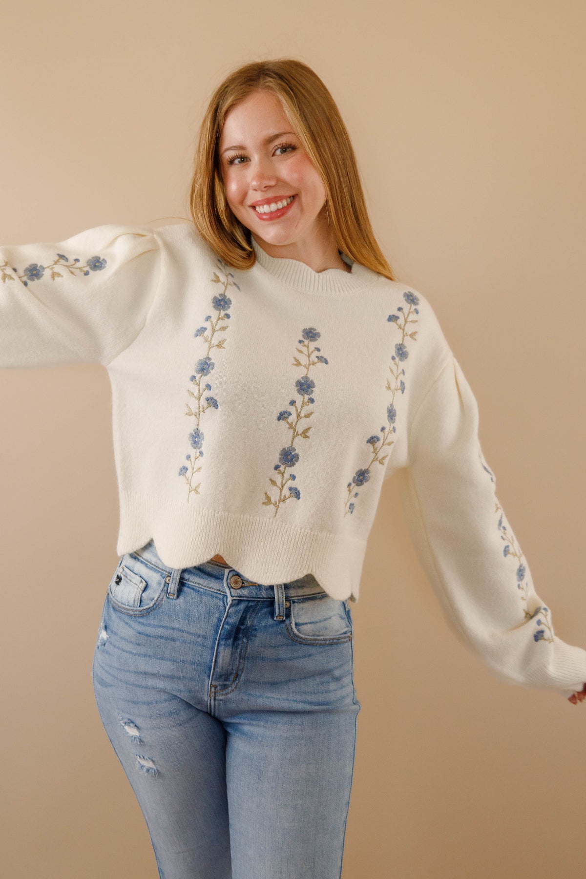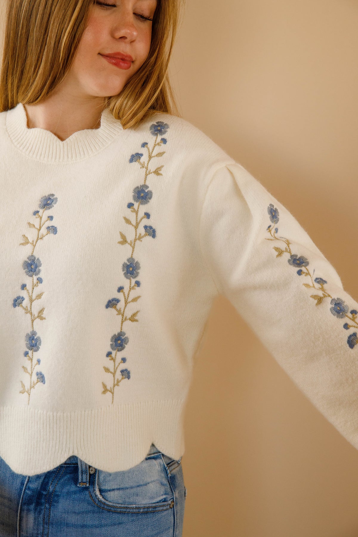 Ivory Scallop Sweater- Floral Embroidered Sweater- Women&