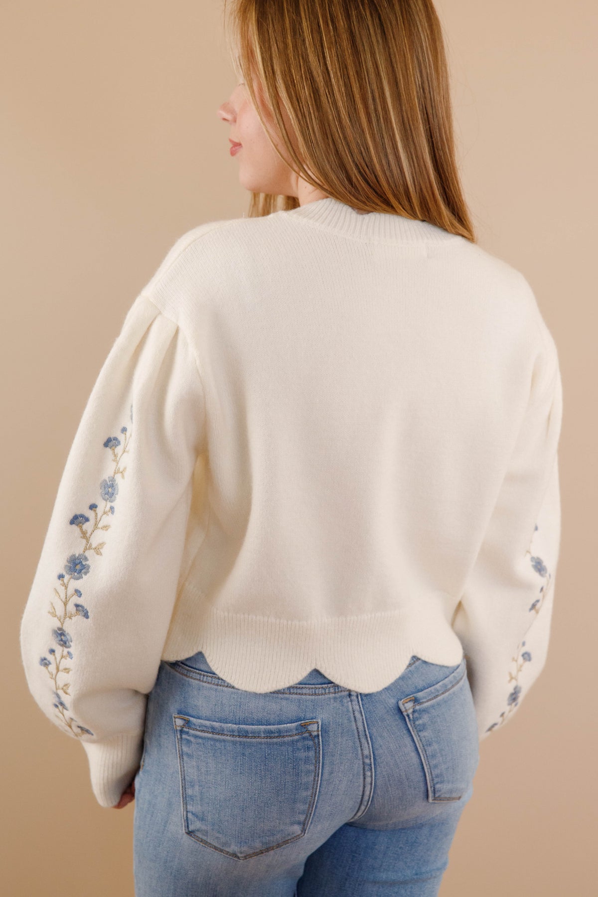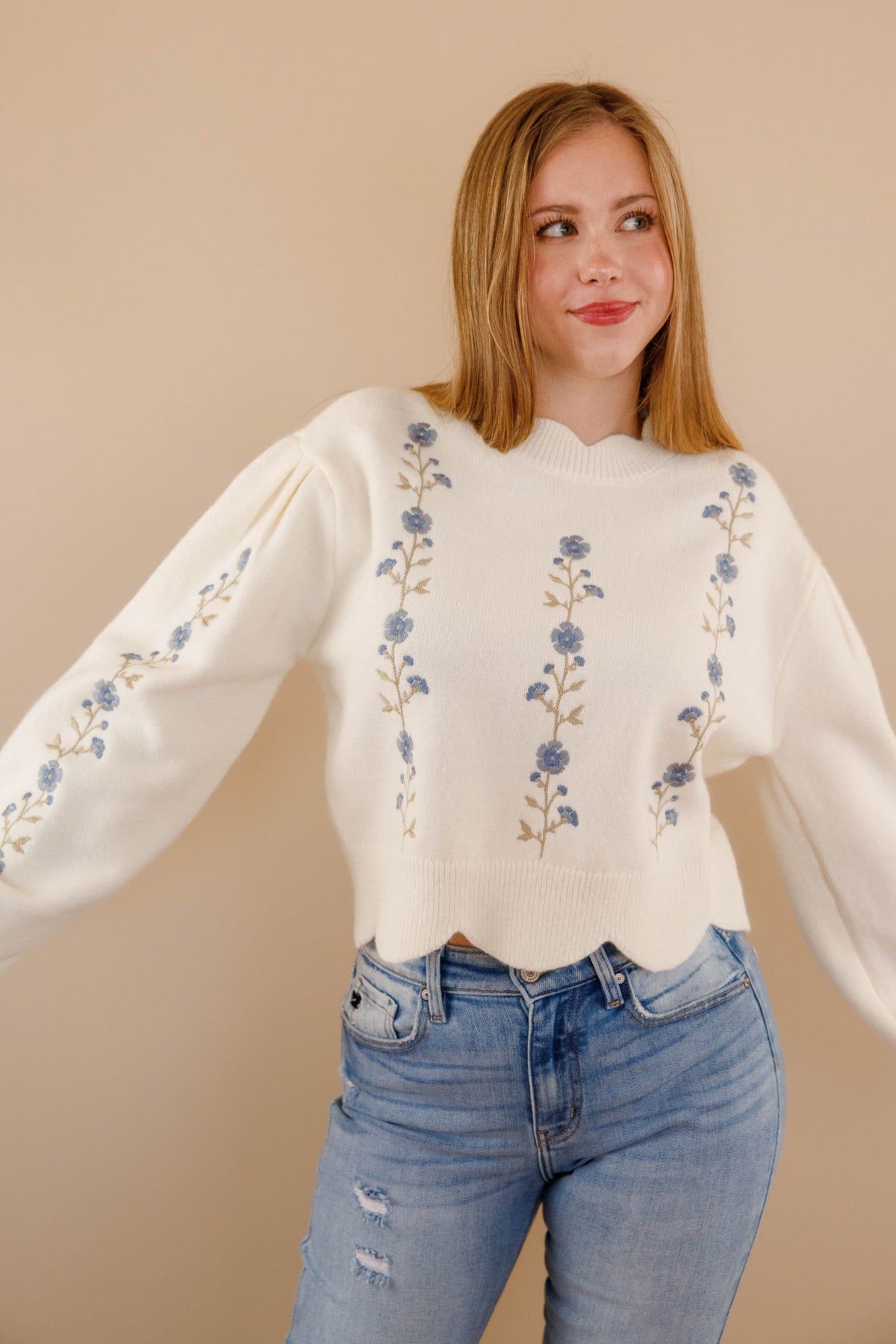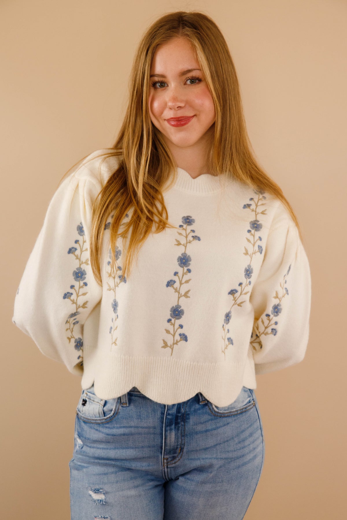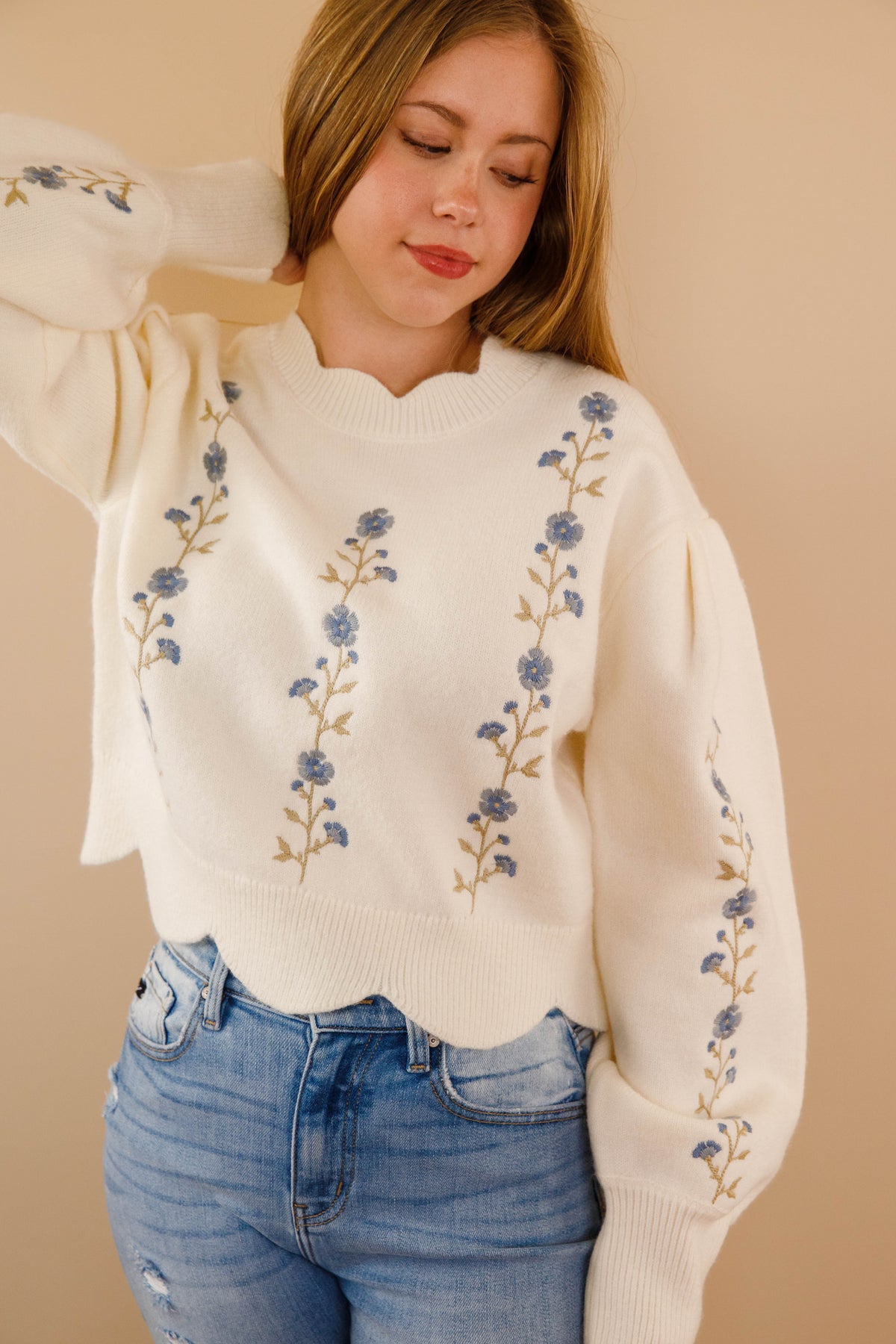 Ivory Scallop Sweater- Floral Embroidered Sweater- Women&