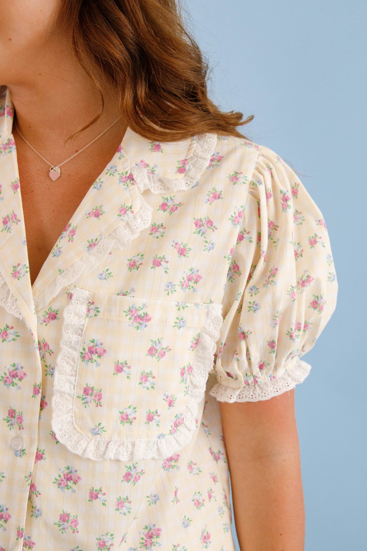 Slip into summer nights with our Dreaming Til Sunshine Pajama Top. The cheerful yellow and white gingham pattern adorned with delicate floral prints creates the perfect blend of playful and feminine. The practical button down style and front chest pocket adds convenience, while the eyelet-trimmed collar and short puff sleeves ensures style that lasts until morning. This top isn't just sleepwear—it's your ticket to sweet dreams and sunny dispositions!