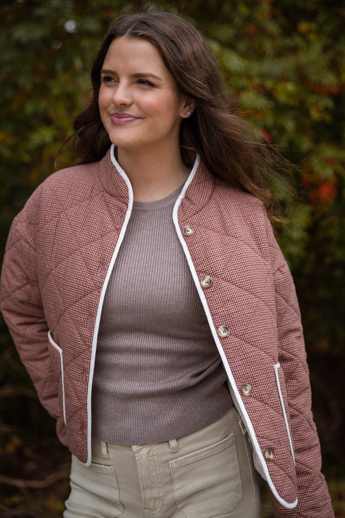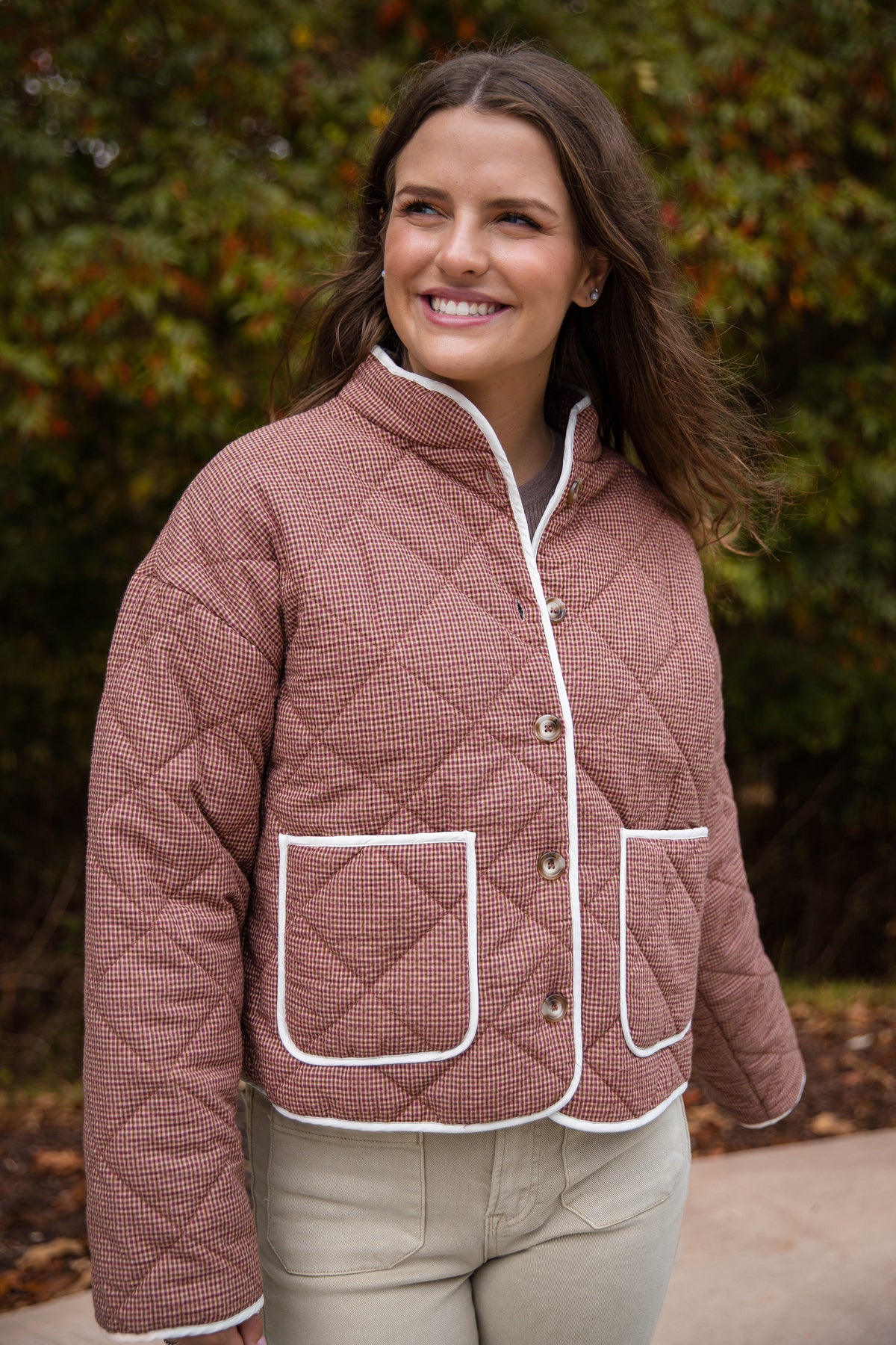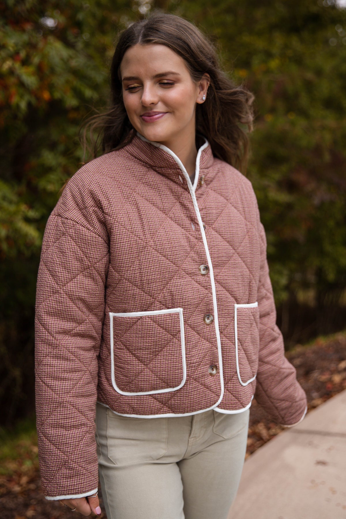 Stay cozy and chic all season long in our Micro Checker Print Button Down Quilted Jacket! This stylish fall layer features a classic micro-check pattern in warm neutral tones, detailed with contrast white trim and oversized front pockets for that perfectly polished finish. The quilted texture adds soft warmth without feeling bulky, making it the ideal throw-on piece for cool mornings and crisp evenings. Perfect for: Everyday wear, coffee runs, weekend markets, or layering for a polished outdoor look. Pair it with denim, corduroy pants, or leggings for a casual, effortlessly put-together fall outfit.