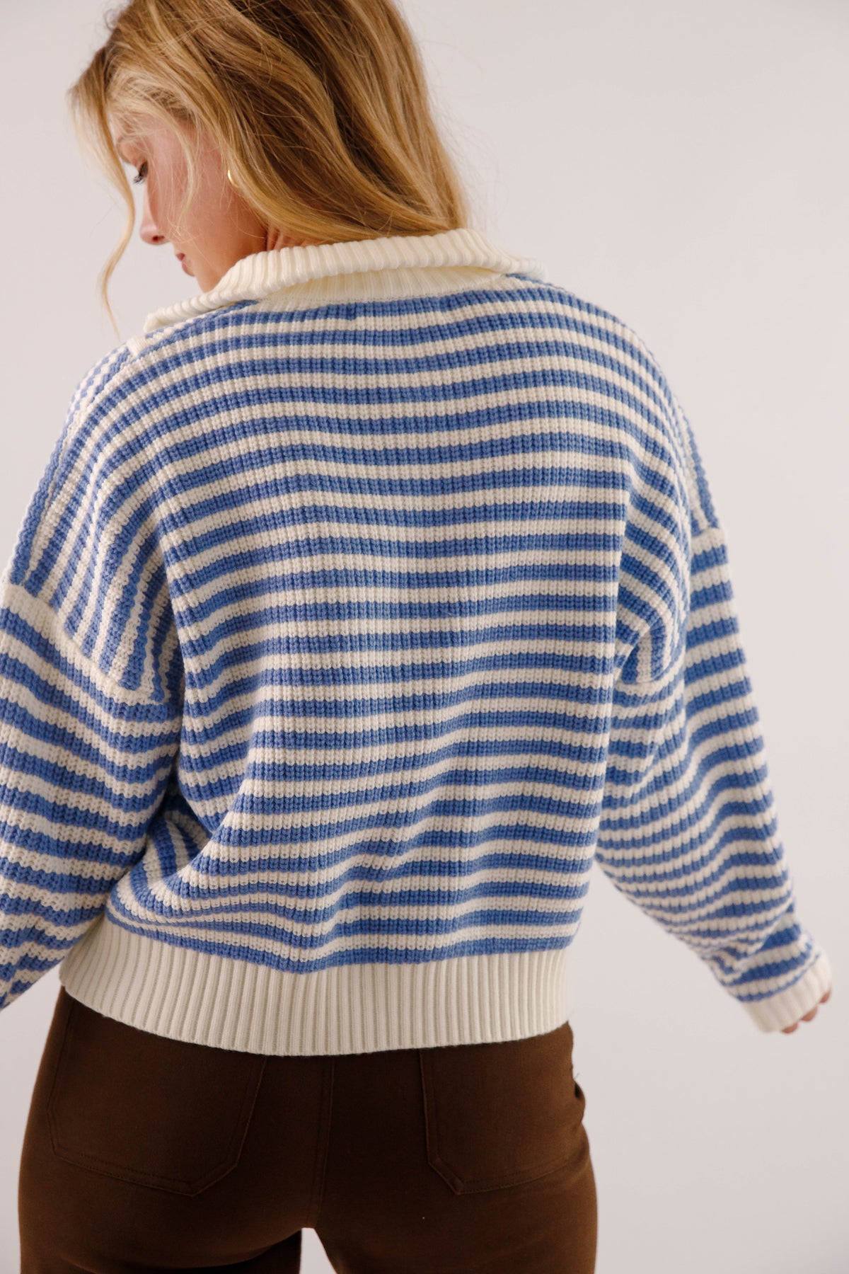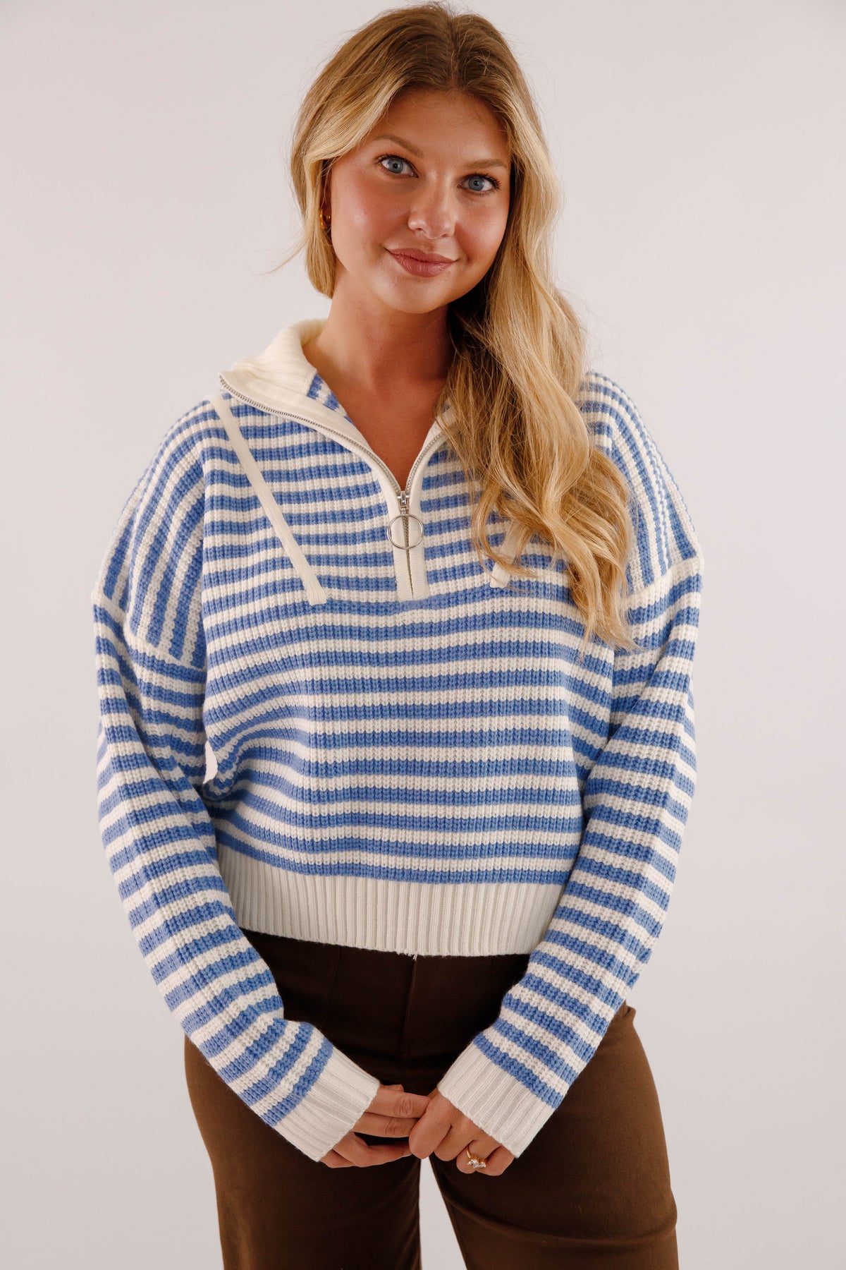 Embrace cozy elegance with the Giving Compliments Pullover, featuring a soft blue and cream chunky knit blend fabric. Its ribbed trim and mock turtleneck with a convenient zip offer warmth and stylish versatility, perfect for layering on chilly days. This pullover combines comfort with a flattering fit, making it an essential piece to elevate your casual wardrobe effortlessly.