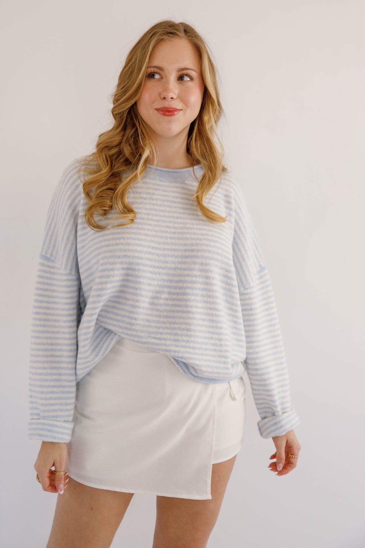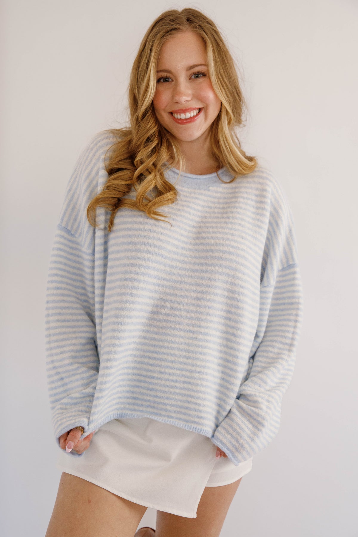 Refresh your wardrobe with this lightweight blue and white striped knitted sweater, designed for effortless everyday style. Crafted from a soft, breathable knit fabric, it offers all-day comfort without feeling heavy — perfect for layering in spring, summer evenings, or mild fall days. Featuring classic blue and white stripes, a relaxed fit, and a timeless crew neckline, this sweater pairs beautifully with jeans, shorts, or any work outfit.