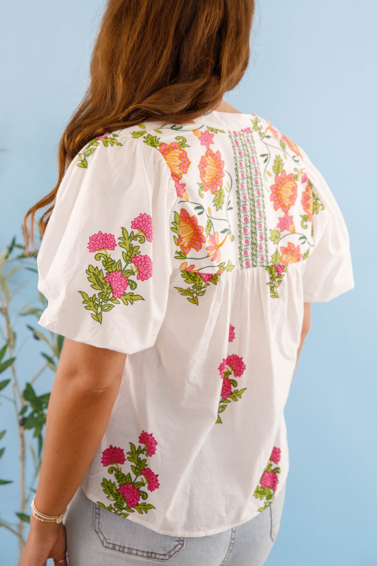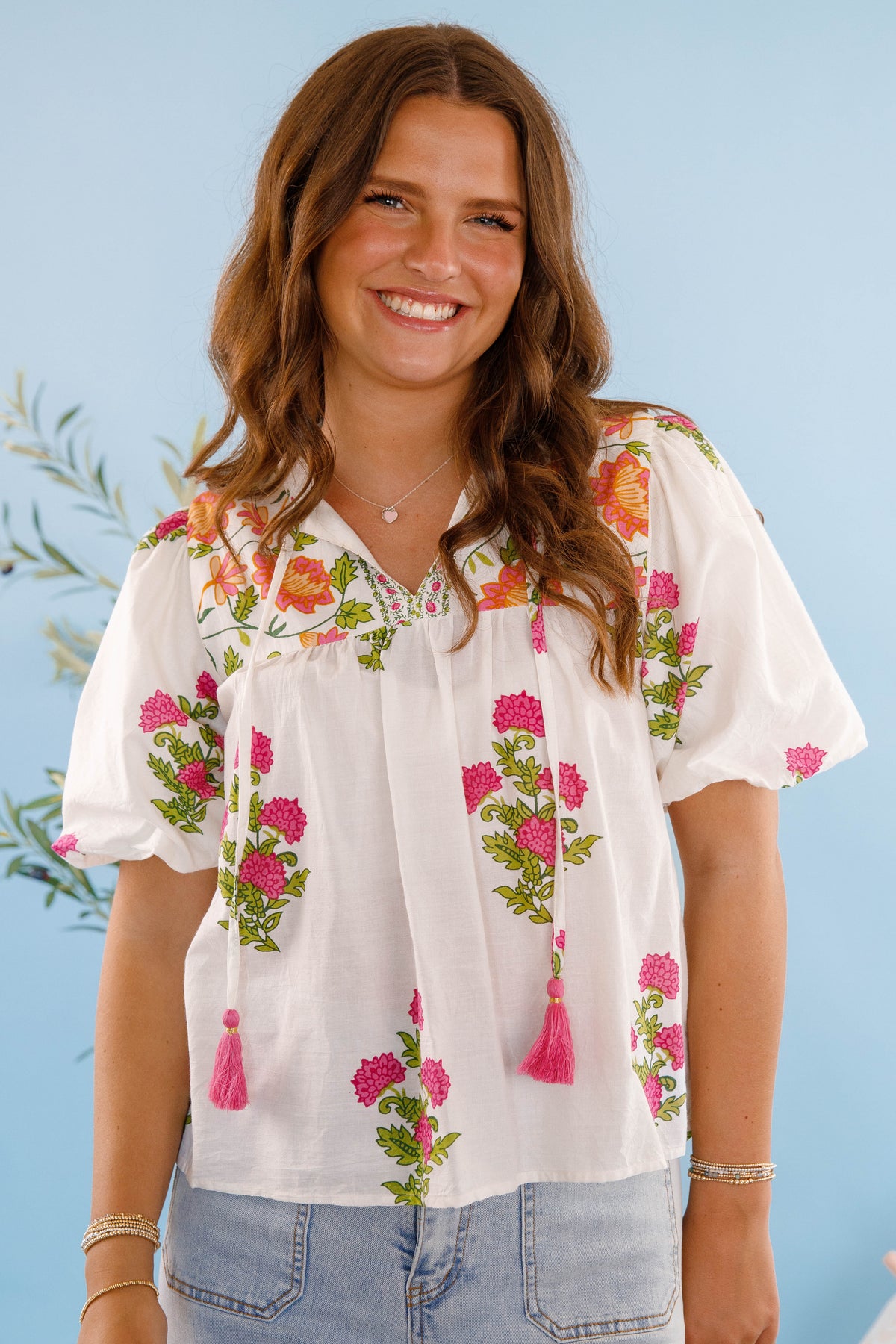 Be effortlessly stylish with our On The Move Blouse! This woven top features a beautiful floral print, a peasant tie neckline, and a flattering empire bust seam. The cinch puff sleeves add a touch of whimsy while the spring green hues bring a pop of color to your wardrobe. Perfect for any occasion!