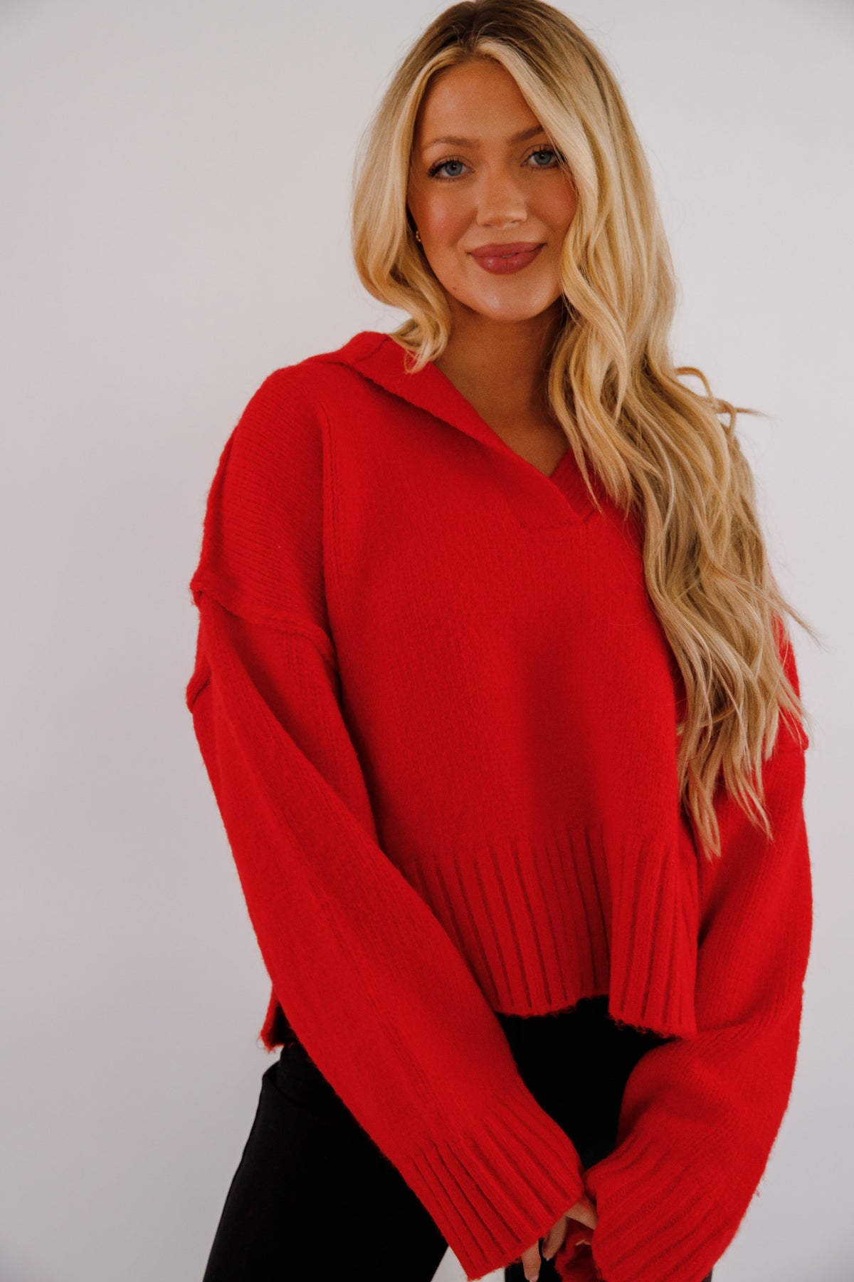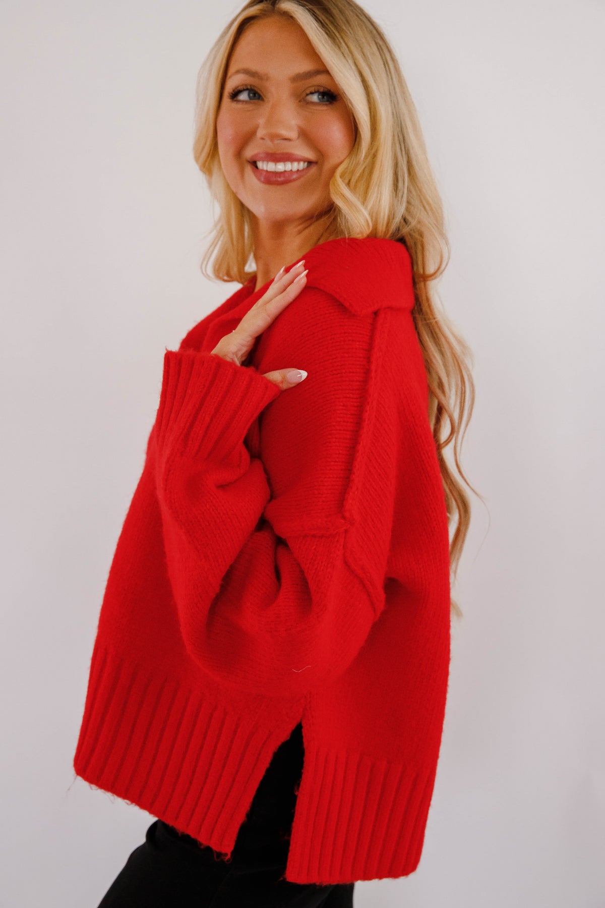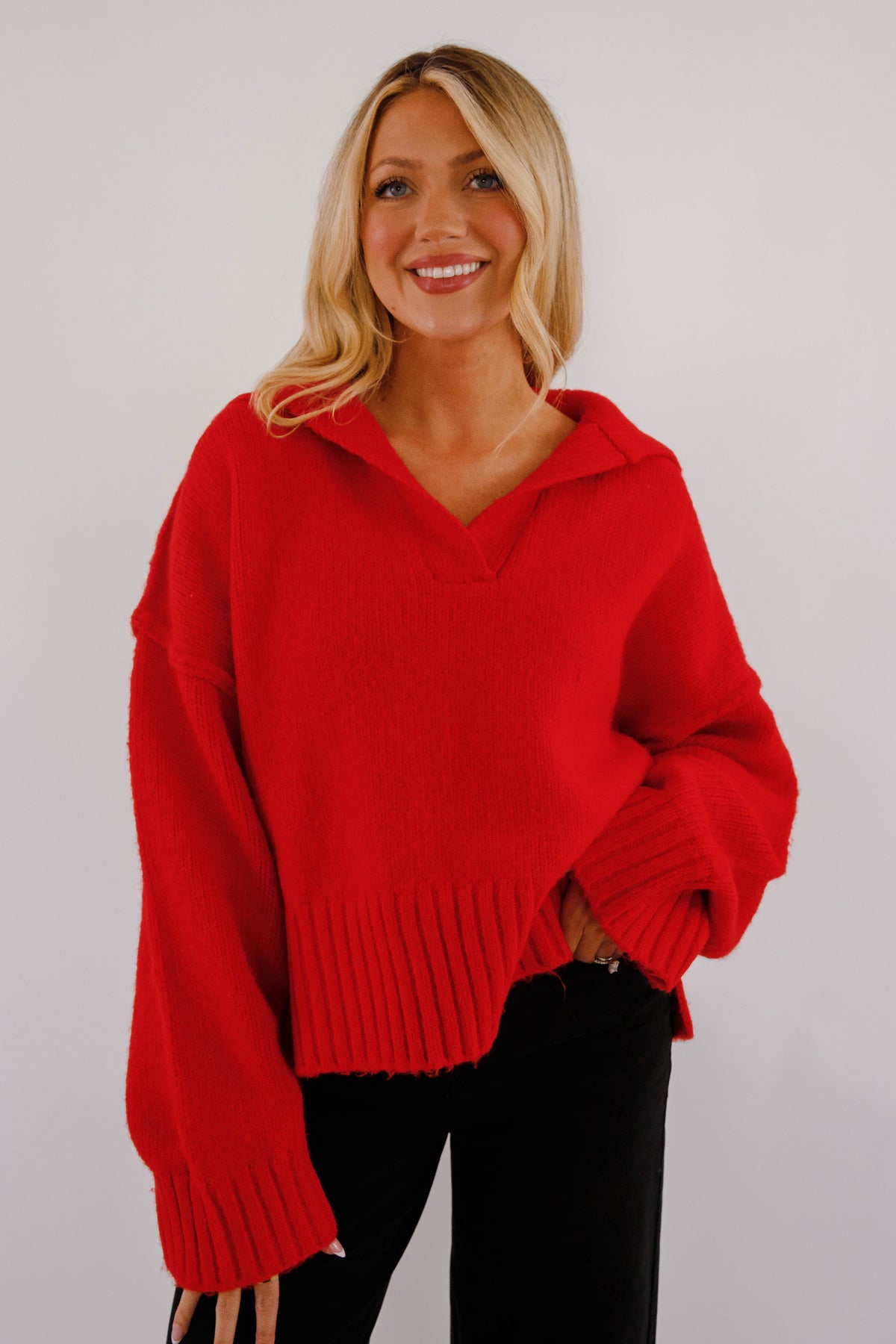 Experience comfort and style with the On The Other Side Sweater! This long sleeve sweater features a classic polo collar and ribbed trim for a polished look. Its soft, heavy knit fabric provides cozy warmth, while the relaxed, oversized boxy fit offers effortless layering and a modern silhouette. Perfect for cooler days, this sweater blends casual ease with subtle sophistication.