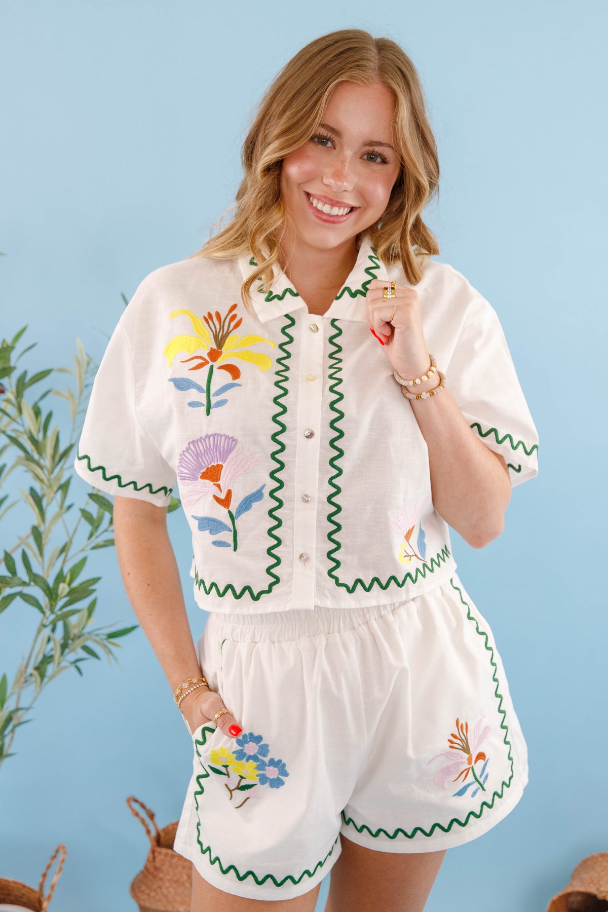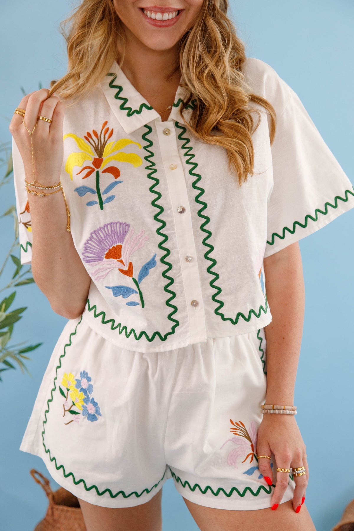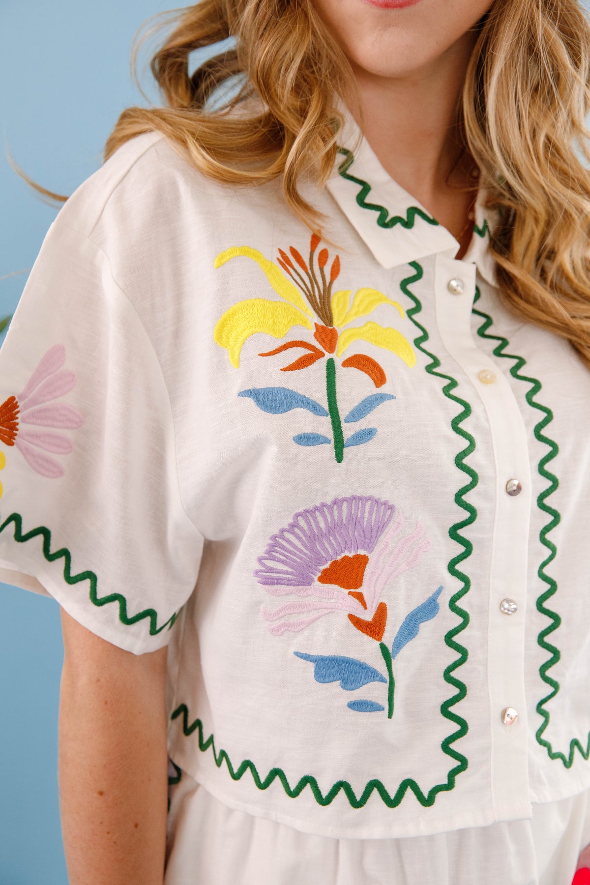 Unleash your summer style with our irresistible Summer Revival Button Down Top. This lightweight collared button down features bold embroidery. The slightly cropped silhouette defines your waistline while keeping you cool and comfortable all day long. Complete the look with the matching shorts, sold separately!