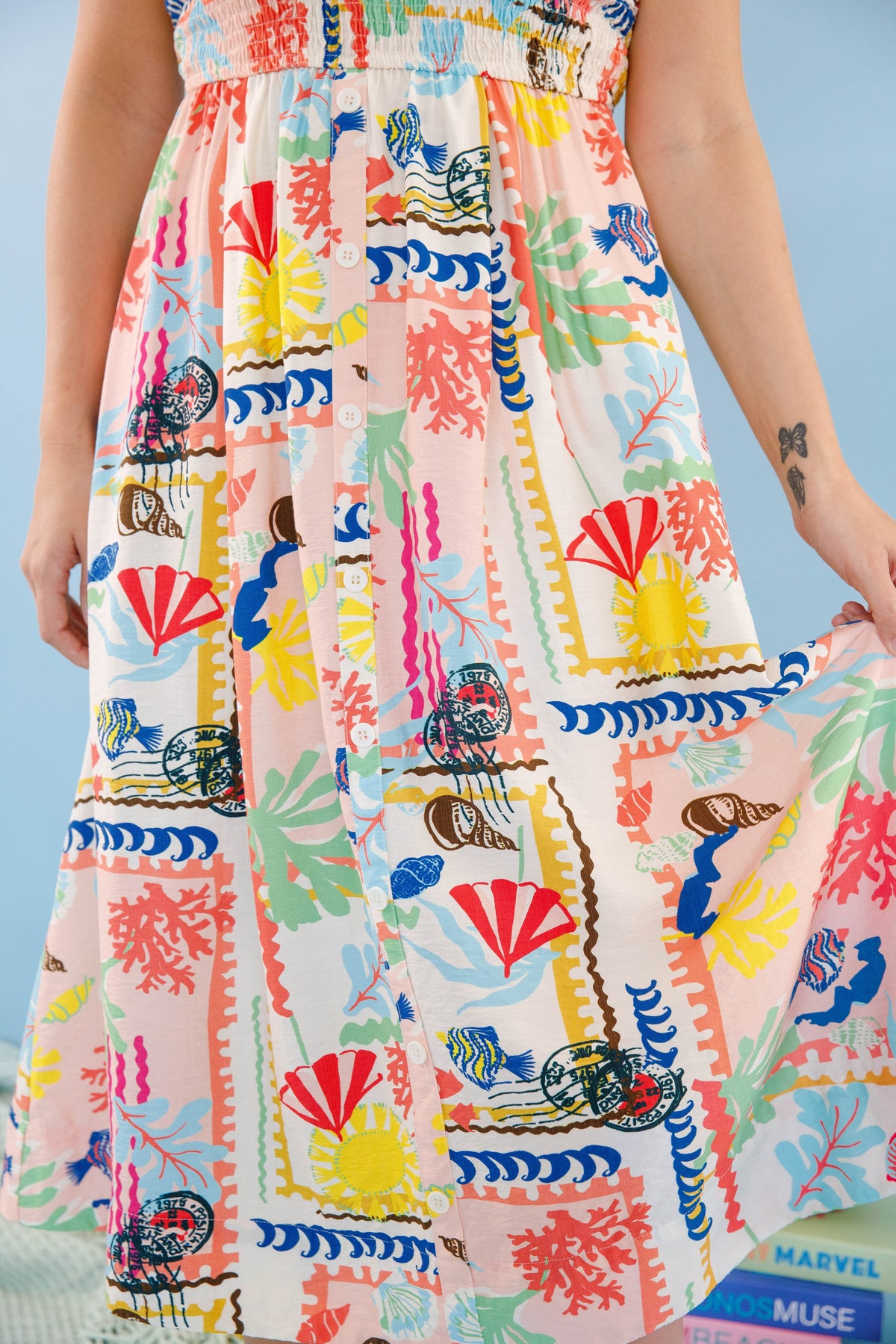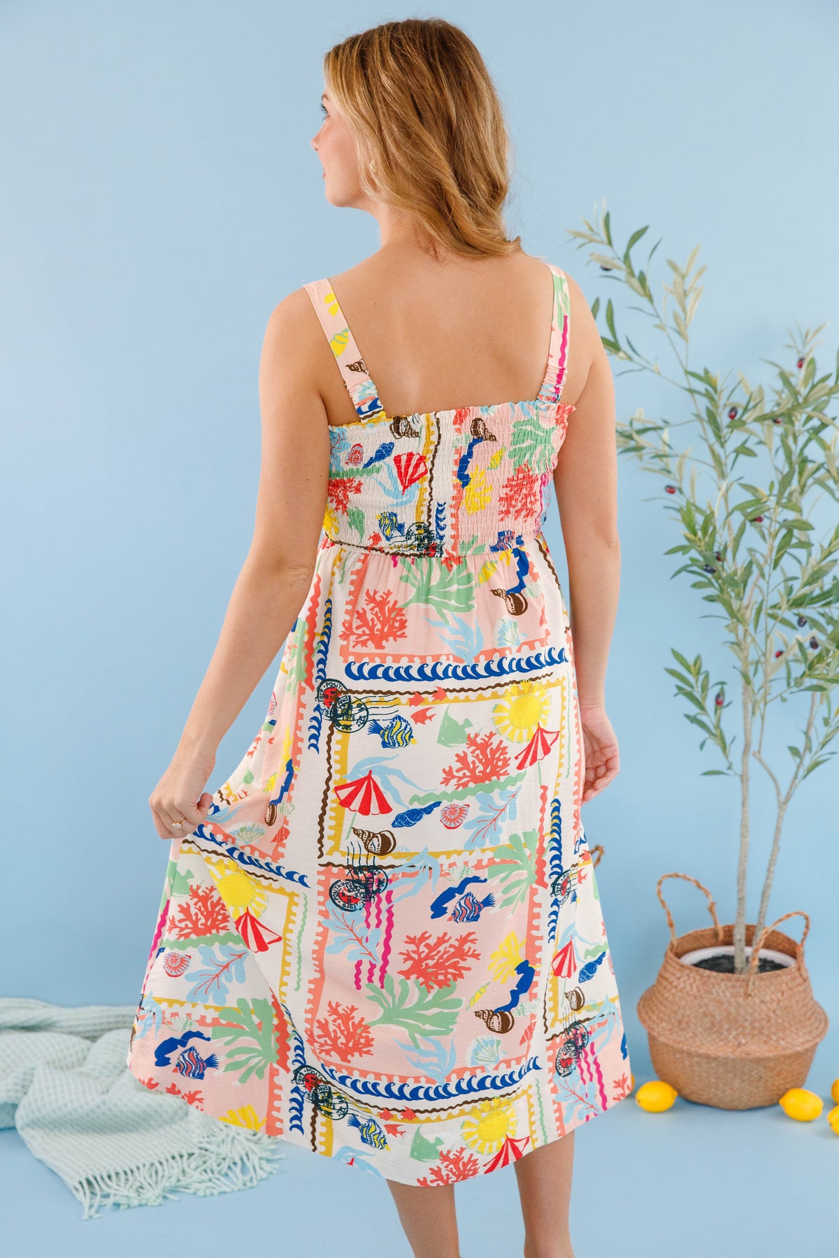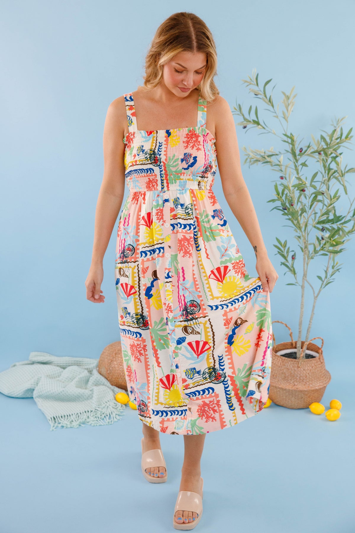 Experience pure joy in our Happiest I've Been Midi Dress. The charming beach print captures carefree summer vibes, while the smocked chest ensures a perfect, comfortable fit that flatters every figure. Decorative buttons cascade down the front, adding an elegant touch that elevates this dress from casual to captivating. This must-have piece will become your go-to for creating unforgettable summer memories.