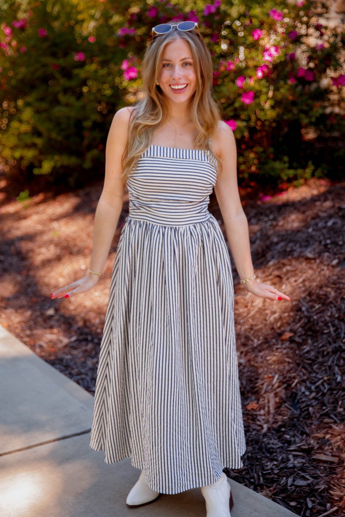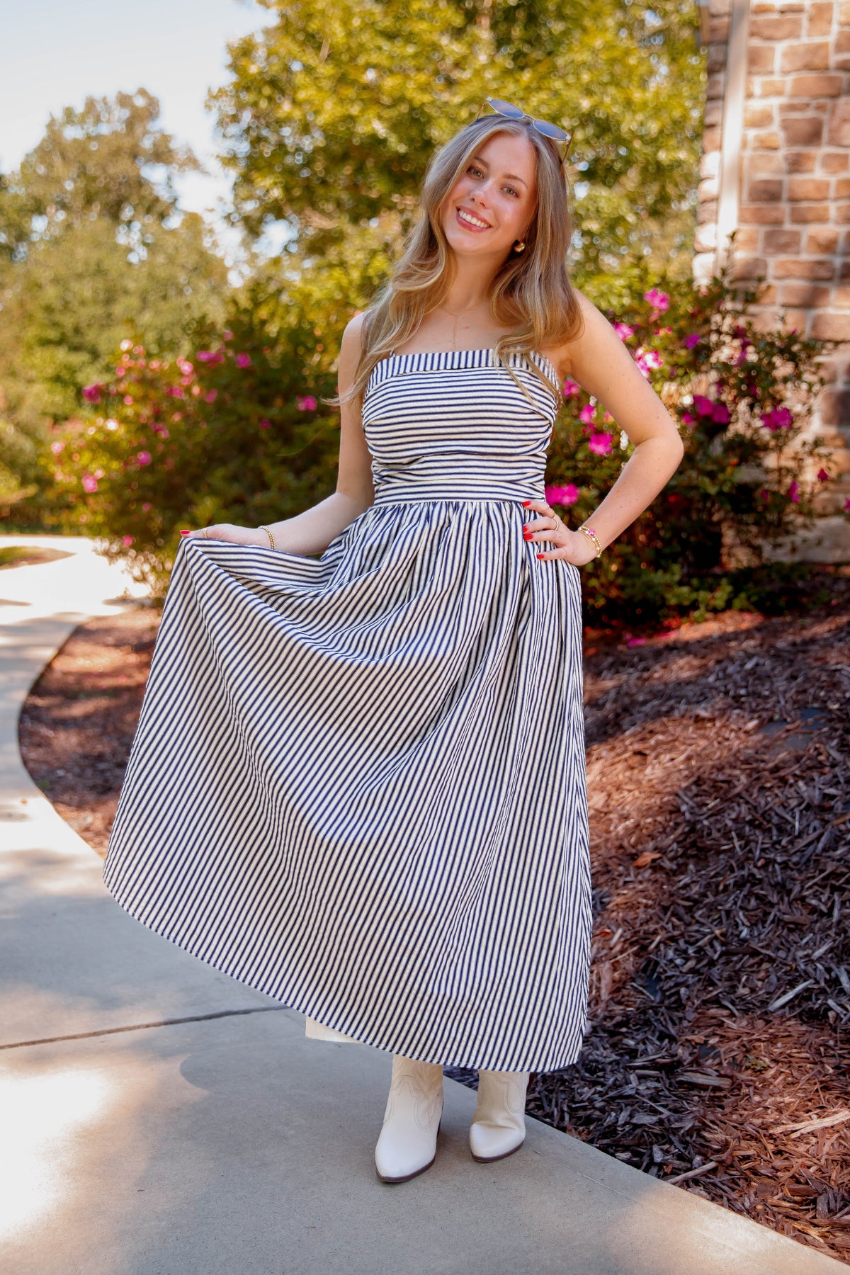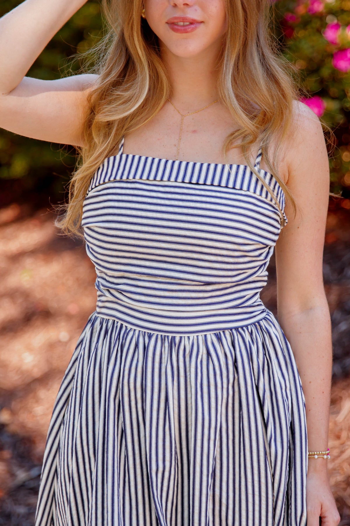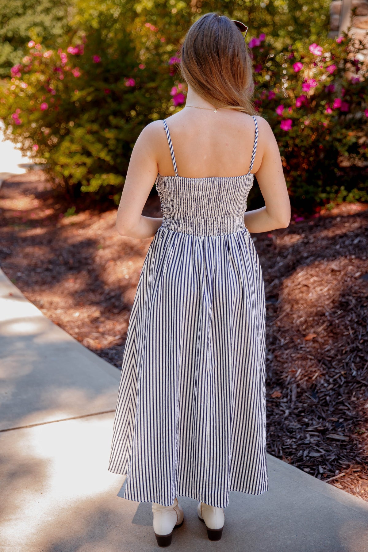 This navy and off white striped midi dress combines elegance with everyday ease. Featuring a soft square neckline and adjustable spaghetti straps and a smocked back, it offers a perfect fit tailored to you. The fitted ruched bodice highlights your silhouette, while the smocked back ensures comfort throughout the day. Enjoy the practicality of side pockets and the charming gathered skirt that flows beautifully with every step. Ideal for both casual outings and special occasions, this dress effortlessly blends style and functionality.