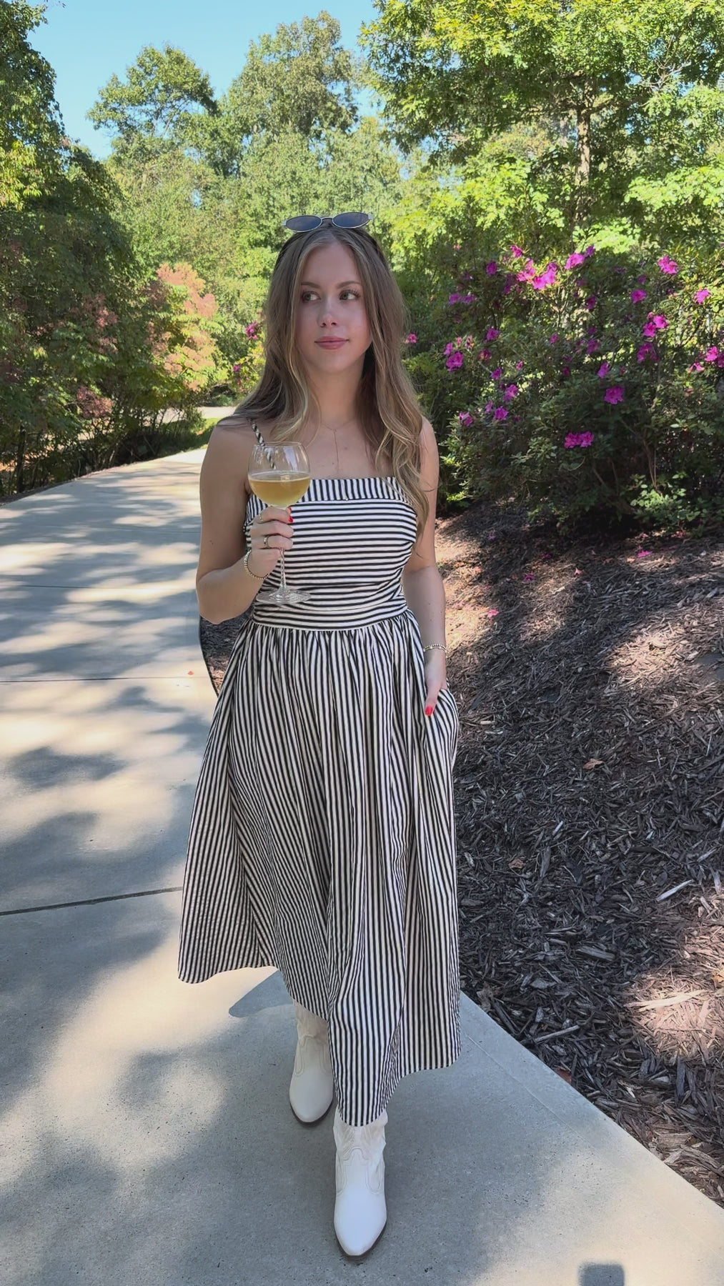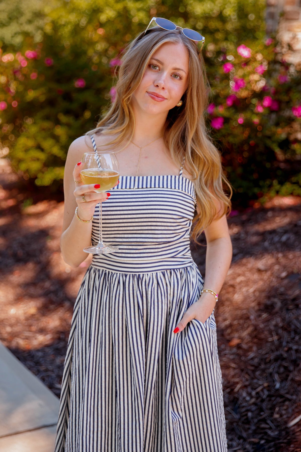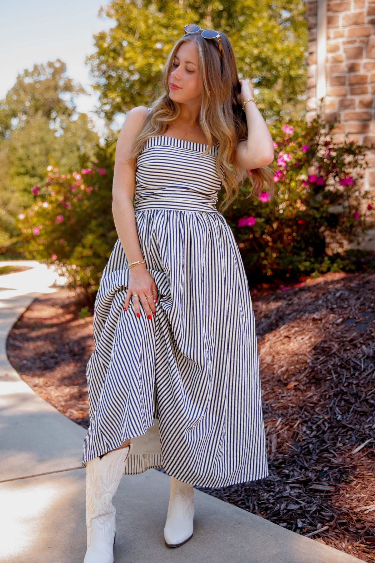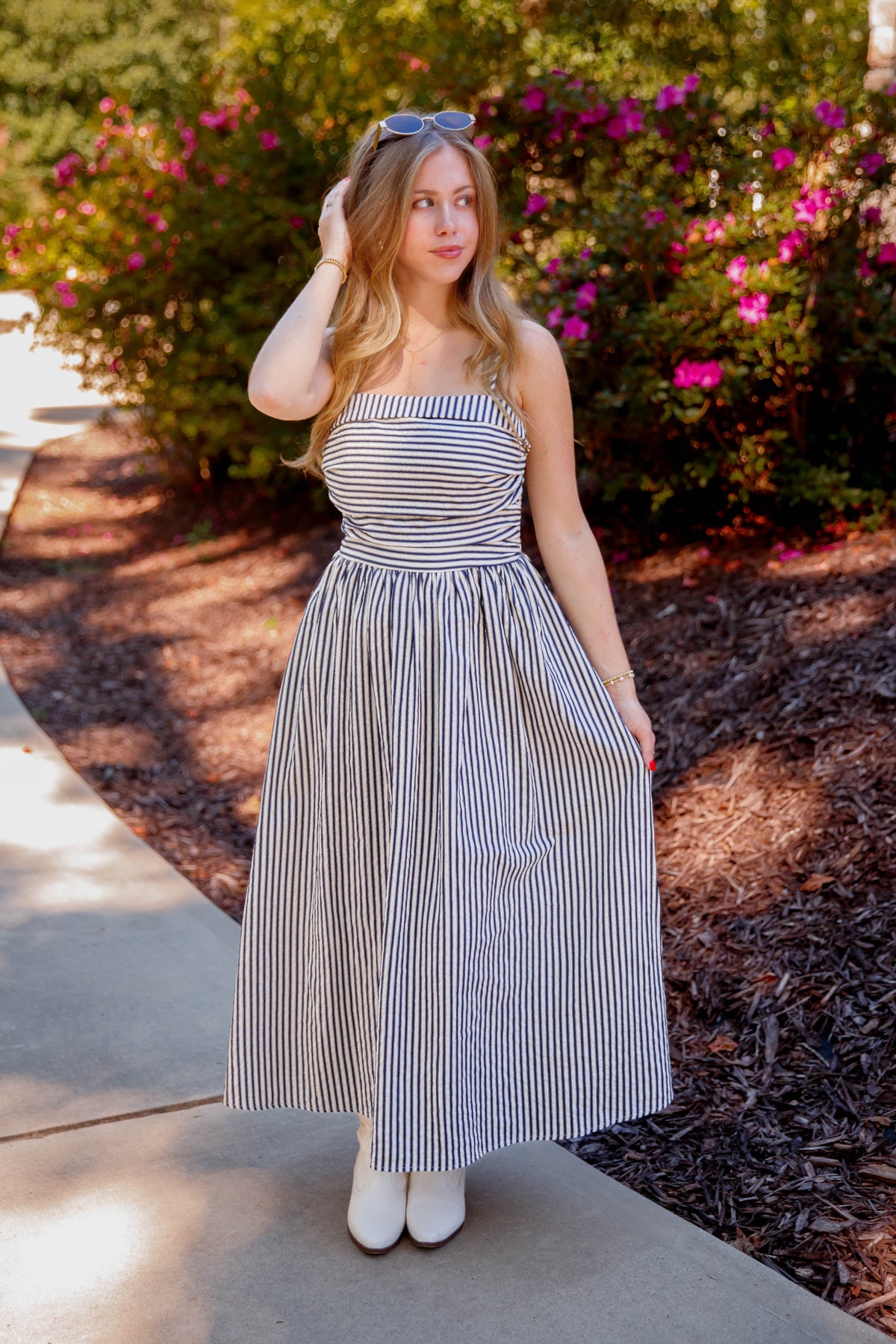 This navy and off white striped midi dress combines elegance with everyday ease. Featuring a soft square neckline and adjustable spaghetti straps and a smocked back, it offers a perfect fit tailored to you. The fitted ruched bodice highlights your silhouette, while the smocked back ensures comfort throughout the day. Enjoy the practicality of side pockets and the charming gathered skirt that flows beautifully with every step. Ideal for both casual outings and special occasions, this dress effortlessly blends style and functionality.
