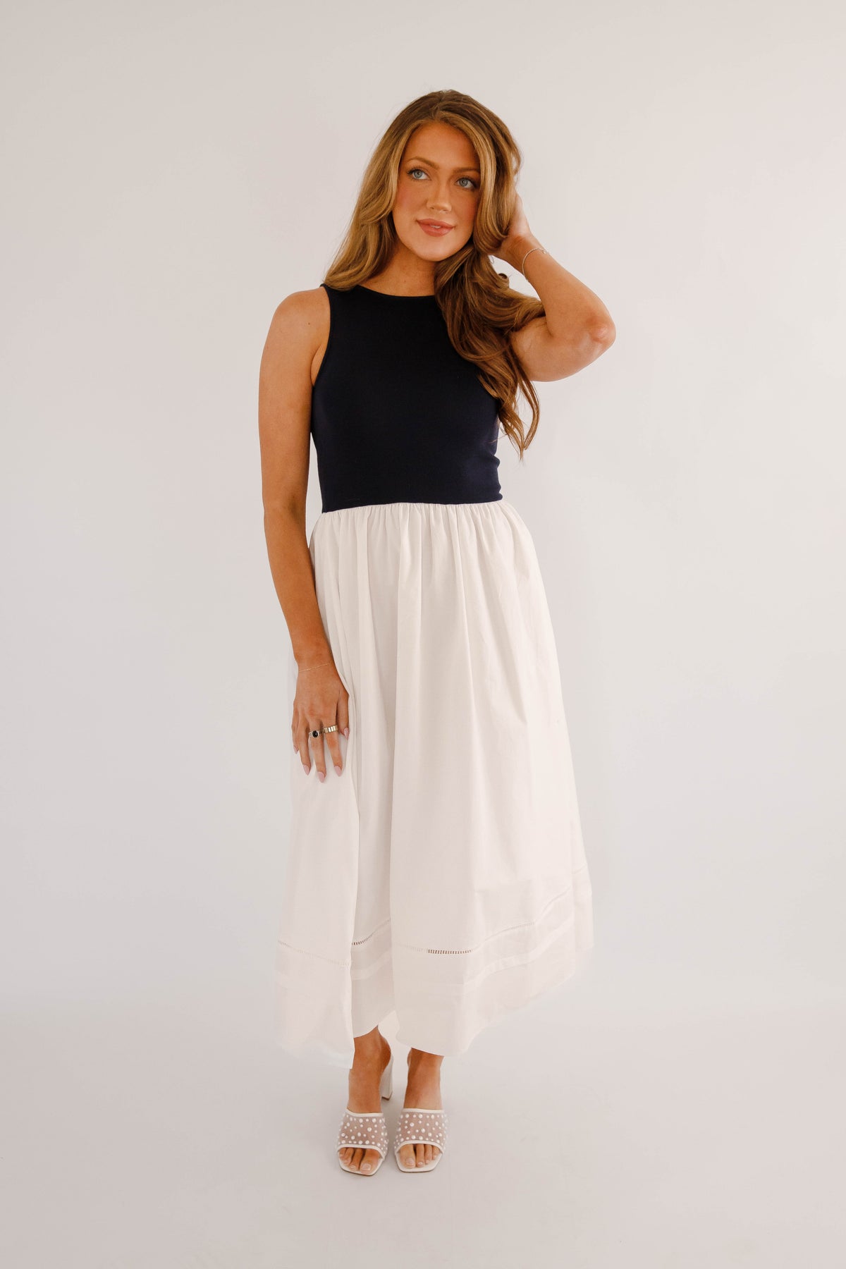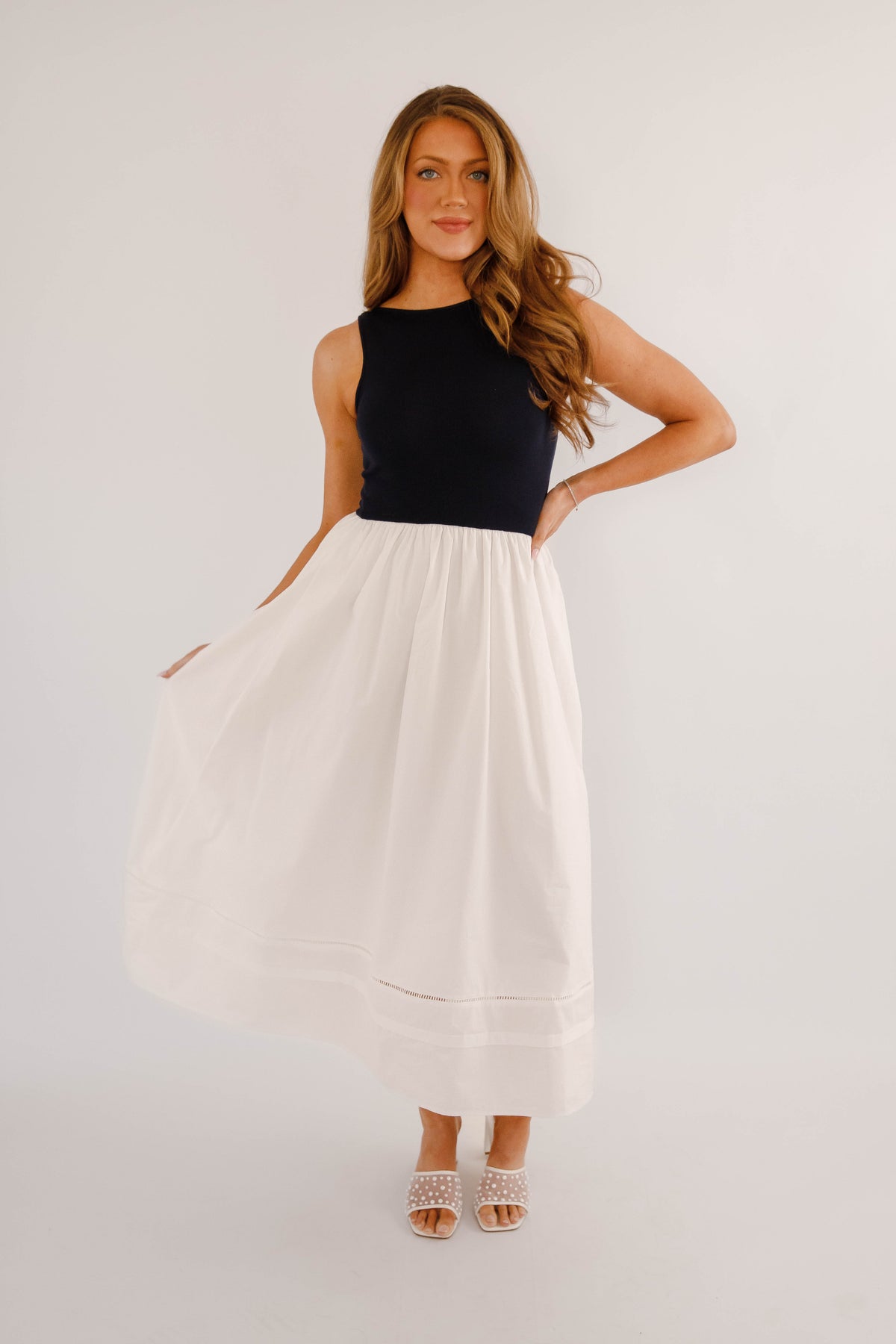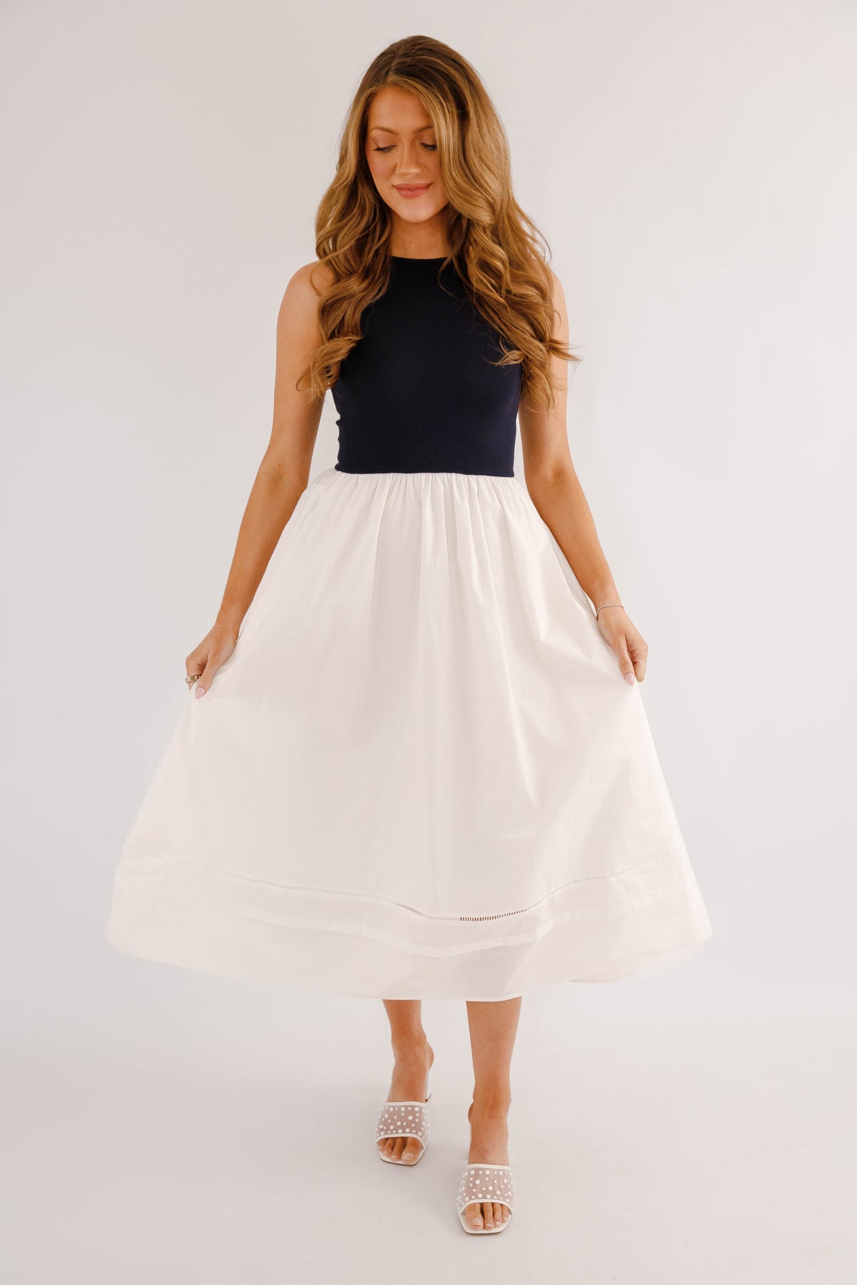 Timeless, chic, and effortlessly versatile, this navy and white colorblock midi dress is a modern wardrobe essential. Designed with a sleek sleeveless navy bodice and a flowing white midi skirt, this dress creates a flattering, elongating silhouette that transitions seamlessly from day to night. The top and waist do have stretch to them.