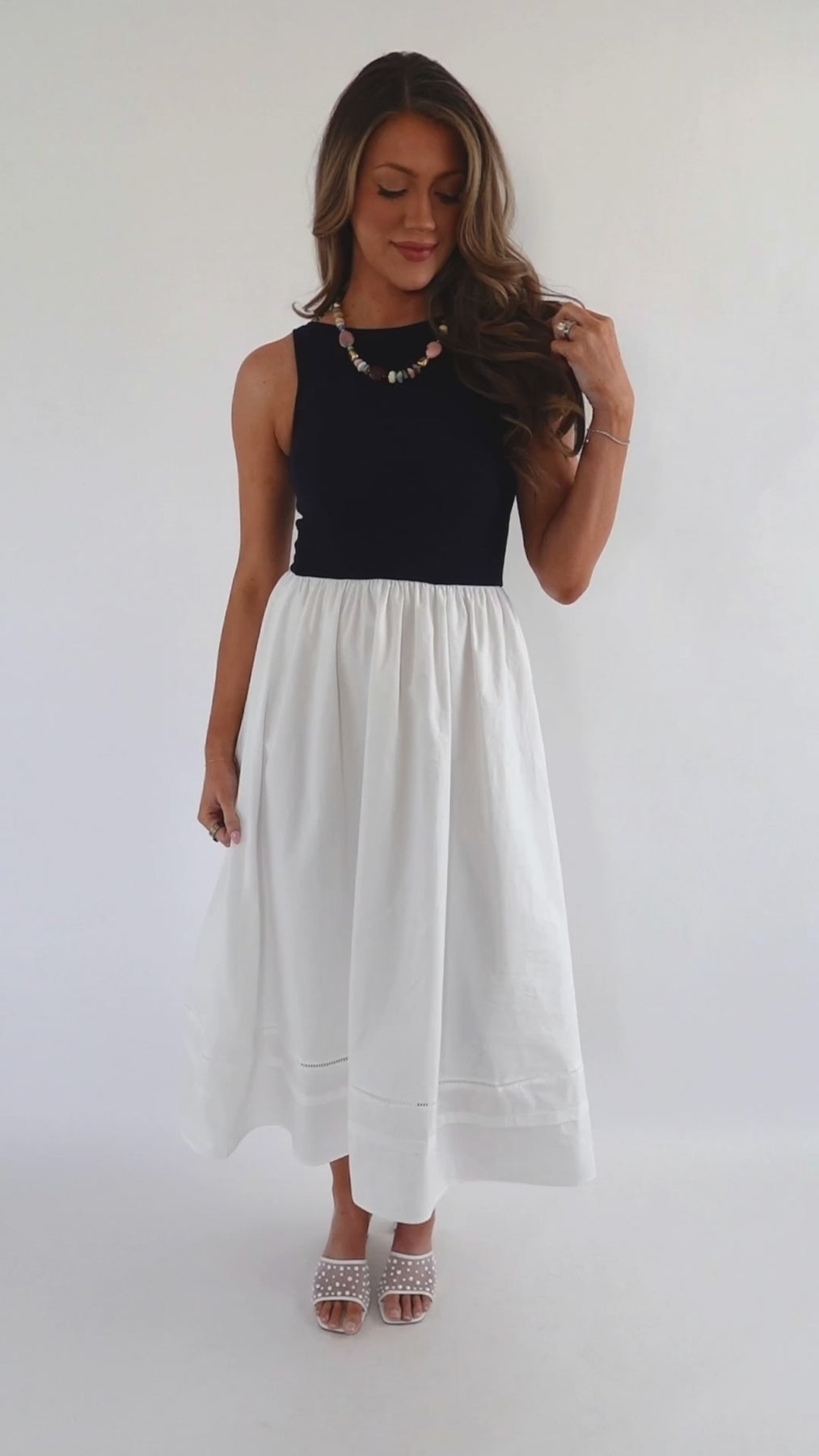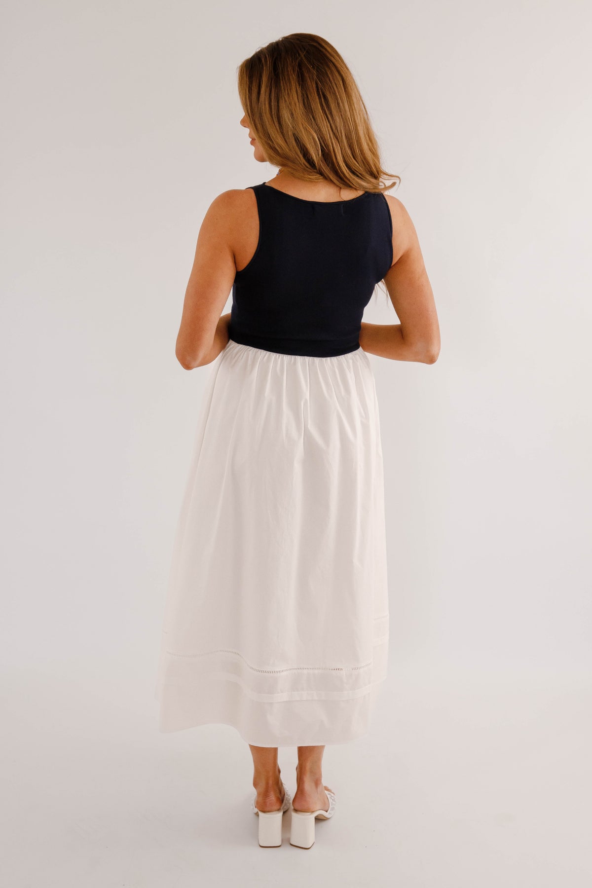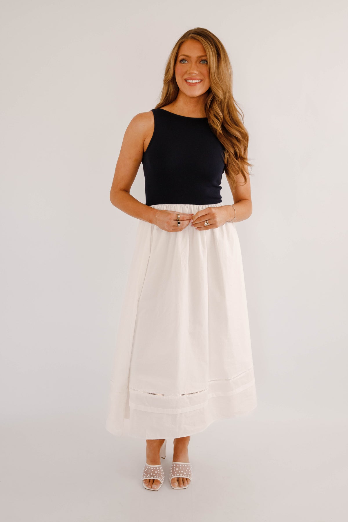 Timeless, chic, and effortlessly versatile, this navy and white colorblock midi dress is a modern wardrobe essential. Designed with a sleek sleeveless navy bodice and a flowing white midi skirt, this dress creates a flattering, elongating silhouette that transitions seamlessly from day to night. The top and waist do have stretch to them.