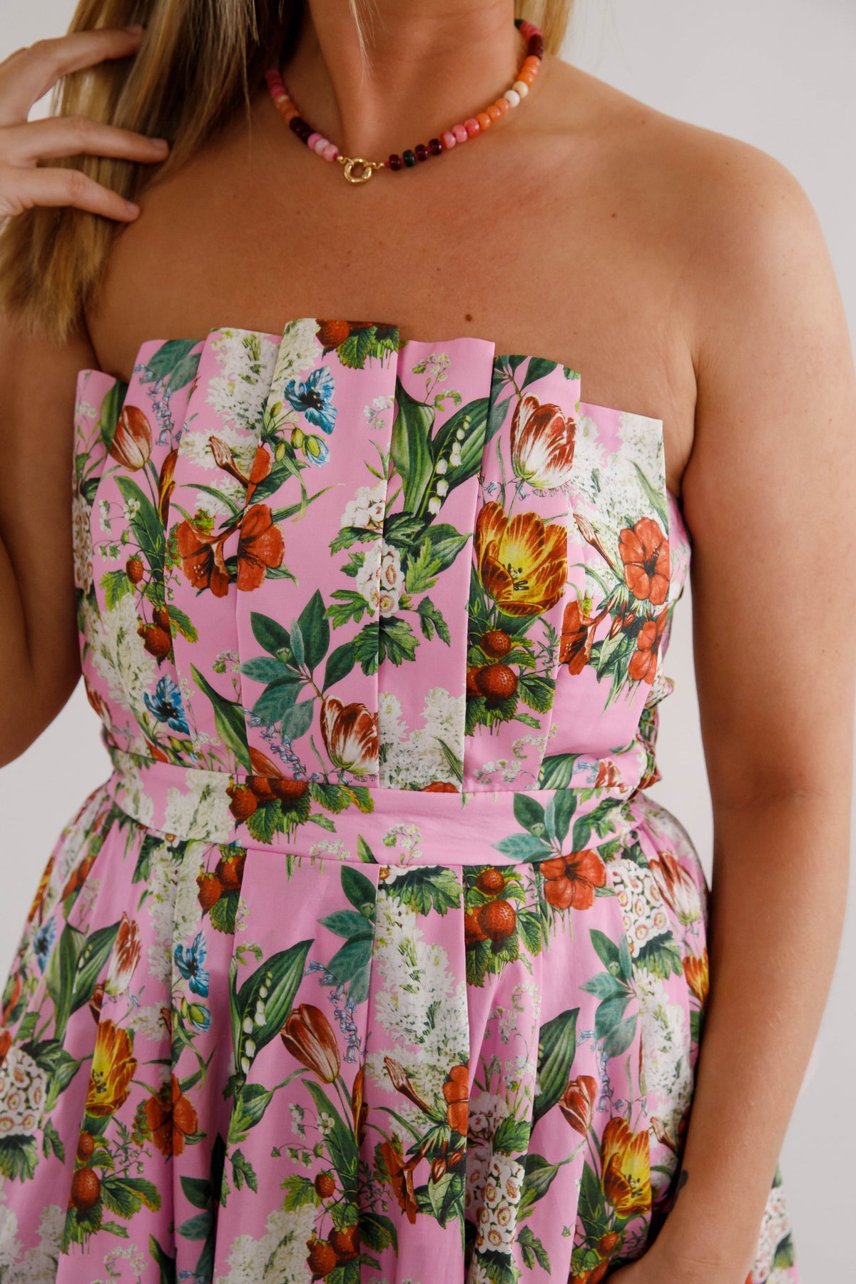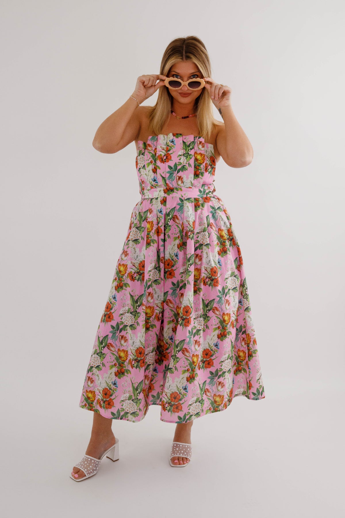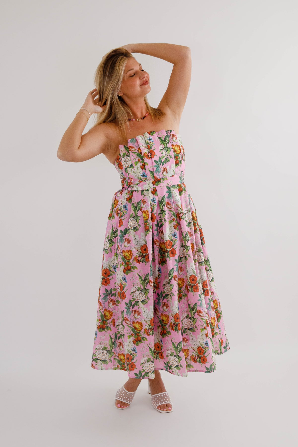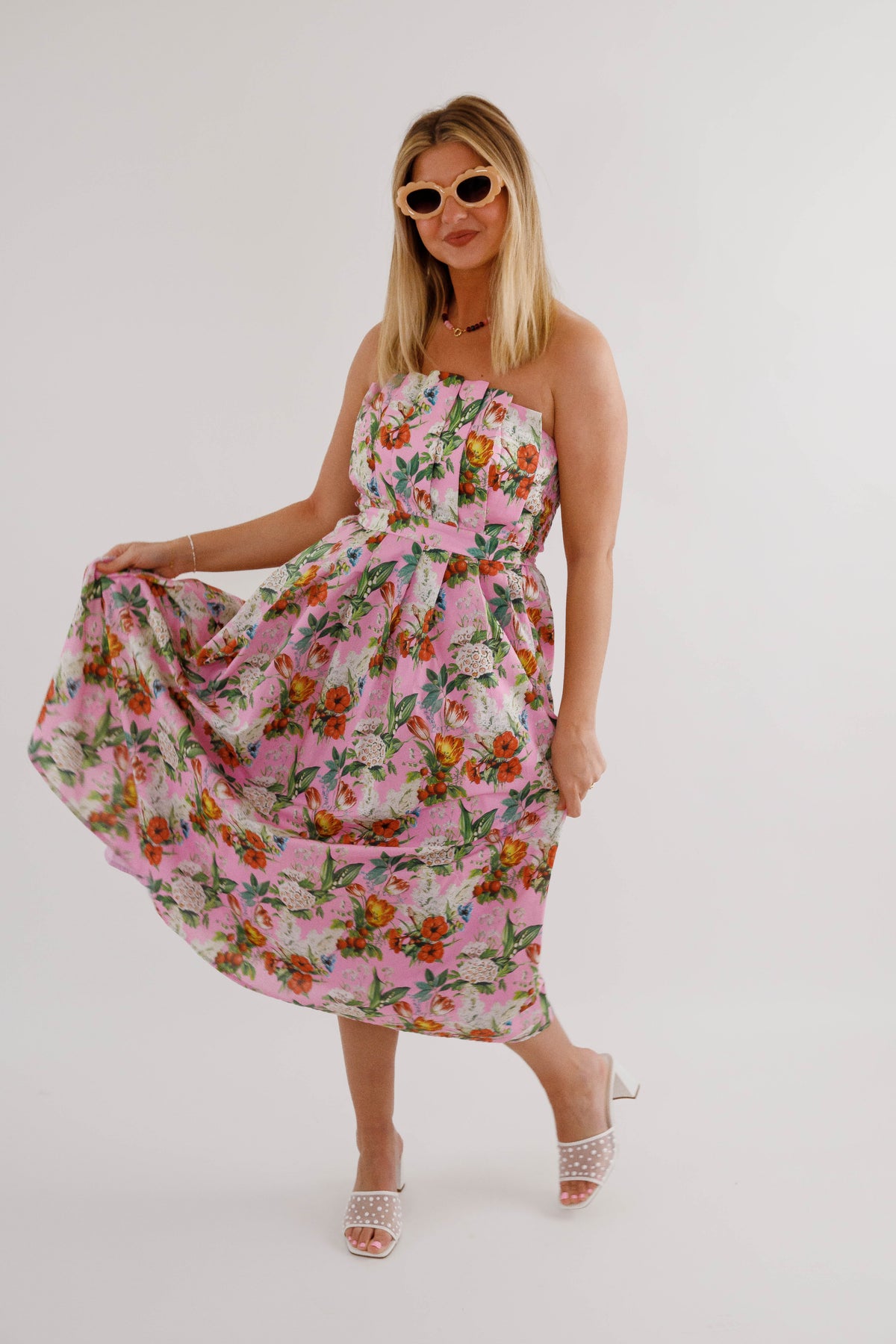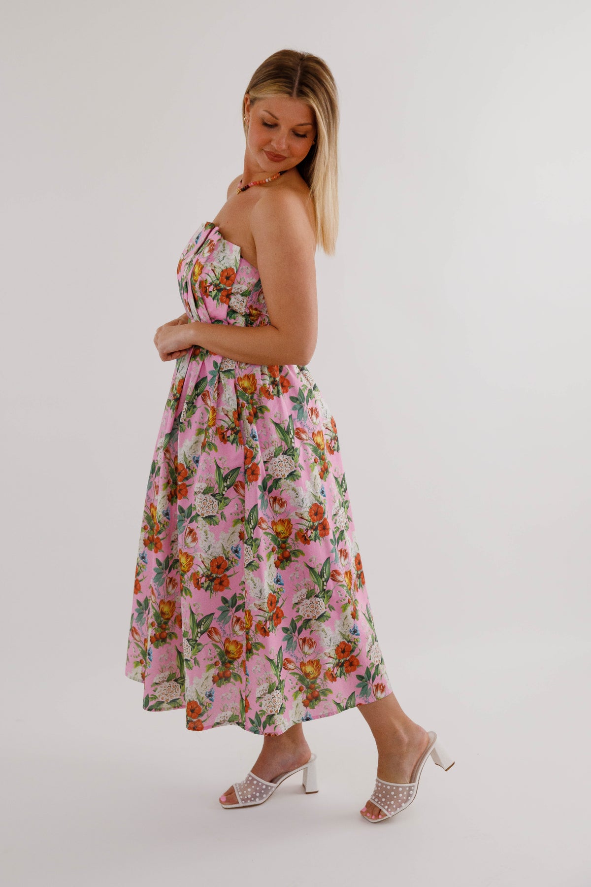 Make a lasting impression in this captivating floral midi dress that combines style with practicality! The strapless design paired with an elegant pleated neckline flatters every figure, while the smocked back detail adds dimension and movement. Hidden side pockets provide convenient storage without disrupting the silhouette, and the secure back zipper ensures a polished finish. Constructed from substantial woven fabric with complete lining, this non-sheer piece delivers confidence and comfort all day long. A versatile investment piece that transitions seamlessly from brunch to evening events!