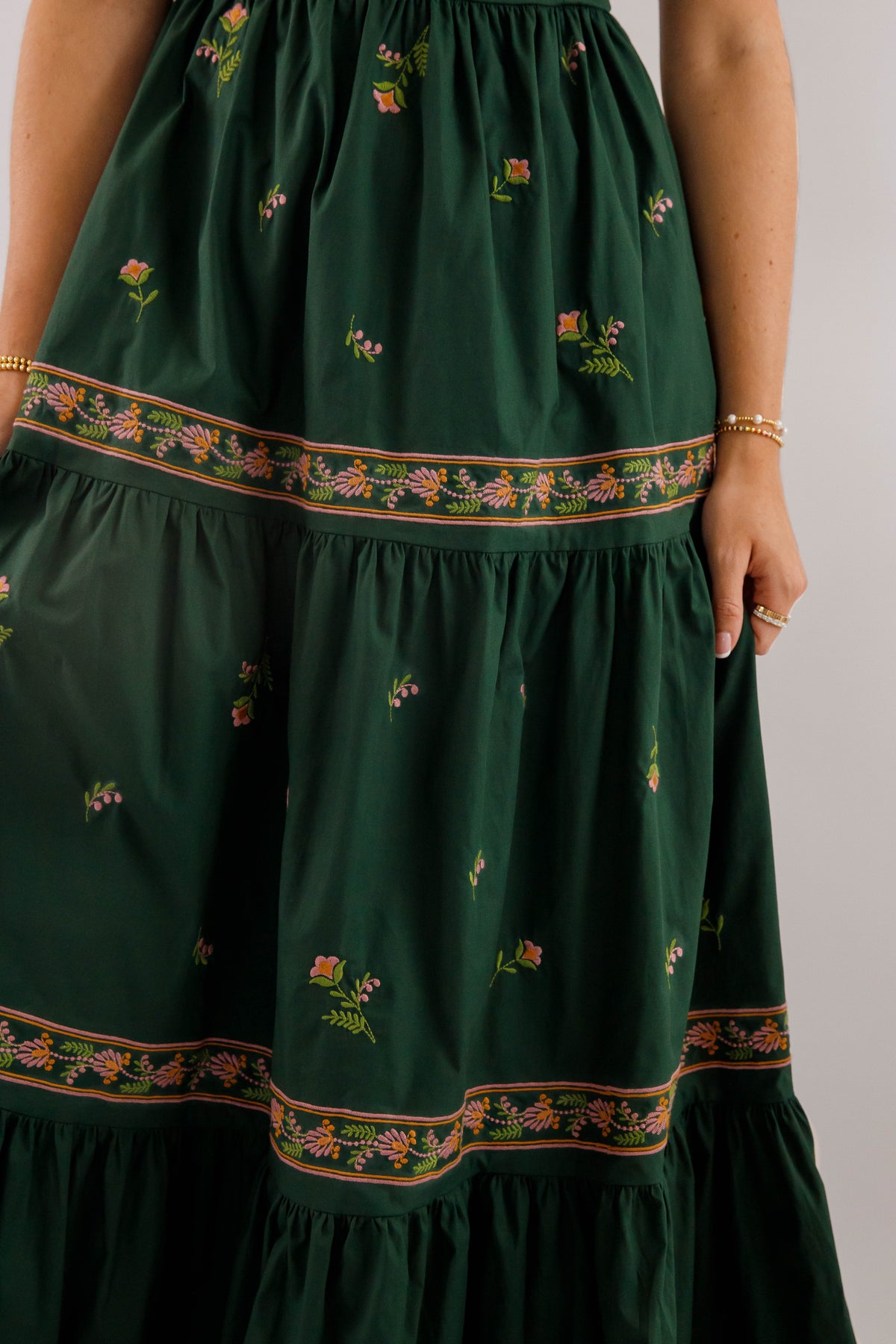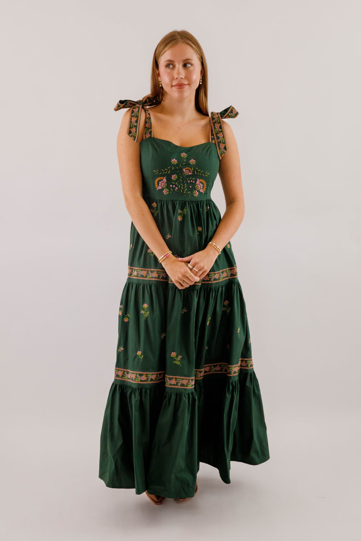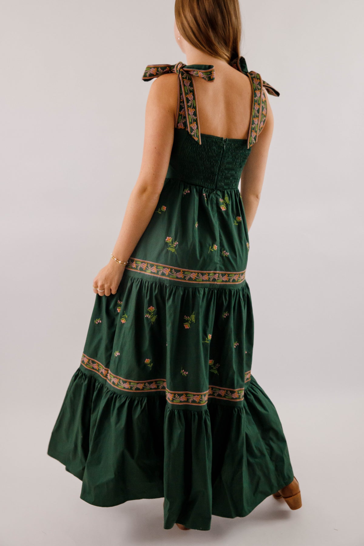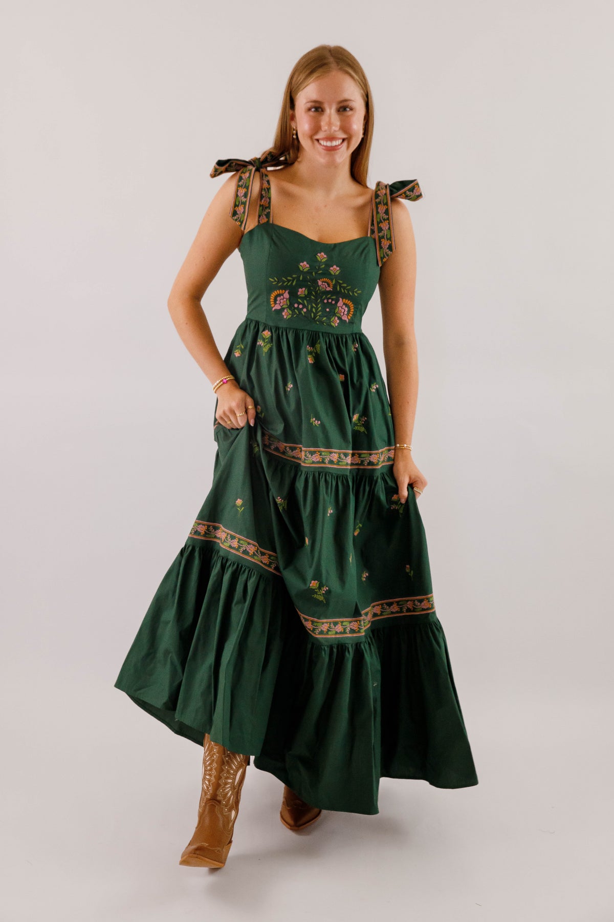 The A Feeling of Gratitude Maxi Dress in hunter green is a playful blend of comfort and style. Tie the embroidered straps to your perfect fit, enjoy the flattering sweetheart neckline, and appreciate the smocked back that moves with you. A hidden back zipper keeps the look sleek, while the detailed embroidery throughout adds a fun, whimsical touch. Perfect for twirling through sunny days or special nights!
